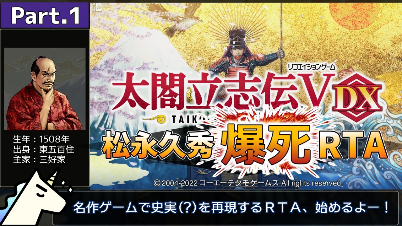 RTA第18弾は2004年発売、光栄が開発・販売した戦国シミュレーション『太閤立志伝5』<br>そのイベント【松永久秀爆死】イベントを完遂するまでRTAです。<br>今回は2022年にリマスターされたDX版で走ります。<br><br>久しぶりの史実再現RTA。<br>今動画は二部構成で、前半でゲーム、後半で松永久秀の生涯を解説し、梟雄&爆死伝説が生まれた理由についても考察します。<br><br>前作【GB】エアロスター →<a href="https://www.nicovideo.jp/watch/sm45438275" class="watch">sm45438275</a><br>part.2→<a href="https://www.nicovideo.jp/watch/sm45745360" class="watch">sm45745360</a>(12/20 21:00公開)<br><br>Kerbal Space Programムン往還 →<a href="https://www.nicovideo.jp/watch/sm41752471" class="watch">sm41752471</a><br>大航海時代Ⅲ 奴隷貿易 →<a href="https://www.nicovideo.jp/watch/sm42595837" class="watch">sm42595837</a><br><br>走ったRTAのpart.1まとめ→<a href="https://www.nicovideo.jp/mylist/73222388" target="_blank" rel="noopener">mylist/73222388</a><br>RTA全部まとめ→<a href="https://www.nicovideo.jp/mylist/72786007" target="_blank" rel="noopener">mylist/72786007</a><br><br><u>▽レギュレーション</u><br>タイマー開始:初期設定画面で『決定』を押した瞬間<br>タイマー停止:久秀爆死イベントで『ズガーン!』の字幕が表示された瞬間<br><br><u>▽その他縛りなど</u><br>・イベント【将軍弑逆】を発生させる<br>・バグ技禁止<br>・初期画面でのスキル&能力値、および武将編集機能の使用禁止<br>・追加札の使用は可<br><br>〇Twitter(現:X)→@Nagisa381rta<br>〇Youtube→<a href="https://www.youtube.com/@nagisa381rta" target="_blank" rel="noopener nofollow">https://www.youtube.com/@nagisa381rta</a><br>〇FANBOX→<a href="https://nagisa381.fanbox.cc/" target="_blank" rel="noopener nofollow">https://nagisa381.fanbox.cc/</a><br>〇欲しいものリスト<br>→<a href="https://www.amazon.jp/hz/wishlist/ls/1S72L30BVRILK?ref_=wl_share" target="_blank" rel="noopener nofollow">https://www.amazon.jp/hz/wishlist/ls/1S72L30BVRILK?ref_=wl_share</a><br><br>©コーエーテクモゲームス<br><br><a target="_blank" href="https://qa.nicovideo.jp/faq/show/19424?site_domain=default" style="font-size: 13px;color: #657586; text-decoration: underline; line-height: 1.4">この動画は投稿者によって修正されました</a>