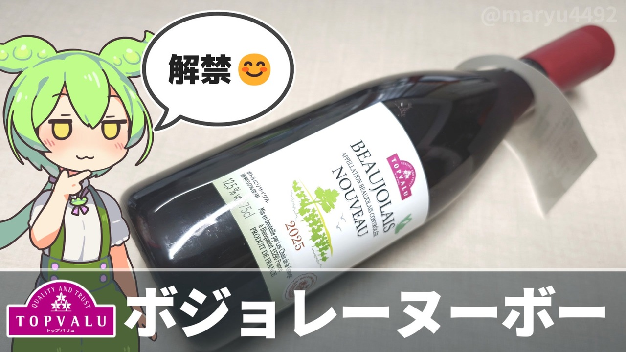 11月の第3木曜日はボジョレーヌーボーの解禁日<br>イオンでもトップバリュとして輸入しており<br>どんな味なのか買ってみることにしました。<br><br><br><br>【参考】<br>ボージョレヌーヴォーHVE2025 ※本体価格1680円/750ml(トップバリュ)<br><a href="https://www.topvalu.net/items/detail/4549414700923/" target="_blank" rel="noopener nofollow">https://www.topvalu.net/items/detail/4549414700923/</a><br>【予約】ボージョレ・ヌーヴォー2025(BEAUJOLAIS NOUVEAU) AEON de WINE<br><a href="https://www.aeondewine.com/shop/c/c061661/" target="_blank" rel="noopener nofollow">https://www.aeondewine.com/shop/c/c061661/</a><br>お客様感謝デー(イオン)<br><a href="https://www.aeonretail.jp/otoku/kansyaday.html" target="_blank" rel="noopener nofollow">https://www.aeonretail.jp/otoku/kansyaday.html</a><br>2025年は11月20日にボジョレー・ヌーヴォー解禁!<br>ワインとおつまみで乾杯しよう 2025.10.26(西原オンラインショップ)<br><a href="https://www.nishihara-shokai.shop/blog/etc/beaujolais" target="_blank" rel="noopener nofollow">https://www.nishihara-shokai.shop/blog/etc/beaujolais</a><br>ボージョレ・ヌーボー解禁!輸入は激減、なぜ?<br>◆国内の「新酒」勢力も 2025.11.20(JIJI.COM)<br><a href="https://www.jiji.com/jc/v8?id=202511nouveau-team" target="_blank" rel="noopener nofollow">https://www.jiji.com/jc/v8?id=202511nouveau-team</a><br>ボジョレー・ヌーヴォーは、なぜ特殊なワインなのか?2020.11.19(ウェザーニュース)<br><a href="https://weathernews.jp/s/topics/202011/160195/" target="_blank" rel="noopener nofollow">https://weathernews.jp/s/topics/202011/160195/</a><br><br>【使用した素材】(※敬称略) <br>(合成音声)VOICEVOX/ずんだもん/四国めたん<br><a href="https://voicevox.hiroshiba.jp/" target="_blank" rel="noopener nofollow">https://voicevox.hiroshiba.jp/</a> <br>(立ち絵)坂本アヒル<br> <a href="https://seiga.nicovideo.jp/seiga/im10788496" target="_blank" rel="noopener nofollow">https://seiga.nicovideo.jp/seiga/im10788496</a><br>(楽曲)甘茶の音楽工房/「楽しい麦畑」<br><a href="https://amachamusic.chagasi.com/" target="_blank" rel="noopener nofollow">https://amachamusic.chagasi.com/</a>