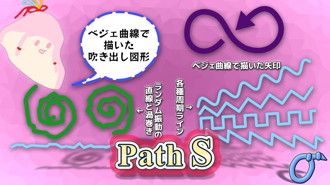 AviUtl2 で曲線を使った図形を描画するスクリプトを作りました.<br>ベジェ曲線などでパスを作って,単純な曲線や塗りつぶし図形,矢印や渦巻きなどを生成できます.<br>他にも曲線で囲った範囲をクリッピングしたり,指定範囲だけに他のフィルタ効果を適用したりもできます.<br>4 種類の図形オブジェクトと,4 種類のフィルタ効果があります.<br><br><strong><u>配布ページ:</u></strong> <a href="https://github.com/sigma-axis/aviutl2_script_Path_S" target="_blank" rel="noopener nofollow">https://github.com/sigma-axis/aviutl2_script_Path_S</a><br><br><strong><u>使用させていただいたもの:</u></strong><br>・AviUtl ExEdit2 beta20<br>・x264guiEx: <a href="https://www.nicovideo.jp/watch/sm40417801" class="watch">sm40417801</a><br>・L-SMASH Works: <a href="https://www.nicovideo.jp/watch/sm42848506" class="watch">sm42848506</a><br>・色覚シミュレーションKR: <a href="https://www.nicovideo.jp/watch/sm44847041" class="watch">sm44847041</a><br>・Reverb effect plugin: <a href="https://github.com/zopty/reverb-auf2" target="_blank" rel="noopener nofollow">https://github.com/zopty/reverb-auf2</a><br><br><strong><u>BGM:</u></strong><br>MUSMUS様: <a href="https://musmus.main.jp" target="_blank" rel="noopener nofollow">https://musmus.main.jp</a><br>