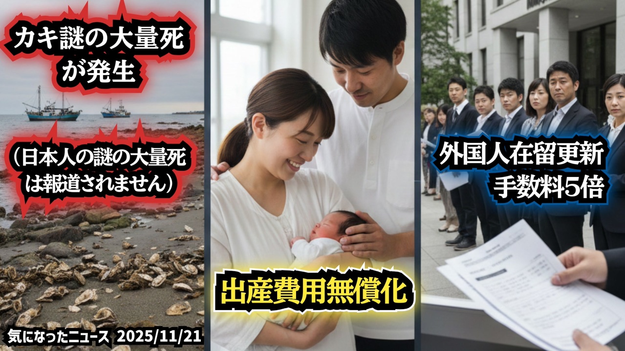 ◆出産無償化が遅れる理由と“国民負担実質50%超”の現実<br>進む重税化、日本は限界なのか?<br><br>出産無料化が延期…日本の“重税国家”がついにヤバい<br><br>あらすじ <br>出産費用の無償化が当初予定の2026年度から遅れ込み、公的医療保険の新枠組みで再調整が始まった。しかし、その裏で国民負担率は“実質5割超”と指摘され、賃上げがあっても手取りが増えない構造的な重さが国民の生活を圧迫している。同時に瀬戸内海では“災害級”のカキ大量死、説明不能な日本人の超過死亡、そして外国人の在留更新手数料の大幅引き上げなど、国の足元で静かに歪みが進行。政策の遅れと社会の異変が複雑に絡み合う今、その背景に何があるのか──視聴者とともに深く読み解く序章。<br><br>◆今回の台本&詳細<a href="https://keiichiro8140.hatenablog.com/entry/25112111111" target="_blank" rel="noopener nofollow">https://keiichiro8140.hatenablog.com/entry/25112111111</a><br><br>◆これまでの動画<a href="https://x.gd/sPXoJ" target="_blank" rel="noopener nofollow">https://x.gd/sPXoJ</a><br><br>◆もしも(BAN)の時のためのマイリンク集<a href="https://lit.link/K-16-news-44" target="_blank" rel="noopener nofollow">https://lit.link/K-16-news-44</a><br><br>ご覧いただきありがとうございます<br>m(_ _)m<br>気になったニュース 2025/11/21<br><br />著作権、肖像権に配慮して作成しております。<br><br>◆気になったニュースの台本!?<br>メモ代わりに作った台本をそのままあげてます<br><a href="https://keiichiro8140.hatenablog.com/." target="_blank" rel="noopener nofollow">https://keiichiro8140.hatenablog.com/.</a><br><br><br>ここからはシリーズ紹介<br><br><br>◆ ワクチン解毒・デトックス<br><a href="https://x.gd/fZweg" target="_blank" rel="noopener nofollow">https://x.gd/fZweg</a><br><br>◆ウイリアム・マキス博士のがん治療(イベルメクチン・フェンベンダゾール等)<br><a href="https://x.gd/AtFYS" target="_blank" rel="noopener nofollow">https://x.gd/AtFYS</a><br><br>◆予防接種健康被害救済制度<br><a href="https://x.gd/0xK9x" target="_blank" rel="noopener nofollow">https://x.gd/0xK9x</a><br><br>◆気になったニュース #1501~<br><br>◆ 【ショートver】気になったニュース<br><a href="https://x.gd/7MxXC" target="_blank" rel="noopener nofollow">https://x.gd/7MxXC</a><br><br>◆ 気になったニュース #1001~<br><a href="https://x.gd/Lp8gv" target="_blank" rel="noopener nofollow">https://x.gd/Lp8gv</a><br><br>◆ 気になったニュース #501~<br><a href="https://x.gd/EmbS4" target="_blank" rel="noopener nofollow">https://x.gd/EmbS4</a><br><br>◆ 気になったニュース #1~#500<br><a href="https://x.gd/uPhNb" target="_blank" rel="noopener nofollow">https://x.gd/uPhNb</a><br><br>◆ X(旧Twitter)・テレグラムで気になった情報<br><a href="https://x.gd/YG6FT" target="_blank" rel="noopener nofollow">https://x.gd/YG6FT</a><br><br>◆ 日比谷5万人パレードデ⚪生放送アーカイブ動画<br><a href="https://x.gd/3CHJv" target="_blank" rel="noopener nofollow">https://x.gd/3CHJv</a><br><br>◆日比谷5万人パレード⚪モのマイリスト作ってみました<br><a href="https://nico.ms/mylist/76828848?ref=sp_other" target="_blank" rel="noopener nofollow">https://nico.ms/mylist/76828848?ref=sp_other</a><br><br>◆3.30 令和の百姓⚪⚪<br><a href="https://www.nicovideo.jp/series/511791?ref=garage_share_other" target="_blank" rel="noopener nofollow">https://www.nicovideo.jp/series/511791?ref=garage_share_other</a><br><br>◆ 及川幸久さんの【XNEWS】シリーズ<br><a href="https://x.gd/3k78K" target="_blank" rel="noopener nofollow">https://x.gd/3k78K</a><br><br>◆これまでの動画<a href="https://x.gd/sPXoJ" target="_blank" rel="noopener nofollow">https://x.gd/sPXoJ</a><br><br>◆もしも(BAN)の時のためのマイリンク集<a href="https://lit.link/K-16_News44" target="_blank" rel="noopener nofollow">https://lit.link/K-16_News44</a><br><br>