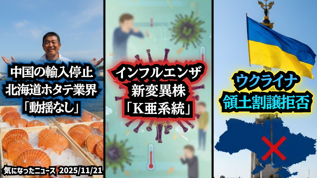 ◆中国の輸入停止、北海道ホタテ業界「動揺なし」◆インフルエンザ新変異株「K亜系統」が流行◆ウクライナ、領土割譲拒否する姿勢表明<br><br>◆今回の台本&詳細<a href="https://keiichiro8140.hatenablog.com/entry/25112111222" target="_blank" rel="noopener nofollow">https://keiichiro8140.hatenablog.com/entry/25112111222</a><br><br>◆これまでの動画<a href="https://x.gd/sPXoJ" target="_blank" rel="noopener nofollow">https://x.gd/sPXoJ</a><br><br>◆もしも(BAN)の時のためのマイリンク集<a href="https://lit.link/K-16-news-44" target="_blank" rel="noopener nofollow">https://lit.link/K-16-news-44</a><br><br>ご覧いただきありがとうございます<br>m(_ _)m<br>気になったニュース 2025/11/21<br><br />著作権、肖像権に配慮して作成しております。<br><br>◆気になったニュースの台本!?<br>メモ代わりに作った台本をそのままあげてます<br><a href="https://keiichiro8140.hatenablog.com/." target="_blank" rel="noopener nofollow">https://keiichiro8140.hatenablog.com/.</a><br><br><br>ここからはシリーズ紹介<br><br><br>◆ ワクチン解毒・デトックス<br><a href="https://x.gd/fZweg" target="_blank" rel="noopener nofollow">https://x.gd/fZweg</a><br><br>◆ウイリアム・マキス博士のがん治療(イベルメクチン・フェンベンダゾール等)<br><a href="https://x.gd/AtFYS" target="_blank" rel="noopener nofollow">https://x.gd/AtFYS</a><br><br>◆予防接種健康被害救済制度<br><a href="https://x.gd/0xK9x" target="_blank" rel="noopener nofollow">https://x.gd/0xK9x</a><br><br>◆気になったニュース #1501~<br><br>◆ 【ショートver】気になったニュース<br><a href="https://x.gd/7MxXC" target="_blank" rel="noopener nofollow">https://x.gd/7MxXC</a><br><br>◆ 気になったニュース #1001~<br><a href="https://x.gd/Lp8gv" target="_blank" rel="noopener nofollow">https://x.gd/Lp8gv</a><br><br>◆ 気になったニュース #501~<br><a href="https://x.gd/EmbS4" target="_blank" rel="noopener nofollow">https://x.gd/EmbS4</a><br><br>◆ 気になったニュース #1~#500<br><a href="https://x.gd/uPhNb" target="_blank" rel="noopener nofollow">https://x.gd/uPhNb</a><br><br>◆ X(旧Twitter)・テレグラムで気になった情報<br><a href="https://x.gd/YG6FT" target="_blank" rel="noopener nofollow">https://x.gd/YG6FT</a><br><br>◆ 日比谷5万人パレードデ⚪生放送アーカイブ動画<br><a href="https://x.gd/3CHJv" target="_blank" rel="noopener nofollow">https://x.gd/3CHJv</a><br><br>◆日比谷5万人パレード⚪モのマイリスト作ってみました<br><a href="https://nico.ms/mylist/76828848?ref=sp_other" target="_blank" rel="noopener nofollow">https://nico.ms/mylist/76828848?ref=sp_other</a><br><br>◆3.30 令和の百姓⚪⚪<br><a href="https://www.nicovideo.jp/series/511791?ref=garage_share_other" target="_blank" rel="noopener nofollow">https://www.nicovideo.jp/series/511791?ref=garage_share_other</a><br><br>◆ 及川幸久さんの【XNEWS】シリーズ<br><a href="https://x.gd/3k78K" target="_blank" rel="noopener nofollow">https://x.gd/3k78K</a><br><br>◆これまでの動画<a href="https://x.gd/sPXoJ" target="_blank" rel="noopener nofollow">https://x.gd/sPXoJ</a><br><br>◆もしも(BAN)の時のためのマイリンク集<a href="https://lit.link/K-16_News44" target="_blank" rel="noopener nofollow">https://lit.link/K-16_News44</a><br><br>