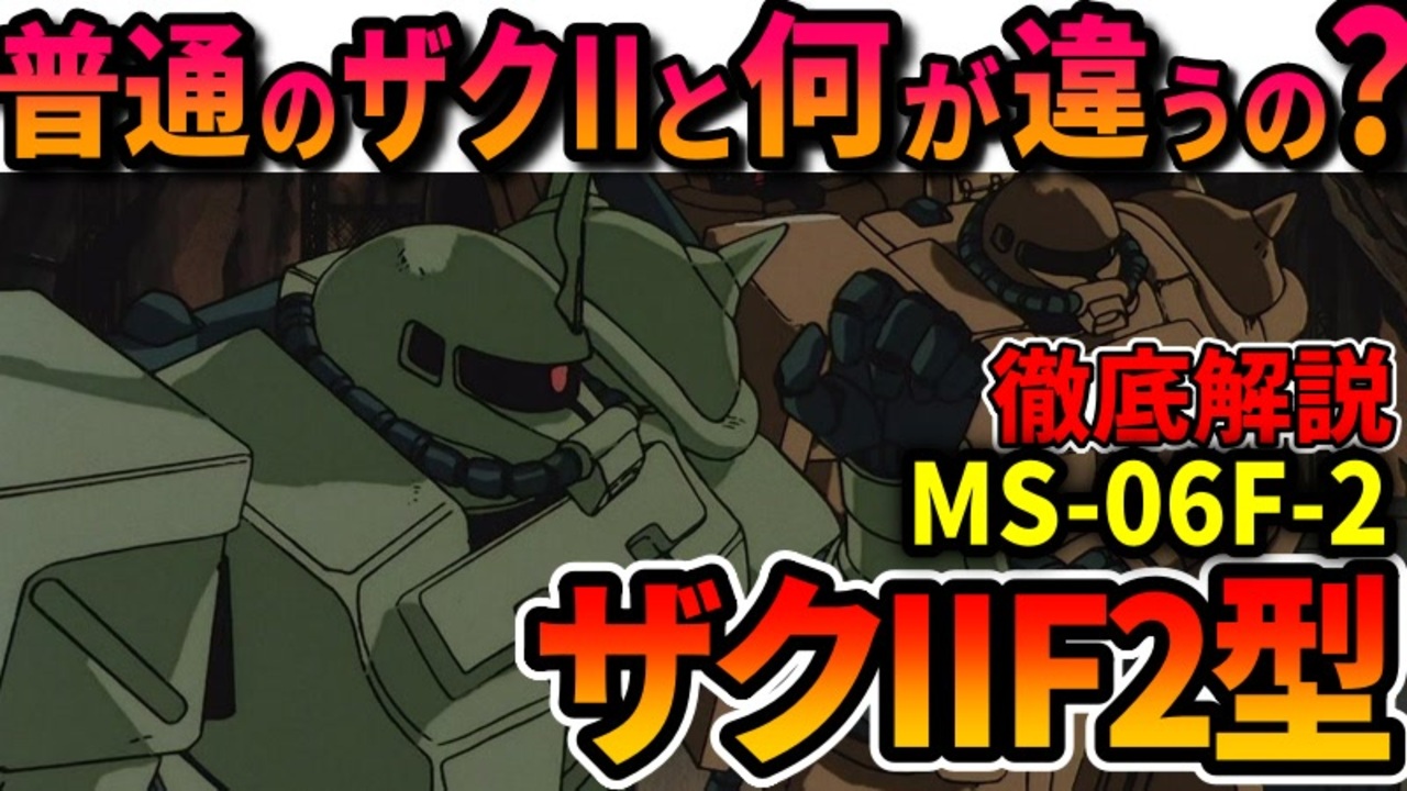 【普通のザクIIと何が違うの?】ザクIIF2型ことザクII後期型の性能、本当に凄い大活躍などを徹底解説【機動戦士ガンダム0083】<br><br>機動戦士ガンダム0083などに登場するMS、MS-06F-2ザクIIF2型を解説、考察していきます。<br>今回は解説と考察が同じくらいです。<br><br>思っていたよりもザク2とは別物で<br>想像していたよりもずっと世界に与えた影響が大きくて<br>色々楽しくなって追加してたら動画投稿だいぶ遅れました<br>大変もうしわけありませんm(_ _)m<br><br>現在連載中の小説を見てくださる方はこちら:<br>死に戻り34回目、もう疲れたので私アイドルになります!<br>※初期コンセプトは死に戻ったガルマがシャアを救うにはどうしたら良いのか的な物語を全部女の子でやった感じです。<br>※ここが駄目、もっとこうしたらなどのアドバイスも大歓迎です<br><a href="https://kakuyomu.jp/works/16817330662598051943" target="_blank" rel="noopener nofollow">https://kakuyomu.jp/works/16817330662598051943</a><br><br>質問、などありましたらこちらにも<br><a href="https://twitter.com/@i4S0LHspdgzBTor" target="_blank" rel="noopener nofollow">https://twitter.com/@i4S0LHspdgzBTor</a><br><br>清見元康名義でカクヨム、小説家になろう、たいあっぷなどに投稿しています。<br>もし良ければ応援お願いしますm(_ _)m<br><a href="https://kakuyomu.jp/users/GariD/works" target="_blank" rel="noopener nofollow">https://kakuyomu.jp/users/GariD/works</a><br><br>以前の作品(短編シリアス):<br>転生した厄災の大魔女はやがて聖女と呼ばれる<br><a href="https://ncode.syosetu.com/n0827ha/" target="_blank" rel="noopener nofollow">https://ncode.syosetu.com/n0827ha/</a><br><br>A.I.VOICE:結月ゆかり<br>VOICEVOX:ずんだもん<br><br>使用させていただいたずんだもん:<br>ずんだもん mini Deluxe(立ち絵) ver1.2<br><a href="https://seiga.nicovideo.jp/seiga/im10794509" target="_blank" rel="noopener nofollow">https://seiga.nicovideo.jp/seiga/im10794509</a><br><br>いつも広告、コメントありがとうございます。<br>励みになりますm(_ _)m<br>