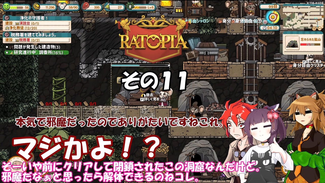 この動画はスチーム版Ratopiaの実況動画です。<br><br>※幾つか難易度を優しくするMODが導入されております。<br>また、高確率で失踪予定!<br>(なにせ何度かプレイして全部襲撃全滅ENDしておりますゆえ)<br><br><br><a href="https://www.nicovideo.jp/watch/sm45648715" class="watch">sm45648715</a> ← 前 次 → <a href="https://www.nicovideo.jp/watch/sm45657113" class="watch">sm45657113</a><br>その1リスト →<a href="https://www.nicovideo.jp/mylist/58364125" target="_blank" rel="noopener">mylist/58364125</a> <br><br>VOICEVOX:春日部つむぎ(ネコ耳) 九州そら(山城) 雨晴はう(妖夢)<br> 青山龍星(ドラムカン) 東北きりたん(東北きりたん)<br> あいちゃん(中国うさぎ(立ち絵:akihiyo様作 立ち中国うさぎ素材 <a href="https://seiga.nicovideo.jp/seiga/im11211212" target="_blank" rel="noopener">im11211212</a>))<br>Voiceroid:東北きりたん(立ち絵:このりEX様作 東北きりたん立ち絵素材5 <a href="https://seiga.nicovideo.jp/seiga/im10819054" target="_blank" rel="noopener">im10819054</a>)<br>
