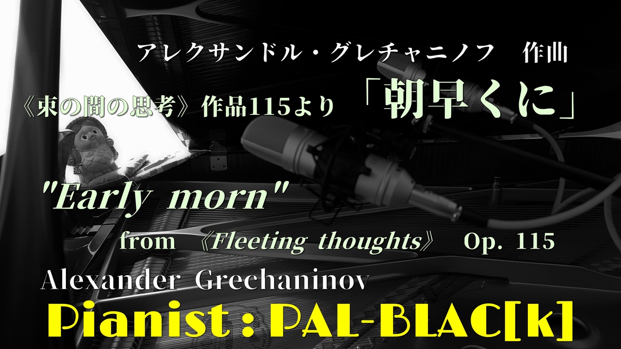 【クラシック】グレチャニノフの「朝早くに」を弾いてみた【ピアノ】<br><br><br><br>アレクサンドル・グレチャニノフ 作曲<br>Александр Тихонович Гречанинов<br>Alexander Tikhonovich Grechaninov<br><br><br>《束の間の思考》 作品115 より「朝早くに (朝またぎに)」<br>"In aller Frühe" der 《Flüchtige Gedanken》 op. 115<br>"Early morn" from 《Fleeting thoughts》 Op. 115<br><br><br><br>使用楽譜:<br>ALEXANDER GRETCHANIOFF<br>Opus 115<br>Flüchtige Gedanken<br>Fleeting thoughts - Pensées fugitives<br>15 Skizzen für Piano<br><br>Plate: 32203<br>Mainz: B. Schott's Söhne, n. d. <br><br><br><br>演奏系総合: <a href="https://www.nicovideo.jp/mylist/18331638" target="_blank" rel="noopener">mylist/18331638</a><br>クラシック系マイリスト: <a href="https://www.nicovideo.jp/mylist/65665149" target="_blank" rel="noopener">mylist/65665149</a>