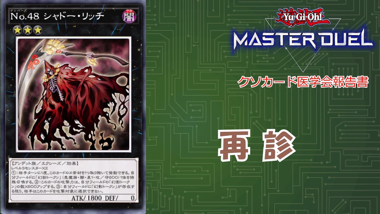 17本目です<br><br>最近数ヶ月ごとの投稿が続いて申し訳ありません…<br><br>当院の患者第一号です。<br>どれだけ活動を続けても最初の患者は変わらないことを思うとこれからも大切に見守りたい1枚です。<br><br>3軸がベースになっているので治療デッキ内でも何気に一番調整が繰り返されてきたデッキです。<br>それゆえ逆にいつ発表したものかと思ってましたが今回ようやく納得のいくデッキになりました。<br><br>ところで最近は環境のレベルがどんどん上がっているので<br>過去の治療デッキをグレードアップさせるだけでも様になるのは嬉しいような大変なような…<br><br><s>あとしばらくはエアライダーをやる予定なのでまた投稿は遅くなるかもしれません</s><br><br>コメント、いいね、マイリスしていただけると励みになります。<br><br>あまくだり氏リスペクトです<br><br>使用音源<br>ニコニ・コモンズ<br><br>編集ソフト<br>ゆっくりムービーメーカー4<br><br>使用楽曲<br>Funky droll street (蒲鉾さちこ様)<br>荒野のデュエリスト (遊戯王5D'SWCS2011DS)<br><br>前≫<a href="https://www.nicovideo.jp/watch/sm44578552" class="watch">sm44578552</a> 新「影六武衆-リハン」<br>次≫模索中