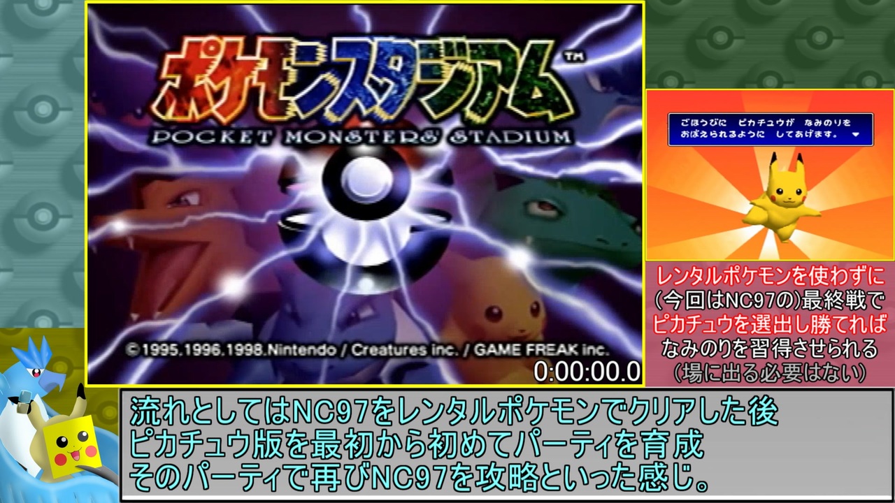 りあの祈祷力と私のチャート改善の成果で1時間ちょっと短縮して帰ってきました<br>(前走は5時間33分57秒)<br>今度はちゃんとお見せできる内容だと思うので<br>最後まで動画化させてもらいます、ご迷惑をおかけしました<br><br>動画の性質上以前の動画と被るシーンがありますがご了承ください<br><s>(あとせっかく使えるからってある程度台詞流用したし)</s><br><br>次→12/5~7辺りに出せたらうれしあじ<br><br>25/11/23 19:00頃に微ガバ修正しました<br>25/11/24 3:45頃に追記修正しました<br><br>【今回のレギュレーション】<br>●『このデータでエントリーします』→『はい』でタイマースタート<br>●ピカチュウが砂浜に到着(ミニゲームクリア)でタイマーストップ(動画内画像参照)<br>●バグ技&裏技は使用禁止(※カウンターによって発生し得るバグは一部のみ許容)<br>●ニンテンドウカップ97の報酬でなみのりを習得させる<br>●RTA中に解放条件を満たした倍速モードを使用可能(今回はドードーのGB)<br>●ピカ版もさいしょからはじめる<br><br>りあのバトン/パスRTA:<a href="https://www.nicovideo.jp/series/505882" target="_blank" rel="noopener">series/505882</a>(第3世代)/<a href="https://www.nicovideo.jp/series/466533" target="_blank" rel="noopener">series/466533</a>(第1世代)<br>つばさのバト/レボRTA:<a href="https://www.nicovideo.jp/series/418441" target="_blank" rel="noopener">series/418441</a>(ゲート1~ミステリオ)/<a href="https://www.nicovideo.jp/series/494477" target="_blank" rel="noopener">series/494477</a>(ゲート8ミステリオ)<br><br>走った人→りあ<br>編集した人→あむ<br>収録環境→64、OBS Studio<br>編集ツール→Aviutl、VOICEVOX、FireAlpaca、paint.net<br><br>VOICEVOX:櫻歌ミコ&雨晴はう<br><br><a target="_blank" href="https://qa.nicovideo.jp/faq/show/19424?site_domain=default" style="font-size: 13px;color: #657586; text-decoration: underline; line-height: 1.4">この動画は投稿者によって修正されました</a>