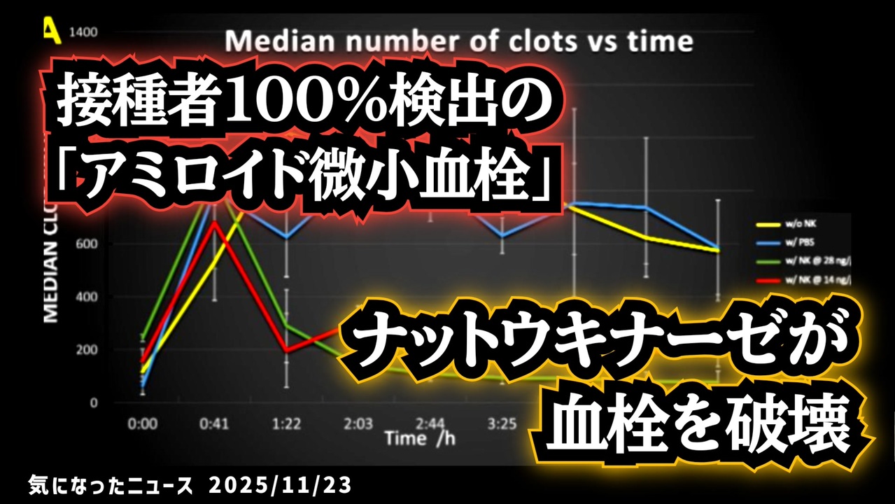 グラフレイアウト編集してたら大遅刻しました<br><br>◆ナットウキナーゼがワクチン後遺症の天敵アミロイド微小血栓まで破壊!?<br><br>あらすじ<br>納豆キナーゼ、2時間以内にアミロイド微小血栓の84%を溶解<br><br>画期的なin-vitro研究で、天然由来の酵素が、最近COVID-19ワクチン接種者100%から検出された同一のアミロイド微小血栓を強力に分解することが判明。<br><br>◆今回の台本(詳細)<a href="https://keiichiro8140.hatenablog.com/entry/25112333111" target="_blank" rel="noopener nofollow">https://keiichiro8140.hatenablog.com/entry/25112333111</a><br><br>◆◆これまでの動画<a href="https://x.gd/sPXoJ" target="_blank" rel="noopener nofollow">https://x.gd/sPXoJ</a><br><br>◆もしも(BAN)の時のためのマイリンク集<a href="https://lit.link/K-16-news-44" target="_blank" rel="noopener nofollow">https://lit.link/K-16-news-44</a><br><br><br><a href="https://nico.ms/sm45641216?ref=other_cap_off" target="_blank" rel="noopener nofollow">https://nico.ms/sm45641216?ref=other_cap_off</a><br>【陰謀論だったら良かったのに的内容】◆ワクチン後の血液に現れる“アミロイド微小血栓”◇コロナ患者にワクチン接種で150万ドル!?【解毒は大事】<br><br><br>ワクチン<br>アミロイド微小血栓<br>血栓<br>ナットウキナーゼ<br>血栓除去<br>血栓溶解<br>ワクチン解毒<br>デトックス<br>ワクチン後遺症<br>コロナ後遺症<br>気になったニュース <br><br>ご覧いただきありがとうございます<br>m(_ _)m <br><br>気になったニュース 2025/11/23<br><br />著作権、肖像権に配慮して作成しております。<br><br>◆気になったニュースの台本!?<br>メモ代わりに作った台本をそのままあげてます<br><a href="https://keiichiro8140.hatenablog.com/." target="_blank" rel="noopener nofollow">https://keiichiro8140.hatenablog.com/.</a><br><br><br>ここからはシリーズ紹介<br><br><br>◆ ワクチン解毒・デトックス<br><a href="https://x.gd/fZweg" target="_blank" rel="noopener nofollow">https://x.gd/fZweg</a><br><br>◆ウイリアム・マキス博士のがん治療(イベルメクチン・フェンベンダゾール等)<br><a href="https://x.gd/AtFYS" target="_blank" rel="noopener nofollow">https://x.gd/AtFYS</a><br><br>◆予防接種健康被害救済制度<br><a href="https://x.gd/0xK9x" target="_blank" rel="noopener nofollow">https://x.gd/0xK9x</a><br><br>◆気になったニュース #1501~<br><br>◆ 【ショートver】気になったニュース<br><a href="https://x.gd/7MxXC" target="_blank" rel="noopener nofollow">https://x.gd/7MxXC</a><br><br>◆ 気になったニュース #1001~<br><a href="https://x.gd/Lp8gv" target="_blank" rel="noopener nofollow">https://x.gd/Lp8gv</a><br><br>◆ 気になったニュース #501~<br><a href="https://x.gd/EmbS4" target="_blank" rel="noopener nofollow">https://x.gd/EmbS4</a><br><br>◆ 気になったニュース #1~#500<br><a href="https://x.gd/uPhNb" target="_blank" rel="noopener nofollow">https://x.gd/uPhNb</a><br><br>◆ X(旧Twitter)・テレグラムで気になった情報<br><a href="https://x.gd/YG6FT" target="_blank" rel="noopener nofollow">https://x.gd/YG6FT</a><br><br>◆ 日比谷5万人パレードデ⚪生放送アーカイブ動画<br><a href="https://x.gd/3CHJv" target="_blank" rel="noopener nofollow">https://x.gd/3CHJv</a><br><br>◆日比谷5万人パレード⚪モのマイリスト作ってみました<br><a href="https://nico.ms/mylist/76828848?ref=sp_other" target="_blank" rel="noopener nofollow">https://nico.ms/mylist/76828848?ref=sp_other</a><br><br>◆3.30 令和の百姓⚪⚪<br><a href="https://www.nicovideo.jp/series/511791?ref=garage_share_other" target="_blank" rel="noopener nofollow">https://www.nicovideo.jp/series/511791?ref=garage_share_other</a><br><br>◆ 及川幸久さんの【XNEWS】シリーズ<br><a href="https://x.gd/3k78K" target="_blank" rel="noopener nofollow">https://x.gd/3k78K</a><br><br>◆これまでの動画<a href="https://x.gd/sPXoJ" target="_blank" rel="noopener nofollow">https://x.gd/sPXoJ</a><br><br>◆もしも(BAN)の時のためのマイリンク集<a href="https://lit.link/K-16_News44" target="_blank" rel="noopener nofollow">https://lit.link/K-16_News44</a><br><br>