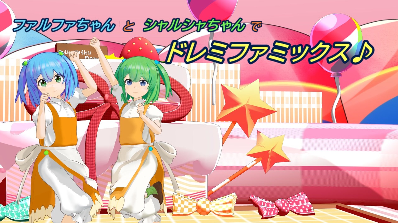 例によって、エフェクトとかシェーダー入っていない平たい動画ですが、ファルファちゃんとシャルシャちゃんが可愛いので愛でていってね♡<br><br>楽曲:えのやっく 様【初音ミク】 ドレミファミックス(Full Ver.) 【オリジナル】(<a href="https://www.nicovideo.jp/watch/sm16432311" class="watch">sm16432311</a>)<br>振り付け:みこ☆ぺん 様【みこ☆ぺん】ドレミファミックス 踊ってみた【オリジナル振付】(<a href="https://www.nicovideo.jp/watch/sm25482632" class="watch">sm25482632</a>)<br>モーショントレース&配布&カメラ:jmccmy 様【MMD】ドレミファミックス踊ってもらた《モーション配布》(<a href="https://www.nicovideo.jp/watch/sm28930113" class="watch">sm28930113</a>)<br>ステージ:幻愛 様【MMD】第三次プリン戦争【ステージ/カメラ配布】(<a href="https://www.nicovideo.jp/watch/sm43905117" class="watch">sm43905117</a>)<br>モデル:L3 様【スライム倒して300年】ファルファちゃん&シャルシャちゃん【モデル配布】(<a href="https://www.nicovideo.jp/watch/sm45502041" class="watch">sm45502041</a>)<br><br>【広告御礼】<br>CBX250S 様、どりーむまっぷ 様(大量投入感謝です!)、L3 様(仲良く可愛いダンスしてもらう為に今日もニコ動を彷徨うのです!大量投入感謝~)、針井 原也 様、かつサンド 様(可愛いダンスモーション探して(ry)、昼寝 様(実は重大なミスに気が付きまして……滝汗 私、あそこで知っている動画流れた事ないのですよぅ。追加広告感謝~)、Masa 様(いつでも癒やされに来て下さいまし~)、幻愛 様(可愛いステージ配布&広告ありがとうございます!)、Gets 様、シロミミズク 様、xf108 様、ゲスト 様、giolum 様、クロ151 様、氷結果実 様(座敷わらし’sを紛れ込ませれば良かったかもw)、witch 様(追加広告感謝です~)、雪原 白銀 様<br><br>※テロップに重大なミスを見つけてしまったので、修正ついでに双子の胸元が寂しかったので、とらばせ様の「65 朝潮(艦隊これくしょん)ver 0.99」より制服リボンを色替えして移植してみました。<br><br />【これまでに投稿した動画リスト】<a href="https://www.nicovideo.jp/mylist/79114913" target="_blank" rel="noopener">mylist/79114913</a><br>【これまでに投稿した静画リスト】<a href="https://seiga.nicovideo.jp/user/illust/7589339" target="_blank" rel="noopener">user/illust/7589339</a><br><br>【その他、常用ツールなど】<br>MikuMikuDance:樋口優 様(<a href="https://www.nicovideo.jp/watch/sm2420025" class="watch">sm2420025</a>)<br>つんでれんこ:窓屋 様(<a href="https://www.nicovideo.jp/watch/sm7634361" class="watch">sm7634361</a>)<br>VMDサイジング:miu 様(<a href="https://seiga.nicovideo.jp/seiga/im9755721" target="_blank" rel="noopener">im9755721</a>)<br>PMXE:とある工房 様<br>MME:舞力介入P 様(<a href="https://www.nicovideo.jp/watch/sm12149815" class="watch">sm12149815</a>)<br>MikuMikuTelop:そぼろ様(<a href="https://www.nicovideo.jp/watch/sm15635052" class="watch">sm15635052</a>)<br>AutoLuminous:そぼろ 様(<a href="https://www.nicovideo.jp/watch/sm19843111" class="watch">sm19843111</a>)<br>スカイドーム:怪獣対若大将P 様、seasalt 様<br>なんやかんや色々なエフェクト:ビームマンP 様<br>とても便利なPMXEプラグイン:L3 様(<a href="https://www.nicovideo.jp/watch/sm44255948" class="watch">sm44255948</a>)<br>葉っぱとか柵とかの周囲を綺麗にするシェーダ:おたもん 様(<a href="https://seiga.nicovideo.jp/seiga/im3131306" target="_blank" rel="noopener">im3131306</a>)<br>大理石を鏡のように綺麗にする魔法:針金P 様「WorkingFloor2.fx ver0.0.8」<br>その他、書ききれないものはコンテンツツリーにて。<br>また、当方使用のモデルは俺得仕様改変したりしておりますのでご了承下さい。<br><br><a target="_blank" href="https://qa.nicovideo.jp/faq/show/19424?site_domain=default" style="font-size: 13px;color: #657586; text-decoration: underline; line-height: 1.4">この動画は投稿者によって修正されました</a>