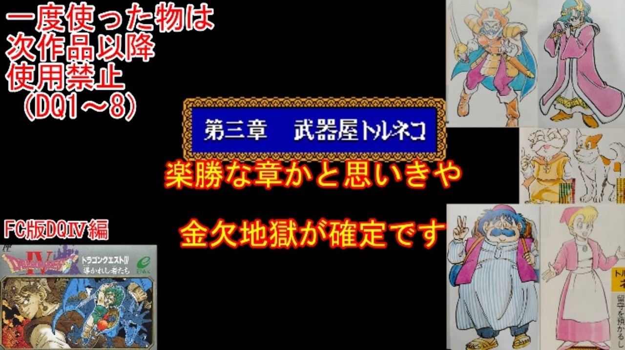 DQⅣの1周目、FCDQⅣ編part4です。<br>武器屋トルネコもとい、貧乏商人トルネコ。<br>ここまで金銭面が辛い3章は、滅多にないと思います。<br><br>前→<a href="https://www.nicovideo.jp/watch/sm45594908" class="watch">sm45594908</a><br>次→<a href="https://www.nicovideo.jp/watch/sm45657684" class="watch">sm45657684</a><br><br>YouTube版→<a href="https://youtu.be/uON96D0_cMs" target="_blank" rel="noopener nofollow">https://youtu.be/uON96D0_cMs</a><br><br>縛りルール(詳細はpart1参照)<br>①一度使った武器・防具・装飾品・道具・呪文・特技は<br> 次作品以降使用禁止。(売却も解禁扱い)<br><br> 一度使った職業(3,6,7)・仲間モンスター(5,6)・スカウトモンスター(8)は<br> 戦士(Ⅲ)、戦士(Ⅵ)のようにナンバリングで分類し次作品以降使用禁止。<br> また複数体加入できる仲間モンスターは一体まで。<br><br>②裏技、バグ技、全滅、逃走、おどかす禁止。<br> またダンジョン攻略とボス戦における状況再現禁止。<br><br>③ダンジョンとボス攻略は、全キャラのレベルを突入時、<br> 1周目は目標レベル+5。2周目は+10。3周目は+15まで。<br> ラスボスの目標レベルは45。裏ボスは50とする。<br>(目標レベルは各公式ガイドブックを参照)<br><br>④1周目はEDまで。2周目は裏ボス撃破まで。<br> 3周目は全てのボスを規定回数、規定ターン以内に倒す。<br>(回避可能なボスも倒し、闇ゾーマは3周全てで倒す)<br><br><br><span style="color: #262626;">※一部機種は互換機を使用してのプレイとなりますが、倍速機能やクイックセーブ・ロード、チートなどは一切使用しません。</span><br><br>※ネタバレ注意です<br><br>この動画で利用している株式会社スクウェア・エニックスを代表とする共同著作者が権利を所有する著作物及びスギヤマ工房有限会社が権利を所有する楽曲の転載・配布は禁止いたします。<br>(C) ARMOR PROJECT/BIRD STUDIO/SQUARE ENIX All Rights Reserved.<br>(C) SUGIYAMA KOBO (P) SUGIYAMA KOBO<br><br>AquesTalk2ライセンスID:AQTK2WINUSR23122185<br /><br><br>❤いいねを押していただけるとモチベーションと投稿速度が上がるので宜しくお願い致します!<br><br>作者ツイッター→ <a href="https://twitter.com/nig0117" target="_blank" rel="noopener nofollow">https://twitter.com/nig0117</a><br>PIXIV FANBOX→ <a href="https://sutanokeiji.fanbox.cc/" target="_blank" rel="noopener nofollow">https://sutanokeiji.fanbox.cc/</a><br><br>( 以前はWEB小説書いてました→ <a href="https://kakuyomu.jp/works/1177354054884910267" target="_blank" rel="noopener nofollow">https://kakuyomu.jp/works/1177354054884910267</a> )