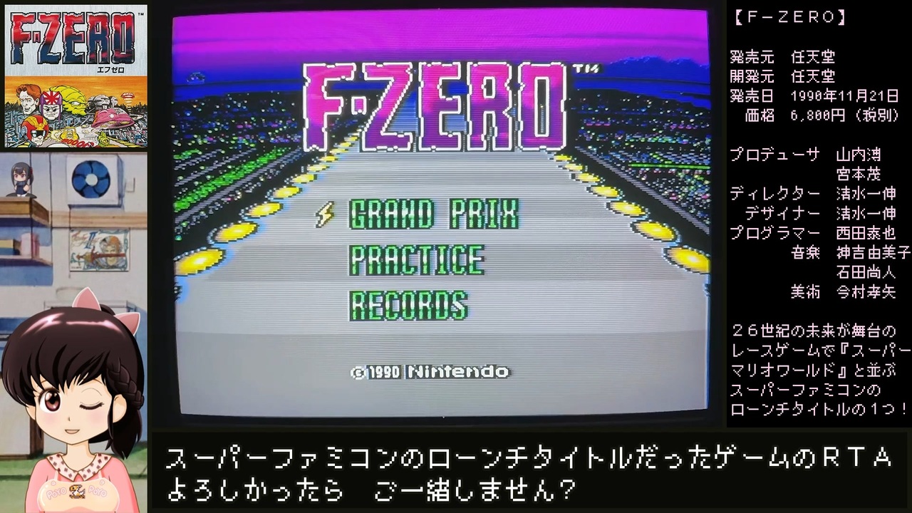 「ゲームやりこみ学会 新作動画発表会2025秋」に合わせて Part.1 を投稿したかったんだけど、ちょっと間に合わなかったので【予告編】な感じで Part.0 を揚げることにしました...(*˘ω˘)φ_ <br><br><br>RTA・縛りプレイ・やりこみプレイの祭典! 「ゲームやりこみ学会 新作動画発表会2025秋」11/22(土)~24(月・祝)開催。部門賞・特別賞新設でさらに広がるやりこみの世界|ニコニコインフォ<br><a href="https://blog.nicovideo.jp/niconews/257323.html" target="_blank" rel="noopener nofollow">https://blog.nicovideo.jp/niconews/257323.html</a> <br><br><br><br><strong>//レギュレーション</strong><br>ナイトリーグのクラス選択と同時に計測開始。ファイアフィールドの終了と同時に計測終了。<br><br>ちなみに、タイムは全然大したことないのでタイトルに入れないことにしました...(*˘ω˘)φ_.oO(市民マラソン風RTAということでお願いします)<br><br><br><strong>//備考 </strong><br>【ブラウン管テレビ】でのファミコンの映像を動画で綺麗に遺せないかな~って画策している動画だったりもします...(*˘ω˘)φ_.oO(※1080pでの視聴を前提にしてるので【1920x1080】未満のサイズだとモアレが酷くなる可能性がありまぁす) <br><br><br><strong>//参考文献 </strong><br>F-ZEROの説明書 <a href="https://www.nintendo.co.jp/clvs/manuals/ja/pdf/CLV-P-VAABJ.pdf" target="_blank" rel="noopener nofollow">https://www.nintendo.co.jp/clvs/manuals/ja/pdf/CLV-P-VAABJ.pdf</a> <br>「ニンテンドークラシックミニ スーパーファミコン」発売記念インタビュー 第2回「F-ZERO篇」 | トピックス | Nintendo <a href="https://www.nintendo.com/jp/topics/article/0e9c42d3-7d8a-11e7-8cda-063b7ac45a6d" target="_blank" rel="noopener nofollow">https://www.nintendo.com/jp/topics/article/0e9c42d3-7d8a-11e7-8cda-063b7ac45a6d</a> <br>めぞん一刻 <a href="https://www.amazon.co.jp/gp/video/detail/B0FPQQN173/" target="_blank" rel="noopener nofollow">https://www.amazon.co.jp/gp/video/detail/B0FPQQN173/</a> <br /> <br><br><span style="color: #e69138;">//共通説明文てすと</span><br><span style="color: #ff00ff;"><strong>【New!】</strong></span>F-ZERO RTA:<a href="https://www.nicovideo.jp/watch/sm45660939" class="watch">sm45660939</a><br>【New!】Romancing Sa・Ga2:<a href="https://www.nicovideo.jp/watch/sm44400984" class="watch">sm44400984</a> <br>【New!】らんま½爆烈乱闘篇RTA (WR):<a href="https://www.nicovideo.jp/watch/sm44178414" class="watch">sm44178414</a>(デバイス制限対策版: <a href="https://www.nicovideo.jp/watch/sm44432134" class="watch">sm44432134</a>)<br>【New!】スーパーファミスタRTA:<a href="https://www.nicovideo.jp/watch/sm43890432" class="watch">sm43890432</a><br>【New!】ファミコンRTA落とし穴可視化用アイコン:<a href="https://seiga.nicovideo.jp/seiga/im11438499" target="_blank" rel="noopener">im11438499</a>(←5月23日以降に投稿したのは消えちゃったぽい...?)<br><br>【直撮り】ブラウン管テレビでファミコンする管理人さん:<a href="https://www.nicovideo.jp/series/423780" target="_blank" rel="noopener">series/423780</a><br>【ミンサガ】RTAとか:<a href="https://www.nicovideo.jp/series/416017" target="_blank" rel="noopener">series/416017</a><br>【WS版FF2】RTA:<a href="https://www.nicovideo.jp/series/426767" target="_blank" rel="noopener">series/426767</a><br>【DEAD OR ALIVE】RTA:<a href="https://www.nicovideo.jp/series/79228" target="_blank" rel="noopener">series/79228</a><br>【バブルボブル】RTA:<a href="https://www.nicovideo.jp/series/366167" target="_blank" rel="noopener">series/366167</a><br><span style="font-size: 14px;">【アーケードアーカイブス】</span>RTA:<a href="https://www.nicovideo.jp/series/79229" target="_blank" rel="noopener">series/79229</a>