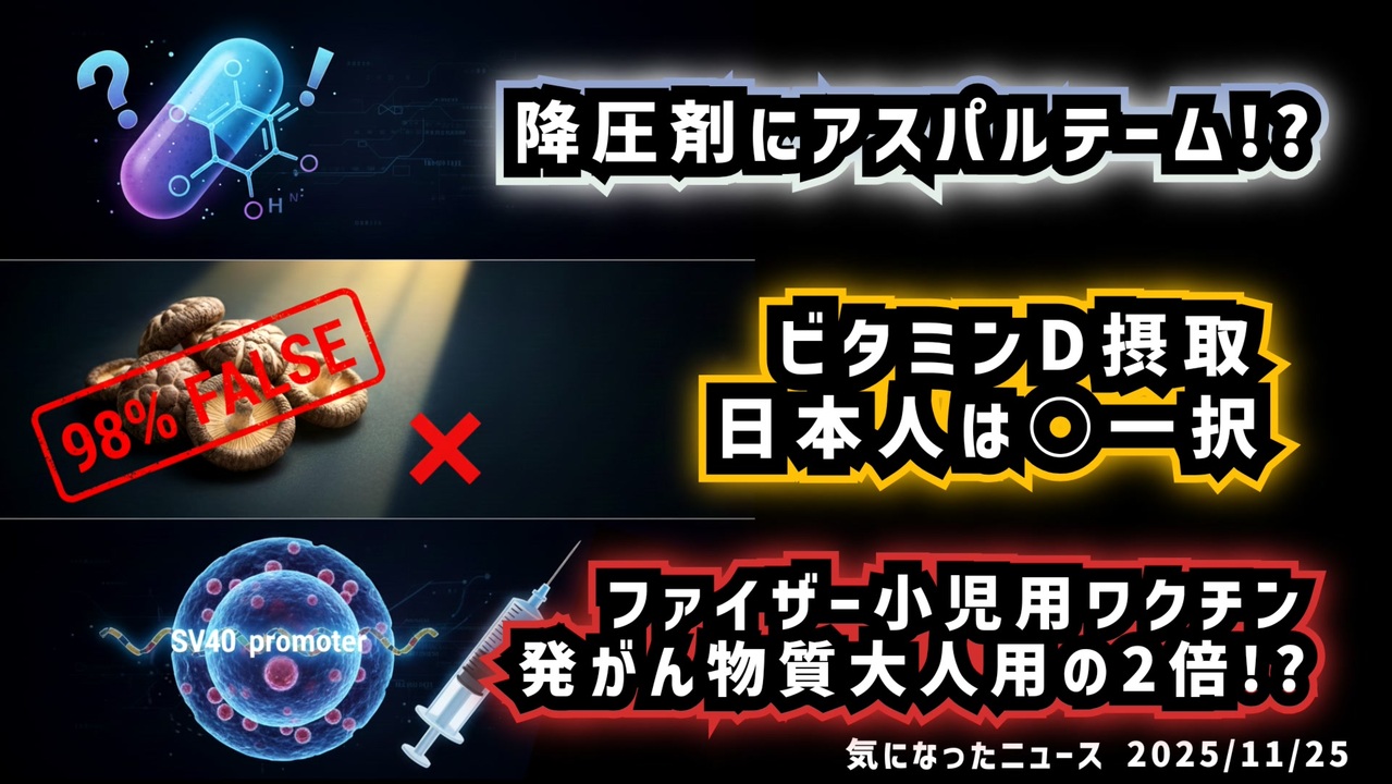 遅くなったので早朝に失礼します<br><br>◆降圧剤にアスパルテーム!?◆ビタミンD 摂取、日本人は○○一択!◆ファイザー小児用ワクチン「発がんに関わるSV40プロモーター」大人用の2倍!<br><br>あらすじ <br>現代医療の影に潜むリスクを検証。長期服用される降圧薬に含まれる人工甘味料、免疫力に影響するビタミンD不足、さらに子ども用ワクチンに存在するSV40遺伝子配列。日常で無意識に接している薬や食品、ワクチンが体に与える影響とは何か。最新の研究や独立検査の結果をもとに、健康維持とリスク回避の視点を整理し、日本で報道されない情報をシェア。<br><br>◆今回の台本(詳細)<a href="https://keiichiro8140.hatenablog.com/entry/25112444333999" target="_blank" rel="noopener nofollow">https://keiichiro8140.hatenablog.com/entry/25112444333999</a><br><br>◆これまでの動画<a href="https://x.gd/sPXoJ" target="_blank" rel="noopener nofollow">https://x.gd/sPXoJ</a> <br><br>◆もしも(BAN)の時<br><br>ご覧いただきありがとうございます<br>m(_ _)m <br><br>気になったニュース 2025/11/25<br><br />著作権、肖像権に配慮して作成しております。<br><br>◆気になったニュースの台本!?<br>メモ代わりに作った台本をそのままあげてます<br><a href="https://keiichiro8140.hatenablog.com/." target="_blank" rel="noopener nofollow">https://keiichiro8140.hatenablog.com/.</a><br><br><br>ここからはシリーズ紹介<br><br><br>◆ ワクチン解毒・デトックス<br><a href="https://x.gd/fZweg" target="_blank" rel="noopener nofollow">https://x.gd/fZweg</a><br><br>◆ウイリアム・マキス博士のがん治療(イベルメクチン・フェンベンダゾール等)<br><a href="https://x.gd/AtFYS" target="_blank" rel="noopener nofollow">https://x.gd/AtFYS</a><br><br>◆予防接種健康被害救済制度<br><a href="https://x.gd/0xK9x" target="_blank" rel="noopener nofollow">https://x.gd/0xK9x</a><br><br>◆気になったニュース #1501~<br><br>◆ 【ショートver】気になったニュース<br><a href="https://x.gd/7MxXC" target="_blank" rel="noopener nofollow">https://x.gd/7MxXC</a><br><br>◆ 気になったニュース #1001~<br><a href="https://x.gd/Lp8gv" target="_blank" rel="noopener nofollow">https://x.gd/Lp8gv</a><br><br>◆ 気になったニュース #501~<br><a href="https://x.gd/EmbS4" target="_blank" rel="noopener nofollow">https://x.gd/EmbS4</a><br><br>◆ 気になったニュース #1~#500<br><a href="https://x.gd/uPhNb" target="_blank" rel="noopener nofollow">https://x.gd/uPhNb</a><br><br>◆ X(旧Twitter)・テレグラムで気になった情報<br><a href="https://x.gd/YG6FT" target="_blank" rel="noopener nofollow">https://x.gd/YG6FT</a><br><br>◆ 日比谷5万人パレードデ⚪生放送アーカイブ動画<br><a href="https://x.gd/3CHJv" target="_blank" rel="noopener nofollow">https://x.gd/3CHJv</a><br><br>◆日比谷5万人パレード⚪モのマイリスト作ってみました<br><a href="https://nico.ms/mylist/76828848?ref=sp_other" target="_blank" rel="noopener nofollow">https://nico.ms/mylist/76828848?ref=sp_other</a><br><br>◆3.30 令和の百姓⚪⚪<br><a href="https://www.nicovideo.jp/series/511791?ref=garage_share_other" target="_blank" rel="noopener nofollow">https://www.nicovideo.jp/series/511791?ref=garage_share_other</a><br><br>◆ 及川幸久さんの【XNEWS】シリーズ<br><a href="https://x.gd/3k78K" target="_blank" rel="noopener nofollow">https://x.gd/3k78K</a><br><br>◆これまでの動画<a href="https://x.gd/sPXoJ" target="_blank" rel="noopener nofollow">https://x.gd/sPXoJ</a><br><br>◆もしも(BAN)の時のためのマイリンク集<a href="https://lit.link/K-16_News44" target="_blank" rel="noopener nofollow">https://lit.link/K-16_News44</a><br><br>