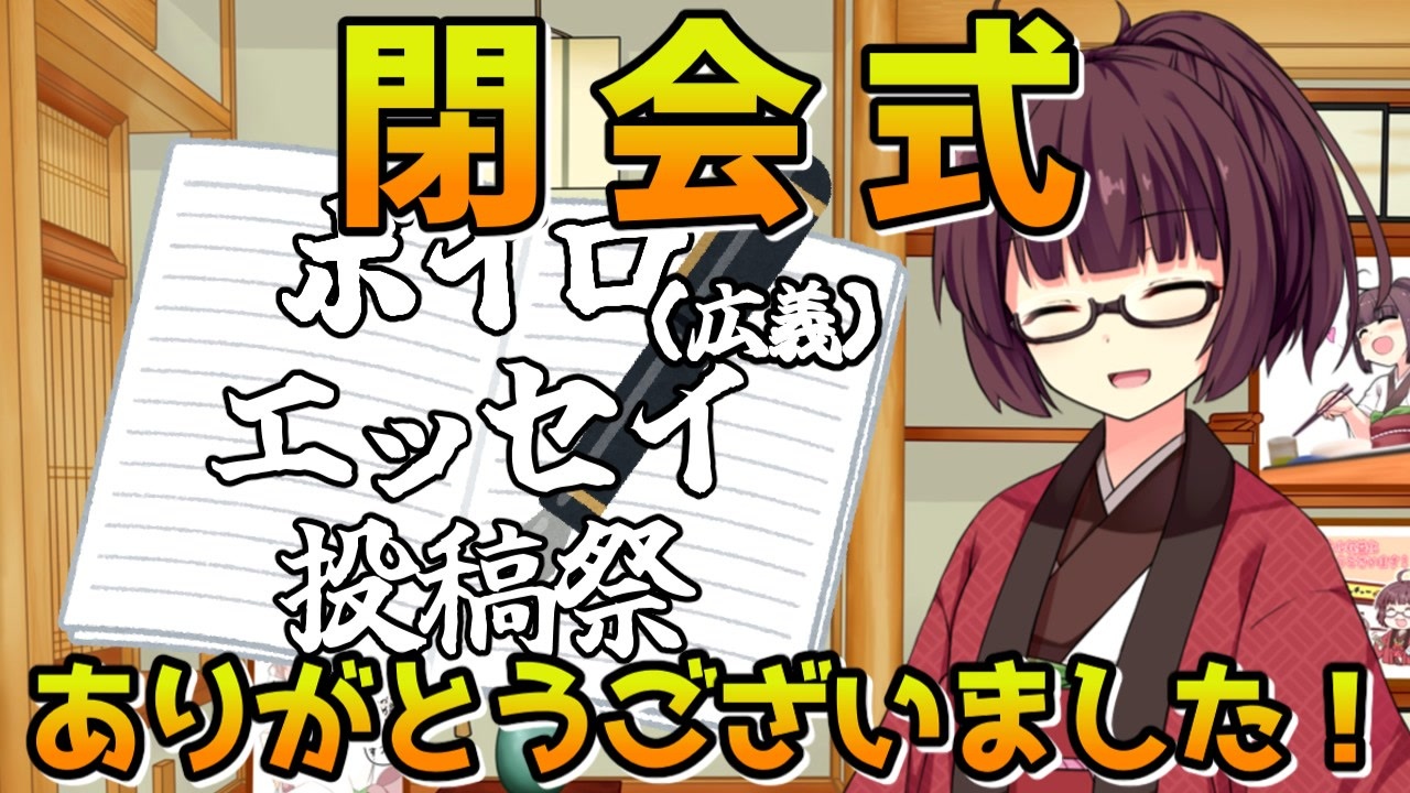 <span style="font-size: 24px;">皆様のご投稿、並びにご視聴ありがとうございました!<br>いいね広告えっくすコメントが滞っておりますが、<br>期間内の投稿分については必ず反応させていただきます。<br>しばらくお待ちください。<br>また来年も開催できるよう、今後もVOICEROIDエッセイをよろしくお願いします。</span><br><br />X(Twitter)→<a href="https://x.com/musiburokiritan" target="_blank" rel="noopener nofollow">https://x.com/musiburokiritan</a><br>マシュマロ→<a href="https://x.gd/aaR23" target="_blank" rel="noopener nofollow">https://x.gd/aaR23</a><br>蒸し風呂きりたん→<a href="https://www.nicovideo.jp/series/307877" target="_blank" rel="noopener">series/307877</a><br>食べ歩きりたん→<a href="https://www.nicovideo.jp/series/351095" target="_blank" rel="noopener">series/351095</a><br>きりたんの一人(称)メシ→<a href="https://www.nicovideo.jp/series/463368" target="_blank" rel="noopener">series/463368</a><br>ゲームきりたん→<a href="https://www.nicovideo.jp/series/367005" target="_blank" rel="noopener">series/367005</a><br>きりたんのひとり語り→<a href="https://www.nicovideo.jp/series/328895" target="_blank" rel="noopener">series/328895</a><br>きりたんのダイマ→<a href="https://www.nicovideo.jp/series/333013" target="_blank" rel="noopener">series/333013</a><br>ゆっくり茶番劇商標登録に断固反対します→<a href="https://www.nicovideo.jp/series/324542" target="_blank" rel="noopener">series/324542</a><br><br><a target="_blank" href="https://qa.nicovideo.jp/faq/show/19424?site_domain=default" style="font-size: 13px;color: #657586; text-decoration: underline; line-height: 1.4">この動画は投稿者によって修正されました</a>