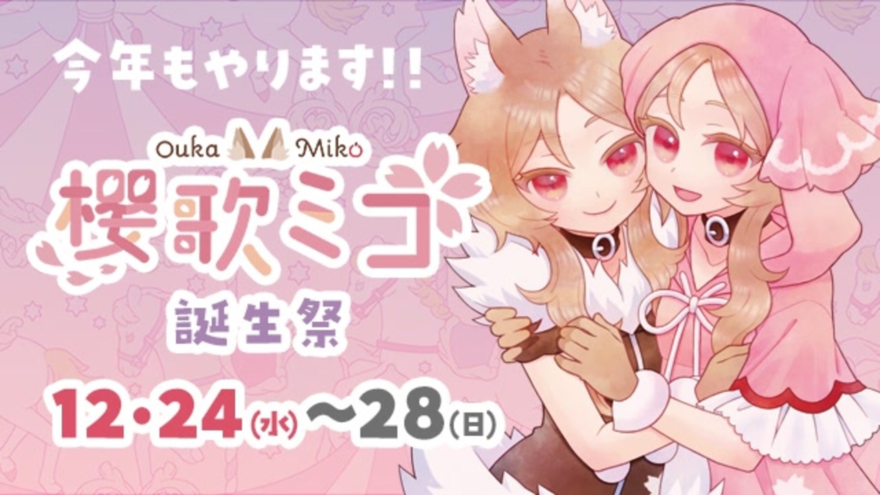 めりーみこみこ!(挨拶) 動画ではお久しぶりです!櫻歌ミコ公式です。<br>今年もミコの誕生祭を開催します。一緒にお祝いしていただけると嬉しいです🐺<br><br>🌸開催期間🌸<br><strong>2025年12月24日(水)~12月28日(日)</strong><br><br>🌸参加方法🌸<br>ニコニコ動画/静画:『<strong>櫻歌ミコ</strong>』『<strong>櫻歌ミコ誕生祭2025</strong>』をタグロックして投稿<br>その他各投稿サイトやSNSなど:ハッシュタグ『<strong>#櫻歌ミコ誕生祭2025</strong>』をつけて投稿<br><br>公式サイトや公式BOOTHから、お使いいただける素材をダウンロードできます🍎<br><br> ̄ ̄ ̄ ̄ ̄ ̄ ̄ ̄ ̄ ̄ ̄ ̄ ̄ ̄ ̄ ̄ ̄ ̄ ̄ ̄ ̄ ̄ ̄ ̄<br>公式立ち絵(表情差分つき)<br><a href="https://seiga.nicovideo.jp/seiga/im11096278" target="_blank" rel="noopener">im11096278</a><br><br>通常衣装MMDモデル(制作:キツネツキさん)<br><a href="https://www.nicovideo.jp/watch/sm22517044" class="watch">sm22517044</a> <a href="https://www.nicovideo.jp/watch/sm25188514" class="watch">sm25188514</a><br><br>10周年記念衣装MMDモデル(制作:キツネツキさん)<br><a href="https://booth.pm/ja/items/2861557" target="_blank" rel="noopener nofollow">https://booth.pm/ja/items/2861557</a><br>________________________<br><br>櫻歌ミコ公式サイト みこみこうしき<br><a href="https://miko35.info/" target="_blank" rel="noopener nofollow">https://miko35.info/</a><br><br>VOICEVOX✕櫻歌ミコ<br><a href="https://voicevox35miko.studio.site/" target="_blank" rel="noopener nofollow">https://voicevox35miko.studio.site/</a><br><br>VOICEVOX公式サイト<br><a href="https://voicevox.hiroshiba.jp/" target="_blank" rel="noopener nofollow">https://voicevox.hiroshiba.jp/</a><br><br>公式X(@miko35info)<br><a href="https://x.com/miko35info" target="_blank" rel="noopener nofollow">https://x.com/miko35info</a><br><br>公式X(@Miko_VOICEVOX)<br><a href="https://x.com/Miko_VOICEVOX" target="_blank" rel="noopener nofollow">https://x.com/Miko_VOICEVOX</a><br><br>公式BOOTH<br><a href="https://akazukin-miko.booth.pm/" target="_blank" rel="noopener nofollow">https://akazukin-miko.booth.pm/</a><br>________________________<br><br>素材をお借りしました:OKUMONO( <a href="https://sozaino.site/" target="_blank" rel="noopener nofollow">https://sozaino.site/</a> )