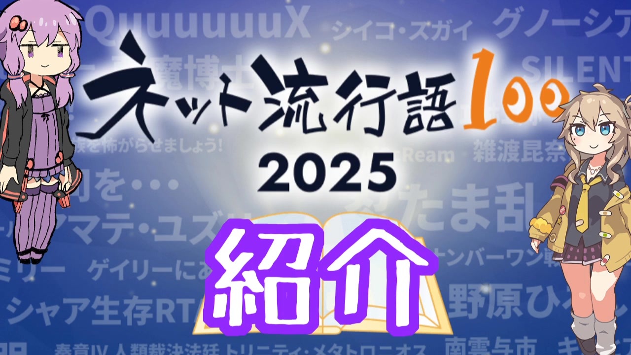 ドワンゴとピクシブが共同で企画する1年間においてネットで流行した言葉を決めるイベント<br>ネット流行語100をザッと紹介すます<br><br>どうでもい目安<br>紹介中の雪さんの目が<br>ガンギマリ:うp主は知っている<br>普通 :名前は知っている<br>ウィンク :知らなかった<br><br><br>その35⇒<a href="https://www.nicovideo.jp/watch/sm45669353" class="watch">sm45669353</a><br><br>part1⇒<a href="https://www.nicovideo.jp/watch/sm43894948" class="watch">sm43894948</a><br>解説済みのネタ一覧⇒<a href="https://docs.google.com/spreadsheets/d/13ZNY49m_mK0AZokz-TjV85o_aGCffPzBl7MtOX9wdow/edit?gid=0#gid=0" target="_blank" rel="noopener nofollow">https://docs.google.com/spreadsheets/d/13ZNY49m_mK0AZokz-TjV85o_aGCffPzBl7MtOX9wdow/edit?gid=0#gid=0</a><br><br>VOICEROID 女3人、居酒屋にて⇒<a href="https://www.nicovideo.jp/watch/sm45684742" class="watch">sm45684742</a><br>ゆかりさんのマダミス談義⇒<a href="https://www.nicovideo.jp/series/474362" target="_blank" rel="noopener">series/474362</a><br>ふつうの軽音部ふり返り⇒<a href="https://www.nicovideo.jp/series/490000" target="_blank" rel="noopener">series/490000</a><br>結月ゆかりが好きな曲を10曲、好きに語る。⇒<a href="https://www.nicovideo.jp/series/526133" target="_blank" rel="noopener">series/526133</a><br><br>【お借りしたもの】<br>くのださん<br>結月ゆかり 立ち絵<br><a href="https://seiga.nicovideo.jp/seiga/im10653504" target="_blank" rel="noopener nofollow">https://seiga.nicovideo.jp/seiga/im10653504</a><br><br>坂本アヒルさん<br>春日部つむぎ立ち絵素材<br><a href="https://seiga.nicovideo.jp/seiga/im10849150" target="_blank" rel="noopener nofollow">https://seiga.nicovideo.jp/seiga/im10849150</a><br><br>moikyさん<br>WhiteCUL立ち絵素材<br><a href="https://seiga.nicovideo.jp/seiga/im11047926" target="_blank" rel="noopener nofollow">https://seiga.nicovideo.jp/seiga/im11047926</a><br><br>moikyさん<br>中部つるぎ立ち絵素材<br><a href="https://seiga.nicovideo.jp/seiga/im11543405?track=seiga_illust_keyword" target="_blank" rel="noopener nofollow">https://seiga.nicovideo.jp/seiga/im11543405?track=seiga_illust_keyword</a><br><br><br>苦情など⇒<a href="https://x.com/extra403" target="_blank" rel="noopener nofollow">https://x.com/extra403</a><br>ようつべ版⇒<a href="https://youtu.be/01fG3APgAjQ" target="_blank" rel="noopener nofollow">https://youtu.be/01fG3APgAjQ</a>