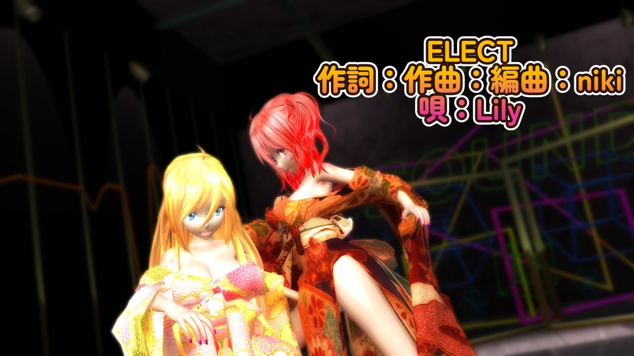◆楽曲<br>ELECT<br>作詞・作曲・編曲:niki<br>唄:Lily<br><a href="https://www.nicovideo.jp/watch/sm22587884" class="watch">sm22587884</a><br><br>◆モーション<br>・【東方MMD】Elect 【モーション配布】 Paul Su様 (<a href="https://www.nicovideo.jp/watch/sm23197682" class="watch">sm23197682</a>)<br>・ELECTカメラモーション 2022年度版 紫音美菜<br>・ELECT表情リップモーション 紫音美菜<br><br>◆モデル<br>・Tda式 Lily kimono style 改変:紫音美菜<br>・Tda式 重音テト kimono style 改変:紫音美菜<br><br>◆アクセサリ<br>・フラワーネックレス ねこる様 (<a href="https://seiga.nicovideo.jp/seiga/im4144872" target="_blank" rel="noopener">im4144872</a>)<br><br>◆ステージ<br>・ネオンサウンドステージ 栗ごはん様 (<a href="https://seiga.nicovideo.jp/seiga/im11133128" target="_blank" rel="noopener">im11133128</a>)<br><br><br><br />■シェーダー・エフェクト / Shader & Effect<br>sdPBR480:サンドマン様<br><a href="https://www.nicovideo.jp/watch/sm43948524" class="watch">sm43948524</a><br>そぼろ様<br><a href="https://www.nicovideo.jp/watch/sm19123817" class="watch">sm19123817</a><br><a href="https://seiga.nicovideo.jp/seiga/im3061709" target="_blank" rel="noopener">im3061709</a><br><a href="https://www.nicovideo.jp/watch/sm16087751" class="watch">sm16087751</a><br>おたもん様<br><a href="https://seiga.nicovideo.jp/seiga/im1763840" target="_blank" rel="noopener">im1763840</a><br><a href="https://seiga.nicovideo.jp/seiga/im1561862" target="_blank" rel="noopener">im1561862</a><br><a href="https://seiga.nicovideo.jp/seiga/im2992119" target="_blank" rel="noopener">im2992119</a><br>化身バレッタ様<br><a href="https://www.nicovideo.jp/watch/sm20916681" class="watch">sm20916681</a><br><a href="https://seiga.nicovideo.jp/seiga/im4505494" target="_blank" rel="noopener">im4505494</a><br><br>■ツール・編集 / Tools & Software<br>MikuMikuDance:樋口優様<br><a href="https://www.nicovideo.jp/watch/sm2420025" class="watch">sm2420025</a><br>MikuMikuEffect:舞力介入P様<br><a href="https://www.nicovideo.jp/watch/sm12149815" class="watch">sm12149815</a><br>MikuMikuPlus:さくや様<br><a href="https://www.nicovideo.jp/watch/sm34761249" class="watch">sm34761249</a><br>VmdSizing:miu様<br><a href="https://seiga.nicovideo.jp/seiga/im9755721" target="_blank" rel="noopener">im9755721</a><br>Wondershare Filmora 15<br><br>--------------------------------------------------<br>・動画を見て下さり有難う御座います。<br>・Thank you for watching the video.<br>・영상을 봐주셔서 감사합니다.<br>・感谢您观看视频。<br><br>この動画は転載禁止です。<br>This video may not be reproduced.<br>이 동영상은 무단 전재를 금합니다.<br>本视频不得复制<br>--------------------------------------------------<br><br><br><br><br><br><br><br><br><br>