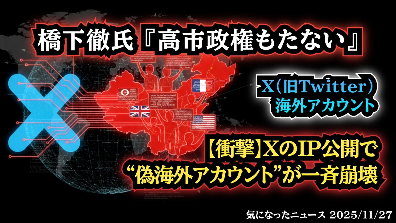 大変ずれ込んでおりますが<br>気になった情報でございます<br><br>【日本の親中派も露呈?】◆XのIP公開で露呈した“海外偽装アカウント”の正体 ロンドン発信の裏は中国本土 ~ 世界を覆う情報操作網の実態◆橋下徹『高市政権もたない』<br><br>Xが導入した「IP透明化」は、プラットフォームの風景を一変させました。<br>長年“海外在住ユーザー”として活動していた一部のアカウントが、実はまったく異なる場所から操作されていた可能性が浮上し、世界中に衝撃が走ります。ロンドンやロサンゼルスを名乗る発信者の背後に、どんな組織が存在していたのか。そして、なぜ彼らは海外を装う必要があったのか──。表向きには普通の投稿に見えていたメッセージの影に、国境を越えた“ある仕組み”が動いていたことが示唆されます。今回明らかになった事実は、その巨大な構造のごく一部にすぎません。<br><br>◆今回の台本&詳細<a href="https://keiichiro8140.hatenablog.com/entry/25112777222" target="_blank" rel="noopener nofollow">https://keiichiro8140.hatenablog.com/entry/25112777222</a><br><br>◆これまでの動画<a href="https://x.gd/sPXoJ" target="_blank" rel="noopener nofollow">https://x.gd/sPXoJ</a><br><br>◆もしも(BAN)の時のためのマイリンク集<a href="https://lit.link/K-16-news-44" target="_blank" rel="noopener nofollow">https://lit.link/K-16-news-44</a><br><br>ご覧いただきありがとうございます<br>m(_ _)m<br>気になったニュース 2025/11/27<br><br />著作権、肖像権に配慮して作成しております。<br><br>◆気になったニュースの台本!?<br>メモ代わりに作った台本をそのままあげてます<br><a href="https://keiichiro8140.hatenablog.com/." target="_blank" rel="noopener nofollow">https://keiichiro8140.hatenablog.com/.</a><br><br><br>ここからはシリーズ紹介<br><br><br>◆ ワクチン解毒・デトックス<br><a href="https://x.gd/fZweg" target="_blank" rel="noopener nofollow">https://x.gd/fZweg</a><br><br>◆ウイリアム・マキス博士のがん治療(イベルメクチン・フェンベンダゾール等)<br><a href="https://x.gd/AtFYS" target="_blank" rel="noopener nofollow">https://x.gd/AtFYS</a><br><br>◆予防接種健康被害救済制度<br><a href="https://x.gd/0xK9x" target="_blank" rel="noopener nofollow">https://x.gd/0xK9x</a><br><br>◆気になったニュース #1501~<br><br>◆ 【ショートver】気になったニュース<br><a href="https://x.gd/7MxXC" target="_blank" rel="noopener nofollow">https://x.gd/7MxXC</a><br><br>◆ 気になったニュース #1001~<br><a href="https://x.gd/Lp8gv" target="_blank" rel="noopener nofollow">https://x.gd/Lp8gv</a><br><br>◆ 気になったニュース #501~<br><a href="https://x.gd/EmbS4" target="_blank" rel="noopener nofollow">https://x.gd/EmbS4</a><br><br>◆ 気になったニュース #1~#500<br><a href="https://x.gd/uPhNb" target="_blank" rel="noopener nofollow">https://x.gd/uPhNb</a><br><br>◆ X(旧Twitter)・テレグラムで気になった情報<br><a href="https://x.gd/YG6FT" target="_blank" rel="noopener nofollow">https://x.gd/YG6FT</a><br><br>◆ 日比谷5万人パレードデ⚪生放送アーカイブ動画<br><a href="https://x.gd/3CHJv" target="_blank" rel="noopener nofollow">https://x.gd/3CHJv</a><br><br>◆日比谷5万人パレード⚪モのマイリスト作ってみました<br><a href="https://nico.ms/mylist/76828848?ref=sp_other" target="_blank" rel="noopener nofollow">https://nico.ms/mylist/76828848?ref=sp_other</a><br><br>◆3.30 令和の百姓⚪⚪<br><a href="https://www.nicovideo.jp/series/511791?ref=garage_share_other" target="_blank" rel="noopener nofollow">https://www.nicovideo.jp/series/511791?ref=garage_share_other</a><br><br>◆ 及川幸久さんの【XNEWS】シリーズ<br><a href="https://x.gd/3k78K" target="_blank" rel="noopener nofollow">https://x.gd/3k78K</a><br><br>◆これまでの動画<a href="https://x.gd/sPXoJ" target="_blank" rel="noopener nofollow">https://x.gd/sPXoJ</a><br><br>◆もしも(BAN)の時のためのマイリンク集<a href="https://lit.link/K-16_News44" target="_blank" rel="noopener nofollow">https://lit.link/K-16_News44</a><br><br>