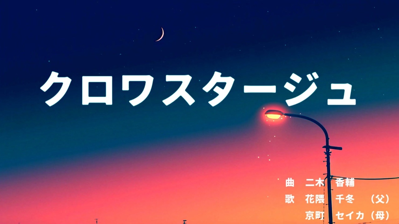 8作目<br><i>~親から子への想い そこには 愛しかないわ~</i><br><br>クロワ…「croissant(クロワッサン、三日月)」<br>スタージュ…「storgḗ(ストルゲー、親子間の愛)」<br><br>歌 花隈千冬(父役)、京町セイカ(母役)<br>曲 二木香輔<br>動画 二木香輔<br><br>無色透名祭3投稿曲の有色版です<br>---<br>(父)<br>友達同士でも 金の話はするな<br>連帯保証に サインは絶対するな<br>職場で政治宗教の 話はするな<br>偉くなるな 体を壊すまで<br><br>するな するな するな ばかりだけど<br><br>そこには 愛しかないわ<br><br>愛しか、ない<br>愛しか、ない<br>愛しか、ない<br><br>愛しかないわ<br><br>三日月は 今日も照らす 遠くから<br><br>そこには 愛しかないわ<br><br>愛しか、ない<br>愛しか、ない<br>愛しか、ない<br><br>愛しかないわ<br><br>三日月は 白く輝く こうこうと<br><br>心配しないで 分かってるよ<br>そちらも どうか 元気で<br><br>(母)<br>夜中にカップラーメンを 食べるのやめろ<br>腹は冷やすな 寝るとき毛布は掛けろ<br>寝っ転がったまま ゲームの画面見るな<br>若いつもりで 体に無理を<br><br>かけるな するな するな ばかりだけど<br><br>そこには 愛しかないわ<br><br>愛しか、ない<br>愛しか、ない<br>愛しか、ない<br><br>愛しかないわ<br><br>三日月は 今日も照らす 遠くから<br><br>そこには 愛しかないわ<br><br>愛しか、ない<br>愛しか、ない<br>愛しか、ない<br><br>愛しかないわ<br><br>三日月は 白く輝く こうこうと<br><br>心配しないで 分かってるよ<br>そちらも どうか 元気で<br>