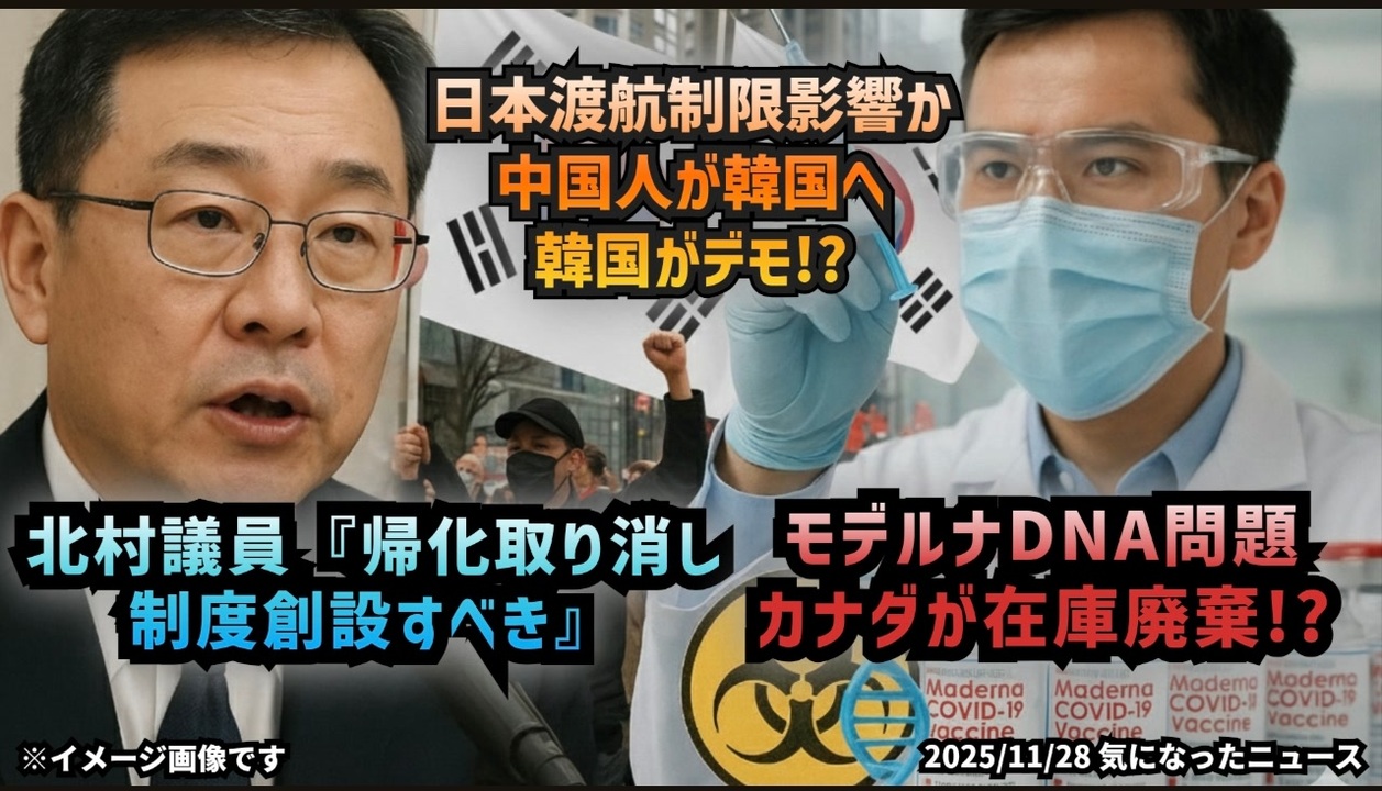◆北村晴男議員『帰化を取り消すことができる制度を創設すべき』◆日本渡航制限で中国人が流入し韓国がデモ!?◆ウイルス作る側とワクチン作る側は同じ◆モデルナDNA問題、カナダが在庫廃棄<br><br>X(旧Twitter)上で、いくつかの投稿が注目を集めています。<br>北村晴男議員は、帰化後に反日感情や遵法精神の欠如が客観的に明らかになった場合、帰化を取り消す制度の創設を提案したと発言。これに賛同の声が上がっています。<br>また、中国が日本への渡航を自粛要請したことで、中国人が韓国へ流入し、現地で抗議デモが発生したという投稿も拡散。<br>さらに、ワクチン関連では「モデルナが特許でDNAの挿入突然変異リスクに言及している」「査読前研究でワクチンバイアルにDNA断片が残留していたとされる」「カナダが在庫廃棄を命じたと投稿されている」など、重大な主張が共有されています。<br>アメリカでは、ある議員が「前政権が制度を乱用しなければ確認作業は不要だった」と述べ、USCISの取り組みを支持する内容も投稿されています。<br><br>◆今回の台本(詳細)<a href="https://keiichiro8140.hatenablog.com/entry/112888111" target="_blank" rel="noopener nofollow">https://keiichiro8140.hatenablog.com/entry/112888111</a><br><br>◆これまでの動画<a href="https://x.gd/sPXoJ" target="_blank" rel="noopener nofollow">https://x.gd/sPXoJ</a> <br><br>◆もしも(BAN)の時のためのマイリンク集<a href="https://lit.link/K16_888" target="_blank" rel="noopener nofollow">https://lit.link/K16_888</a> <br><br>ご覧いただきありがとうございます<br>m(_ _)m <br><br>気になったニュース 2025/11/28<br><br />著作権、肖像権に配慮して作成しております。<br><br>◆気になったニュースの台本!?<br>メモ代わりに作った台本をそのままあげてます<br><a href="https://keiichiro8140.hatenablog.com/." target="_blank" rel="noopener nofollow">https://keiichiro8140.hatenablog.com/.</a><br><br><br>ここからはシリーズ紹介<br><br><br>◆ ワクチン解毒・デトックス<br><a href="https://x.gd/fZweg" target="_blank" rel="noopener nofollow">https://x.gd/fZweg</a><br><br>◆ウイリアム・マキス博士のがん治療(イベルメクチン・フェンベンダゾール等)<br><a href="https://x.gd/AtFYS" target="_blank" rel="noopener nofollow">https://x.gd/AtFYS</a><br><br>◆予防接種健康被害救済制度<br><a href="https://x.gd/0xK9x" target="_blank" rel="noopener nofollow">https://x.gd/0xK9x</a><br><br>◆気になったニュース #1501~<br><br>◆ 【ショートver】気になったニュース<br><a href="https://x.gd/7MxXC" target="_blank" rel="noopener nofollow">https://x.gd/7MxXC</a><br><br>◆ 気になったニュース #1001~<br><a href="https://x.gd/Lp8gv" target="_blank" rel="noopener nofollow">https://x.gd/Lp8gv</a><br><br>◆ 気になったニュース #501~<br><a href="https://x.gd/EmbS4" target="_blank" rel="noopener nofollow">https://x.gd/EmbS4</a><br><br>◆ 気になったニュース #1~#500<br><a href="https://x.gd/uPhNb" target="_blank" rel="noopener nofollow">https://x.gd/uPhNb</a><br><br>◆ X(旧Twitter)・テレグラムで気になった情報<br><a href="https://x.gd/YG6FT" target="_blank" rel="noopener nofollow">https://x.gd/YG6FT</a><br><br>◆ 日比谷5万人パレードデ⚪生放送アーカイブ動画<br><a href="https://x.gd/3CHJv" target="_blank" rel="noopener nofollow">https://x.gd/3CHJv</a><br><br>◆日比谷5万人パレード⚪モのマイリスト作ってみました<br><a href="https://nico.ms/mylist/76828848?ref=sp_other" target="_blank" rel="noopener nofollow">https://nico.ms/mylist/76828848?ref=sp_other</a><br><br>◆3.30 令和の百姓⚪⚪<br><a href="https://www.nicovideo.jp/series/511791?ref=garage_share_other" target="_blank" rel="noopener nofollow">https://www.nicovideo.jp/series/511791?ref=garage_share_other</a><br><br>◆ 及川幸久さんの【XNEWS】シリーズ<br><a href="https://x.gd/3k78K" target="_blank" rel="noopener nofollow">https://x.gd/3k78K</a><br><br>◆これまでの動画<a href="https://x.gd/sPXoJ" target="_blank" rel="noopener nofollow">https://x.gd/sPXoJ</a><br><br>◆もしも(BAN)の時のためのマイリンク集<a href="https://lit.link/K-16_News44" target="_blank" rel="noopener nofollow">https://lit.link/K-16_News44</a><br><br>