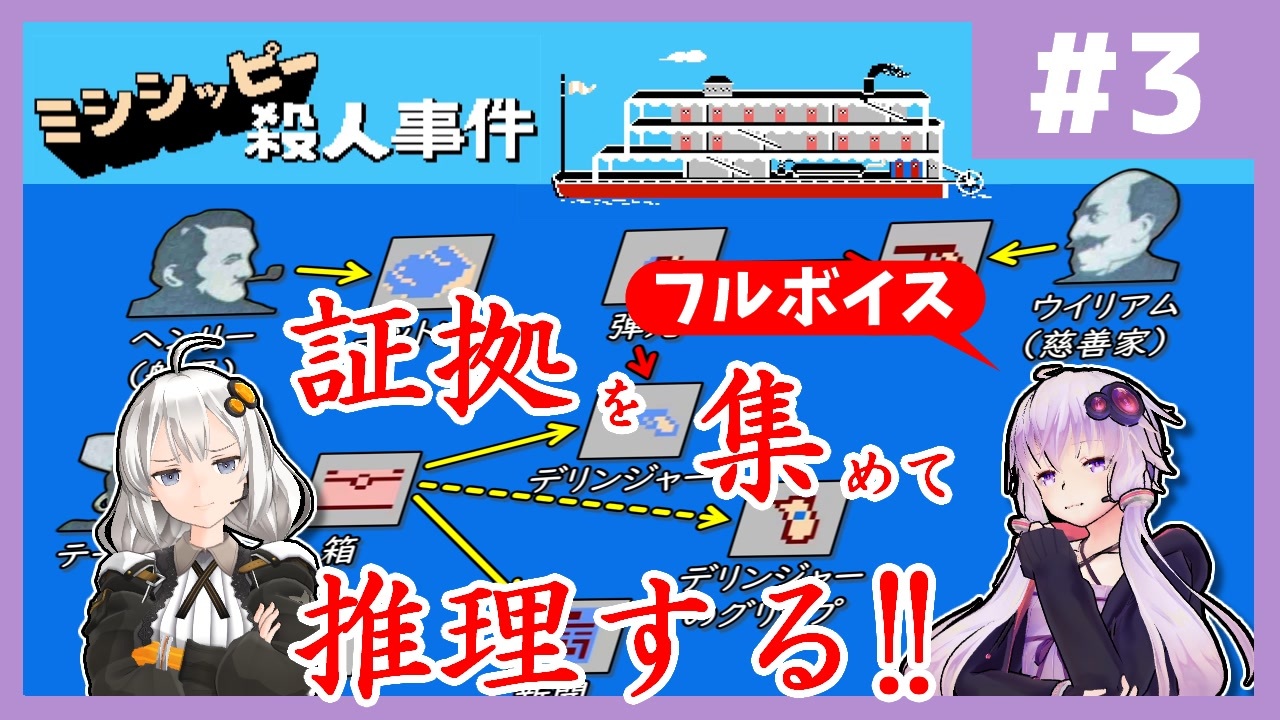 伝説のゲームの内容をきちんと理解して攻略したい!<br>そういう目的の実況です。<br>証拠を集めて犯人を追い詰めます!<br><br>毎週金曜21時投稿です!<br>※当動画にはネタバレが含まれます。ご注意ください。<br><br>リンク<br>------<br>前 : <a href="https://www.nicovideo.jp/watch/sm45648816" class="watch">sm45648816</a><br>次 : <a href="https://www.nicovideo.jp/watch/sm45719843" class="watch">sm45719843</a><br><br>シリーズ : <a href="https://www.nicovideo.jp/series/538703" target="_blank" rel="noopener">series/538703</a><br><br>YouTube : <a href="https://www.youtube.com/@YuzukingtonYukari" target="_blank" rel="noopener nofollow">https://www.youtube.com/@YuzukingtonYukari</a><br><br>チャプター<br>----------<br><a href="#" class="seekTime" data-seekTime="00:00" onclick="seekNicoPlayer('#00:00'); return false;">#00:00</a> OP<br><a href="#" class="seekTime" data-seekTime="00:35" onclick="seekNicoPlayer('#00:35'); return false;">#00:35</a> 振り返り<br><a href="#" class="seekTime" data-seekTime="02:04" onclick="seekNicoPlayer('#02:04'); return false;">#02:04</a> 捜査開始~聞き込み開始<br><a href="#" class="seekTime" data-seekTime="06:24" onclick="seekNicoPlayer('#06:24'); return false;">#06:24</a> 聞こ込み:ブラウンについて<br><a href="#" class="seekTime" data-seekTime="07:14" onclick="seekNicoPlayer('#07:14'); return false;">#07:14</a> 聞こ込み:ディジーについて<br><a href="#" class="seekTime" data-seekTime="08:11" onclick="seekNicoPlayer('#08:11'); return false;">#08:11</a> 聞こ込み:ヘレンについて<br><a href="#" class="seekTime" data-seekTime="12:26" onclick="seekNicoPlayer('#12:26'); return false;">#12:26</a> 聞こ込み:テーラーについて<br><a href="#" class="seekTime" data-seekTime="14:02" onclick="seekNicoPlayer('#14:02'); return false;">#14:02</a> 聞こ込み:ヘンリーについて<br><a href="#" class="seekTime" data-seekTime="18:12" onclick="seekNicoPlayer('#18:12'); return false;">#18:12</a> 証拠品を調べる<br><a href="#" class="seekTime" data-seekTime="20:25" onclick="seekNicoPlayer('#20:25'); return false;">#20:25</a> 推理パート & ED<br><br>ゲーム<br>------<br>ミシシッピー殺人事件 - ファミリー・コンピュータ (FC)<br><br>出演者<br>------<br>実況・解説・チャールズ卿<br> CV : VOICEROID:結月ゆかり<br>実況・解説・ワトソン(助手)<br> CV : VOICEROID:紲星あかり<br>ネルソン(船長)<br> CV : VOICEVOX:青山龍星<br>ディジー<br> CV : VOICEVOX:春日部つむぎ<br>カーター(判事)<br> CV : VOICEVOX:麒ヶ島宗麟<br>ウイリアム(慈善家)<br> CV : VOICEVOX:†聖騎士 紅桜†<br>テーラー<br> CV : VOICEVOX:もち子(cv 明日葉よもぎ)<br>ヘレン(富豪)<br> CV : VOICEVOX:後鬼<br>ヘンリー(船員)<br> CV : VOICEVOX:玄野武宏