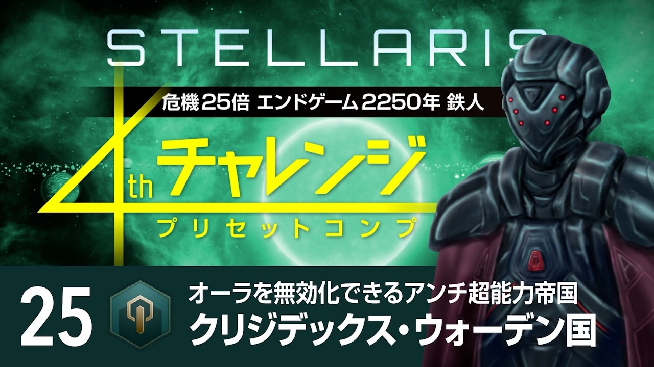 プリセット帝国で危機25倍エンドゲーム2250年鉄人モードに挑むシリーズのハイライト編集版です。<br>「いいね」にこのプリセット帝国の初心者へのおすすめ度を入れています。<br><br>☆無編集版<br><a href="https://www.youtube.com/playlist?list=PLKTCcuX4WBFk-XouExjXM1EgdvSVqJ5ar" target="_blank" rel="noopener nofollow">https://www.youtube.com/playlist?list=PLKTCcuX4WBFk-XouExjXM1EgdvSVqJ5ar</a><br><br>☆チャレンジの詳細(予告編)<br><a href="https://www.nicovideo.jp/watch/sm39832845" class="watch">sm39832845</a><br><br>☆ゲーム<br>・Stellaris v4.1.7<br><br>☆設定<br>・危機:25倍<br>・ミッドゲーム:2225年<br>・エンドゲーム:2250年<br>・難易度:元帥<br>・鉄人モード:ON<br>・その他:デフォルト<br><br>☆DLC<br>・シャドウオブザシュラウドまで全部<br><br>☆MOD<br>・[4.0] Compact UI Topbar Expanded<br>・Improved Topbar - Extended<br>・Tech Tiers Revealed<br><br>☆ナレーション<br>四国めたん(VOICEVOX)<br><br /><br><span style="color: #262626;">1stチャレンジ(国際地球連合編)⇒ </span><span style="color: #0000ff;"><a href="https://www.nicovideo.jp/series/157544" target="_blank" rel="noopener">series/157544</a></span><br><span style="color: #262626;">2ndチャレンジ(人類共同体編)⇒ </span><span style="color: #0000ff;"><a href="https://www.nicovideo.jp/series/182469" target="_blank" rel="noopener">series/182469</a></span><br><span style="color: #262626;">3rdチャレンジ(ロク機械主義国編)⇒ </span><span style="color: #0000ff;"><a href="https://www.nicovideo.jp/series/207056" target="_blank" rel="noopener">series/207056</a></span><br><span style="color: #262626;">4thチャレンジ(プリセットコンプ)⇒ </span><span style="color: #0000ff;"><a href="https://www.nicovideo.jp/series/287612" target="_blank" rel="noopener">series/287612</a></span><br><span style="color: #262626;">Stellarisマルチプレイ ⇒ </span><span style="color: #0000ff;"><a href="https://www.nicovideo.jp/series/367123" target="_blank" rel="noopener">series/367123</a></span><br><span style="color: #262626;">Stellaris検証動画 ⇒ </span><span style="color: #0000ff;"><a href="https://www.nicovideo.jp/series/202576" target="_blank" rel="noopener">series/202576</a></span><br><span style="color: #262626;">Stellaris妄想動画 ⇒ </span><span style="color: #0000ff;"><a href="https://www.nicovideo.jp/series/310298" target="_blank" rel="noopener">series/310298</a></span><br>Stellaris1分動画祭 ⇒ <a href="https://www.nicovideo.jp/series/404730" target="_blank" rel="noopener">series/404730</a><br><br><br><a target="_blank" href="https://qa.nicovideo.jp/faq/show/19424?site_domain=default" style="font-size: 13px;color: #657586; text-decoration: underline; line-height: 1.4">この動画は投稿者によって修正されました</a>