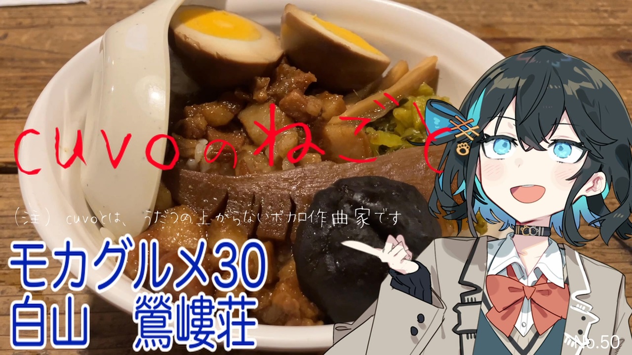 こんにちは!<br>cuvoのねごと、第50回です!<br><br>いつも見てくださる皆さんのおかげで<br>シリーズ「モカグルメ」が<br>第30弾を迎えることができました<br><br>今回は、都営三田線の白山駅にある<br>鶯嶁荘(オルソー)に行ってきました♪<br>※漢字が読めません!<br><br>久々に魯肉飯を食べましたが<br>めっちゃ美味しかったです!<br><br>「これが至福ってやつですかぁ!」<br><br>気になった方は、ぜひ行ってみてくださいね!<br><br><br>ーーーーーーー<br>▼Xで発信中!cuvoのねごと<br><a href="https://twitter.com/cuvo_jpn" target="_blank" rel="noopener nofollow">https://twitter.com/cuvo_jpn</a><br><br><br>▼エンディングテーマ<br>「飲みに行こう」<br>曲:cuvo / 詞:vie<br>歌:seven(neutrino)<br><br>↓ニコ動<br><a href="https://nico.ms/sm41946436" target="_blank" rel="noopener nofollow">https://nico.ms/sm41946436</a><br><br>↓YouTube<br><a href="https://youtu.be/aJWyRuT7cGk" target="_blank" rel="noopener nofollow">https://youtu.be/aJWyRuT7cGk</a><br><br>ーーーーーーーーーーーーーーーーー<br><br />ニコニコ動画(cuvo:ボカロ曲)<br><a href="https://www.nicovideo.jp/user/123099454/video" target="_blank" rel="noopener nofollow">https://www.nicovideo.jp/user/123099454/video</a><br><br>YouTube<br><a href="https://www.youtube.com/channel/UCeyFWGAsM1u0r7XpT0yeDPA/" target="_blank" rel="noopener nofollow">https://www.youtube.com/channel/UCeyFWGAsM1u0r7XpT0yeDPA/</a><br><br>X(旧Twitter)<br><a href="https://twitter.com/cuvo_jpn" target="_blank" rel="noopener nofollow">https://twitter.com/cuvo_jpn</a><br><br>Instagram<br><a href="https://www.instagram.com/cuvo_jpn/" target="_blank" rel="noopener nofollow">https://www.instagram.com/cuvo_jpn/</a>
