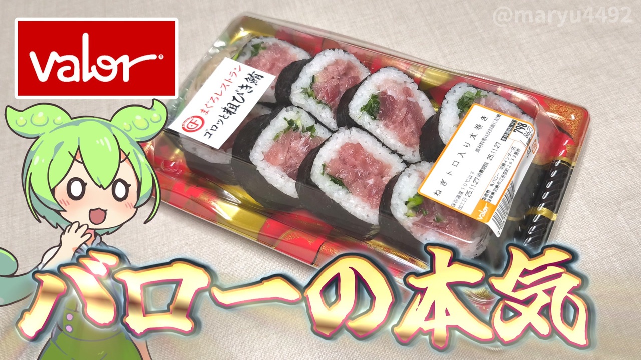 数年前くらいから魚に力を入れ出した印象があるバローですが<br>特に存在感を出しているのがお寿司。<br>今回は美味しそうなねぎとろ巻を買ってみました。<br><br><br><br>【関連動画】<br>おいしいもの総選挙2024で最高金賞受賞!<br>食品スーパーバローの「まぐろ握り鮨(1580円)」2024.09.29<br>※ニコニコ動画休止中の動画のため、YouTubeになります。<br><a href="https://www.youtube.com/watch?v=IvV7kEMVT6k" target="_blank" rel="noopener nofollow">https://www.youtube.com/watch?v=IvV7kEMVT6k</a><br><br>【参考】<br>まぐろレストラン<br><a href="https://www.maguro-restaurant.co.jp/" target="_blank" rel="noopener nofollow">https://www.maguro-restaurant.co.jp/</a><br>ダイエンフーズ直営まぐろレストラン<br>リニューアルオープンのお知らせ ※PDFファイル 2018.11.07(株式会社ダイエンフーズ)<br><a href="https://valorholdings.co.jp/wp-content/uploads/2018/11/news20181107-2.pdf" target="_blank" rel="noopener nofollow">https://valorholdings.co.jp/wp-content/uploads/2018/11/news20181107-2.pdf</a><br>バローが関東初出店、横浜下永谷店を11月21日オープン<br>生鮮強化型デスティネーション・ストアの「ショールーム」2025.11.25(リテール・リーダーズ)<br><a href="https://retailguide.tokubai.co.jp/store/71276/" target="_blank" rel="noopener nofollow">https://retailguide.tokubai.co.jp/store/71276/</a><br>肉半額に「えぐー!」岐阜発スーパー「バロー」<br>関東初出店…2時間待ちの行列も 低価格は大量仕入れで実現<br>2025.11.24(FNNプライムオンライン YouTube)<br><a href="https://www.youtube.com/watch?v=i_ucZJRonac" target="_blank" rel="noopener nofollow">https://www.youtube.com/watch?v=i_ucZJRonac</a><br><br>【使用した素材】(※敬称略) <br>(合成音声)VOICEVOX/ずんだもん/四国めたん<br><a href="https://voicevox.hiroshiba.jp/" target="_blank" rel="noopener nofollow">https://voicevox.hiroshiba.jp/</a> <br>(立ち絵)坂本アヒル<br> <a href="https://seiga.nicovideo.jp/seiga/im10788496" target="_blank" rel="noopener nofollow">https://seiga.nicovideo.jp/seiga/im10788496</a><br>(楽曲)甘茶の音楽工房/「楽しい麦畑」「フルーツパフェ」「お城の舞踏会」<br><a href="https://amachamusic.chagasi.com/" target="_blank" rel="noopener nofollow">https://amachamusic.chagasi.com/</a>