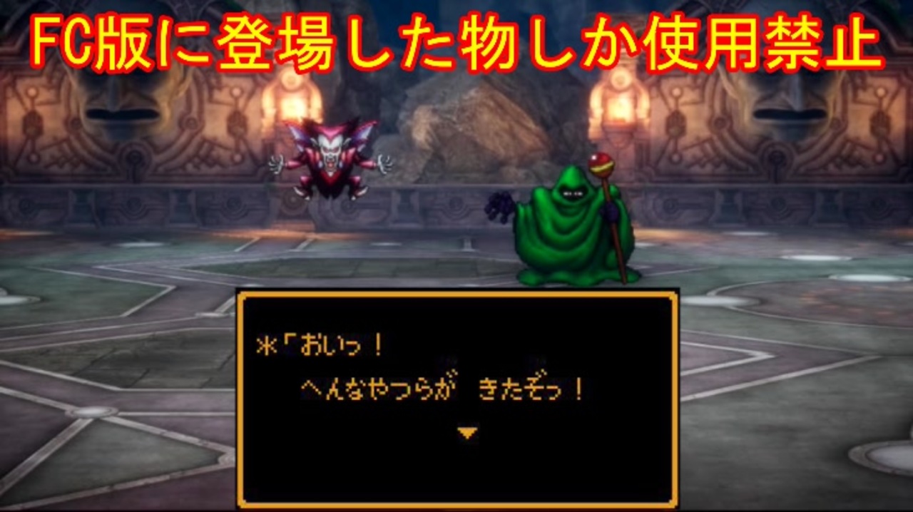 まさかコイツのネタ行動に苦戦させられるとは思いませんでした。<br>こういう普段は味わえない意外な展開があるこそ、縛りプレイは面白いんですよね。<br><br>前→<a href="https://www.nicovideo.jp/watch/sm45678957" class="watch">sm45678957</a><br>次→<a href="https://www.nicovideo.jp/watch/sm45752617" class="watch">sm45752617</a><br>YouTube版→<a href="https://youtu.be/2lUiCsI1iBE" target="_blank" rel="noopener nofollow">https://youtu.be/2lUiCsI1iBE</a><br><br>縛りルール<br>①FC版にない武器・防具・道具・呪文・特技・職業は使用禁止。<br><br>②アイテム回収禁止。<br><br>③バトルロード禁止。<br><br>④遊び人には転職不可。<br><br>⑤めいれいさせろ固定。<br><br>⑥ふくろは使わない。<br><br>⑦上限レベルはHD2D版公式ガイドブックの目標レベル+3まで。<br><br><br>※ネタバレ注意です<br><br>この動画で利用している株式会社スクウェア・エニックスを代表とする共同著作者が権利を所有する著作物及びスギヤマ工房有限会社が権利を所有する楽曲の転載・配布は禁止いたします。<br>© ARMOR PROJECT/BIRD STUDIO/SPIKE CHUNSOFT/SQUARE ENIX<br>© SUGIYAMA KOBO<br>℗ SUGIYAMA KOBO<br><br>AquesTalk2ライセンスID:AQTK2WINUSR23122185<br /><br><br>❤いいねを押していただけるとモチベーションと投稿速度が上がるので宜しくお願い致します!<br><br>作者ツイッター→ <a href="https://twitter.com/nig0117" target="_blank" rel="noopener nofollow">https://twitter.com/nig0117</a><br>PIXIV FANBOX→ <a href="https://sutanokeiji.fanbox.cc/" target="_blank" rel="noopener nofollow">https://sutanokeiji.fanbox.cc/</a><br><br>( 以前はWEB小説書いてました→ <a href="https://kakuyomu.jp/works/1177354054884910267" target="_blank" rel="noopener nofollow">https://kakuyomu.jp/works/1177354054884910267</a> )