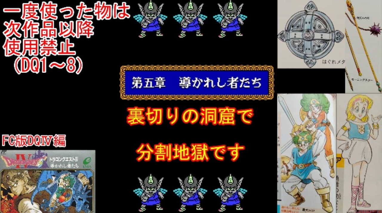 DQⅣの1周目、FCDQⅣ編part6です。<br>裏切りの洞窟なら予想を裏切って、あっさりクリアできるとかあっても良かったのに……。<br><br>前→<a href="https://www.nicovideo.jp/watch/sm45657684" class="watch">sm45657684</a><br>次→<a href="https://www.nicovideo.jp/watch/sm45686636" class="watch">sm45686636</a><br><br>YouTube版→<a href="https://youtu.be/rhnMUkt84dE" target="_blank" rel="noopener nofollow">https://youtu.be/rhnMUkt84dE</a><br><br>縛りルール(詳細はpart1参照)<br>①一度使った武器・防具・装飾品・道具・呪文・特技は<br> 次作品以降使用禁止。(売却も解禁扱い)<br><br> 一度使った職業(3,6,7)・仲間モンスター(5,6)・スカウトモンスター(8)は<br> 戦士(Ⅲ)、戦士(Ⅵ)のようにナンバリングで分類し次作品以降使用禁止。<br> また複数体加入できる仲間モンスターは一体まで。<br><br>②裏技、バグ技、全滅、逃走、おどかす禁止。<br> またダンジョン攻略とボス戦における状況再現禁止。<br><br>③ダンジョンとボス攻略は、全キャラのレベルを突入時、<br> 1周目は目標レベル+5。2周目は+10。3周目は+15まで。<br> ラスボスの目標レベルは45。裏ボスは50とする。<br>(目標レベルは各公式ガイドブックを参照)<br><br>④1周目はEDまで。2周目は裏ボス撃破まで。<br> 3周目は全てのボスを規定回数、規定ターン以内に倒す。<br>(回避可能なボスも倒し、闇ゾーマは3周全てで倒す)<br><br><br><span style="color: #262626;">※一部機種は互換機を使用してのプレイとなりますが、倍速機能やクイックセーブ・ロード、チートなどは一切使用しません。</span><br><br>※ネタバレ注意です<br><br>この動画で利用している株式会社スクウェア・エニックスを代表とする共同著作者が権利を所有する著作物及びスギヤマ工房有限会社が権利を所有する楽曲の転載・配布は禁止いたします。<br>(C) ARMOR PROJECT/BIRD STUDIO/SQUARE ENIX All Rights Reserved.<br>(C) SUGIYAMA KOBO (P) SUGIYAMA KOBO<br><br>AquesTalk2ライセンスID:AQTK2WINUSR23122185<br /><br><br>❤いいねを押していただけるとモチベーションと投稿速度が上がるので宜しくお願い致します!<br><br>作者ツイッター→ <a href="https://twitter.com/nig0117" target="_blank" rel="noopener nofollow">https://twitter.com/nig0117</a><br>PIXIV FANBOX→ <a href="https://sutanokeiji.fanbox.cc/" target="_blank" rel="noopener nofollow">https://sutanokeiji.fanbox.cc/</a><br><br>( 以前はWEB小説書いてました→ <a href="https://kakuyomu.jp/works/1177354054884910267" target="_blank" rel="noopener nofollow">https://kakuyomu.jp/works/1177354054884910267</a> )