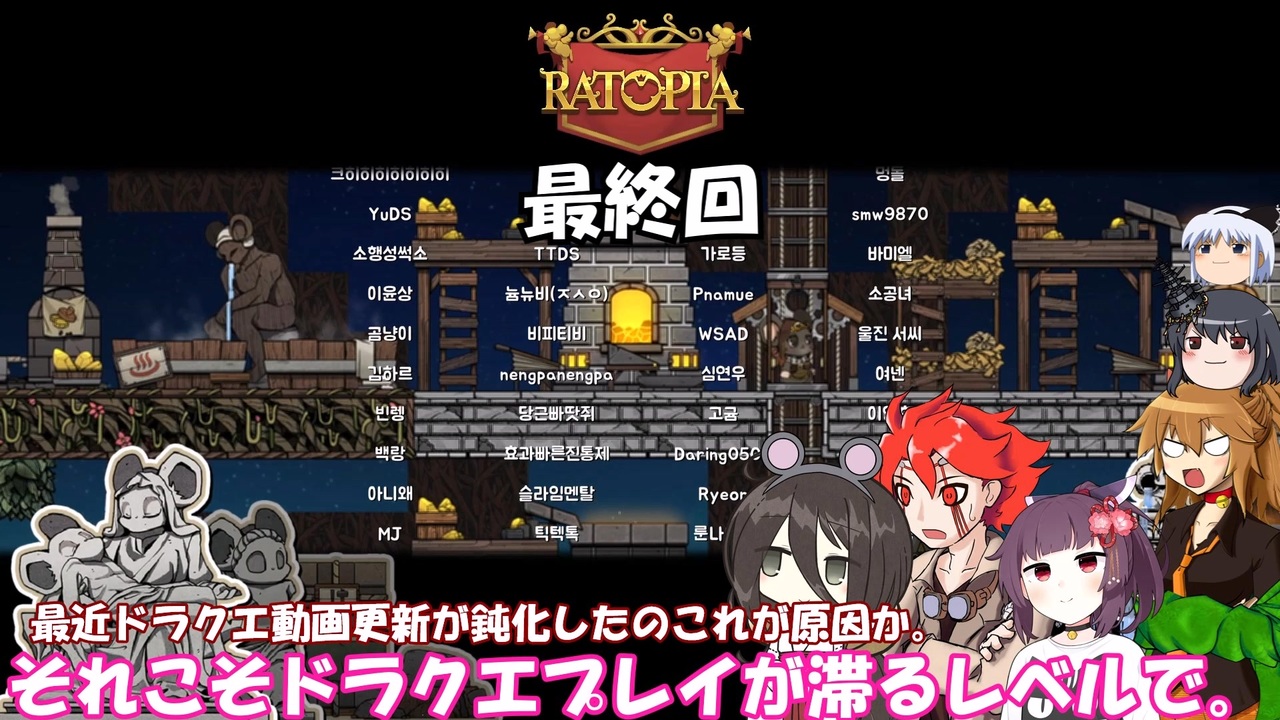 この動画はスチーム版Ratopiaの実況動画でした。<br><br>※幾つか難易度を優しくするMODが導入されております。<br>また、高確率で失踪予定!<br>(なにせ何度かプレイして全部襲撃全滅ENDしておりますゆえ)<br><br><br><a href="https://www.nicovideo.jp/watch/sm45675564" class="watch">sm45675564</a>← 前 おしまい( ˘ω˘)<br>その1リスト →<a href="https://www.nicovideo.jp/mylist/58364125" target="_blank" rel="noopener">mylist/58364125</a> <br><br>VOICEVOX:春日部つむぎ(ネコ耳) 九州そら(山城) 雨晴はう(妖夢)<br> 青山龍星(ドラムカン) 東北きりたん(東北きりたん)<br> あいちゃん(中国うさぎ(立ち絵:akihiyo様作 立ち中国うさぎ素材 <a href="https://seiga.nicovideo.jp/seiga/im11211212" target="_blank" rel="noopener">im11211212</a>))<br>Voiceroid:東北きりたん(立ち絵:このりEX様作 東北きりたん立ち絵素材5 <a href="https://seiga.nicovideo.jp/seiga/im10819054" target="_blank" rel="noopener">im10819054</a>)<br>