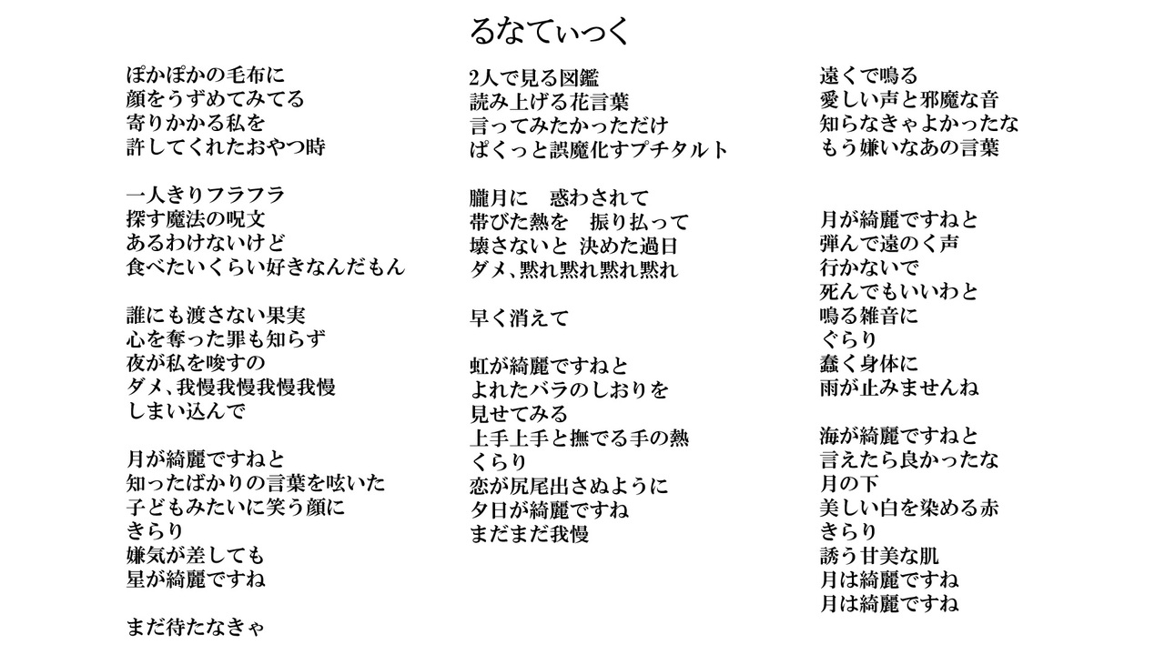 原曲:<a href="https://www.nicovideo.jp/watch/sm45162372" class="watch">sm45162372</a>(ルナフィリアver)<br> <a href="https://www.nicovideo.jp/watch/sm45164088" class="watch">sm45164088</a>(重音テトver)<br>歌:ルナフィリア(ボカデュオver)<br>重音テトSV(ボカロver)<br><a href="https://www.youtube.com/@Lunaphilia" target="_blank" rel="noopener nofollow">https://www.youtube.com/@Lunaphilia</a><br><a href="https://x.com/Lunaphilia0716" target="_blank" rel="noopener nofollow">https://x.com/Lunaphilia0716</a><br>Music:あらたなり<br><a href="https://youtube.com/@arata.nari.songwriter" target="_blank" rel="noopener nofollow">https://youtube.com/@arata.nari.songwriter</a><br><a href="https://x.com/arata_nari" target="_blank" rel="noopener nofollow">https://x.com/arata_nari</a><br>Movie:WAYA<br><a href="https://www.youtube.com/@wayawayadabesa" target="_blank" rel="noopener nofollow">https://www.youtube.com/@wayawayadabesa</a><br><a href="https://x.com/wayadabesa" target="_blank" rel="noopener nofollow">https://x.com/wayadabesa</a><br>Mix&Arrange:Katsuhide<br><a href="https://youtube.com/@katsuhide_m" target="_blank" rel="noopener nofollow">https://youtube.com/@katsuhide_m</a><br><a href="https://x.com/katsuhide_m" target="_blank" rel="noopener nofollow">https://x.com/katsuhide_m</a><br><br>整理番号:mei-129<br><br>無名歌唱祭2025:<a href="https://www.nicovideo.jp/mylist/79048408" target="_blank" rel="noopener">mylist/79048408</a>
