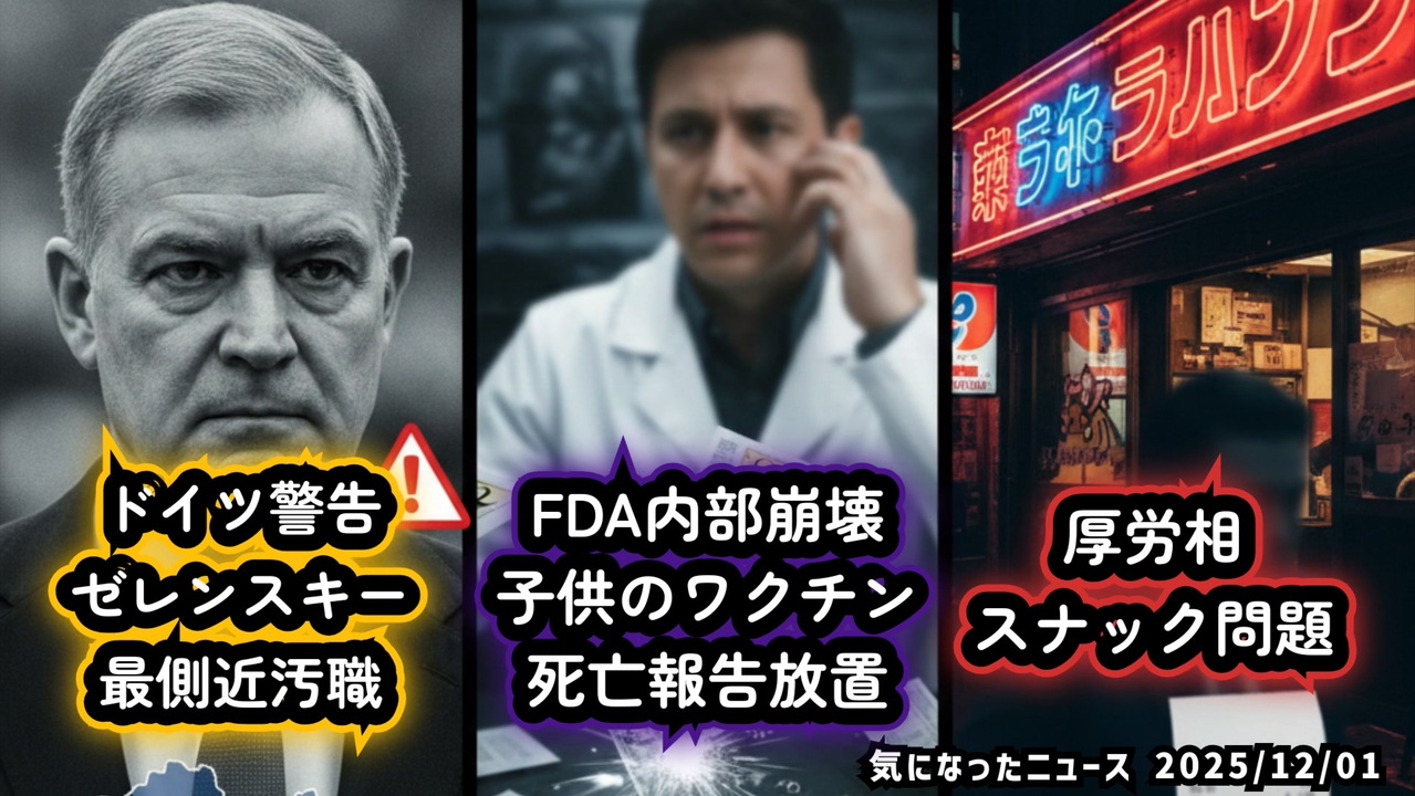 ◆オールドメディアも報じた!ゼレンスキー最側近汚職辞任、ドイツが警告◆FDA内部崩壊 ~ 子供のワクチン死 「死亡報告を放置してきたのは問題」◆上野厚労大臣スナック問題 ~ 不可解支出<br><br>ドイツ警告/FDA爆発/厚労相スナック問題<br><br>あらすじ<br>ドイツ政府がウクライナ情勢をめぐり「極めて深刻」とする疑惑に直面する一方、アメリカではFDAトップ医師が内部メールで“子どものワクチン関連死の可能性”に言及し、審査制度そのものへの疑問が噴出しています。さらに日本では、厚労相の政治資金によるスナック支出が波紋を広げ、説明責任が問われています。<br><br><br><br>◆今回の台本&詳細<a href="https://keiichiro8140.hatenablog.com/entry/25120111" target="_blank" rel="noopener nofollow">https://keiichiro8140.hatenablog.com/entry/25120111</a><br><br>◆これまでの動画<a href="https://x.gd/sPXoJ" target="_blank" rel="noopener nofollow">https://x.gd/sPXoJ</a><br><br>◆もしも(BAN)の時のためのマイリンク集<a href="https://lit.link/K-16_News44" target="_blank" rel="noopener nofollow">https://lit.link/K-16_News44</a><br><br>ご覧いただきありがとうございます<br>m(_ _)m<br>気になったニュース 2025/12/01<br><br />著作権、肖像権に配慮して作成しております。<br><br>◆気になったニュースの台本!?<br>メモ代わりに作った台本をそのままあげてます<br><a href="https://keiichiro8140.hatenablog.com/." target="_blank" rel="noopener nofollow">https://keiichiro8140.hatenablog.com/.</a><br><br><br>ここからはシリーズ紹介<br><br><br>◆ ワクチン解毒・デトックス<br><a href="https://x.gd/fZweg" target="_blank" rel="noopener nofollow">https://x.gd/fZweg</a><br><br>◆ウイリアム・マキス博士のがん治療(イベルメクチン・フェンベンダゾール等)<br><a href="https://x.gd/AtFYS" target="_blank" rel="noopener nofollow">https://x.gd/AtFYS</a><br><br>◆予防接種健康被害救済制度<br><a href="https://x.gd/0xK9x" target="_blank" rel="noopener nofollow">https://x.gd/0xK9x</a><br><br>◆気になったニュース #1501~<br><br>◆ 【ショートver】気になったニュース<br><a href="https://x.gd/7MxXC" target="_blank" rel="noopener nofollow">https://x.gd/7MxXC</a><br><br>◆ 気になったニュース #1001~<br><a href="https://x.gd/Lp8gv" target="_blank" rel="noopener nofollow">https://x.gd/Lp8gv</a><br><br>◆ 気になったニュース #501~<br><a href="https://x.gd/EmbS4" target="_blank" rel="noopener nofollow">https://x.gd/EmbS4</a><br><br>◆ 気になったニュース #1~#500<br><a href="https://x.gd/uPhNb" target="_blank" rel="noopener nofollow">https://x.gd/uPhNb</a><br><br>◆ X(旧Twitter)・テレグラムで気になった情報<br><a href="https://x.gd/YG6FT" target="_blank" rel="noopener nofollow">https://x.gd/YG6FT</a><br><br>◆ 日比谷5万人パレードデ⚪生放送アーカイブ動画<br><a href="https://x.gd/3CHJv" target="_blank" rel="noopener nofollow">https://x.gd/3CHJv</a><br><br>◆日比谷5万人パレード⚪モのマイリスト作ってみました<br><a href="https://nico.ms/mylist/76828848?ref=sp_other" target="_blank" rel="noopener nofollow">https://nico.ms/mylist/76828848?ref=sp_other</a><br><br>◆3.30 令和の百姓⚪⚪<br><a href="https://www.nicovideo.jp/series/511791?ref=garage_share_other" target="_blank" rel="noopener nofollow">https://www.nicovideo.jp/series/511791?ref=garage_share_other</a><br><br>◆ 及川幸久さんの【XNEWS】シリーズ<br><a href="https://x.gd/3k78K" target="_blank" rel="noopener nofollow">https://x.gd/3k78K</a><br><br>◆これまでの動画<a href="https://x.gd/sPXoJ" target="_blank" rel="noopener nofollow">https://x.gd/sPXoJ</a><br><br>◆もしも(BAN)の時のためのマイリンク集<a href="https://lit.link/K-16_News44" target="_blank" rel="noopener nofollow">https://lit.link/K-16_News44</a><br><br>