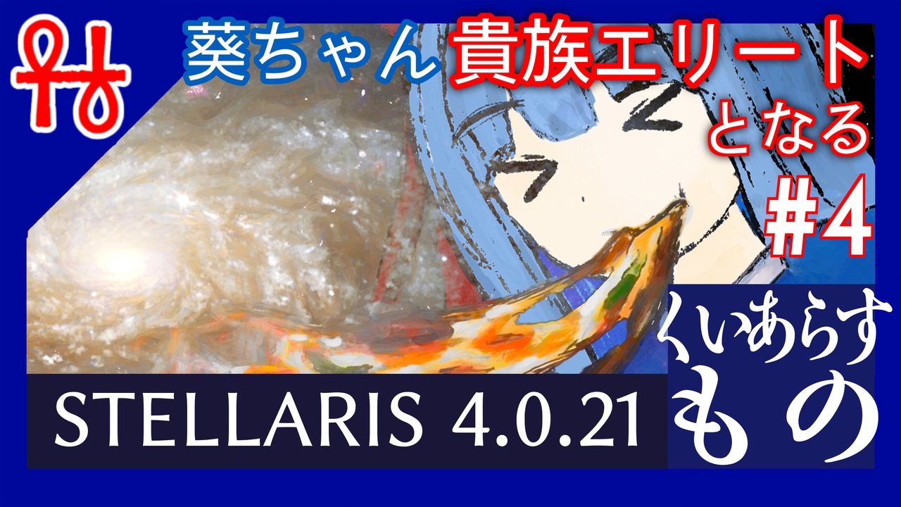 葵ちゃんはマローダー傭兵を使って二つの帝国を撃破するが、大ハーンの覚醒により傭兵は契約を破棄して帰国した。艦隊を失った葵ちゃんは新たな危機を乗り越えられるのか?<br>第一話→ <a href="https://www.nicovideo.jp/watch/sm45140519" class="watch">sm45140519</a><br>第二話→ <a href="https://www.nicovideo.jp/watch/sm45248115" class="watch">sm45248115</a><br>第三話→ <a href="https://www.nicovideo.jp/watch/sm45381991" class="watch">sm45381991</a><br>---<br>Stellaris / Paradox Development Studio<br> Paradox Interactive, 2016 ;<br> <a href="https://store.steampowered.com/app/281990/Stellaris/" target="_blank" rel="noopener nofollow">https://store.steampowered.com/app/281990/Stellaris/</a><br>出演:<br> A.I.VOICE:琴葉葵 琴葉茜 結月ゆかり 紲星あかり GUMI<br> SynthesizerV 2: 琴葉葵 琴葉茜<br> VOICEROID2: 東北きりたん(EX) 京町セイカ(EX) 音街ウナ<br> VOICEPEAK:京町セイカ 音街ウナ フリモメン<br> CeVIO AI: ささとうささら すずきつづみ タカハシアマト<br> 夏色花梨 小春六花 花隈千冬<br> CeVIO CS: ささとうささら<br> VOICEVOX: 四国めたん 中部つるぎ 麒ヶ島宗麟<br>BGM:<br> ♪ドヴォルザーク交響曲第7番第一楽章 アレンジ<br> マーラー『大地の歌』第1楽章 インストゥルメンタル アレンジ<br> ♪O Vos Omnes / Tomas Luis de Victoria アレンジ feat. IA<br> ♪ポロヴィツ人の踊り / ボロディン feat. 琴葉茜・葵<br> EU4より『Ride Forth Victoriously』アレンジ<br>画像:<br> <a href="https://commons.wikimedia.org/wiki/" target="_blank" rel="noopener nofollow">https://commons.wikimedia.org/wiki/</a> より:<br> Whirpool_Galaxy.jpg / NASA; パブリックドメイン<br>---<br>YouTube版:<br><a href="https://youtu.be/jwOhgQQKCKo" target="_blank" rel="noopener nofollow">https://youtu.be/jwOhgQQKCKo</a>