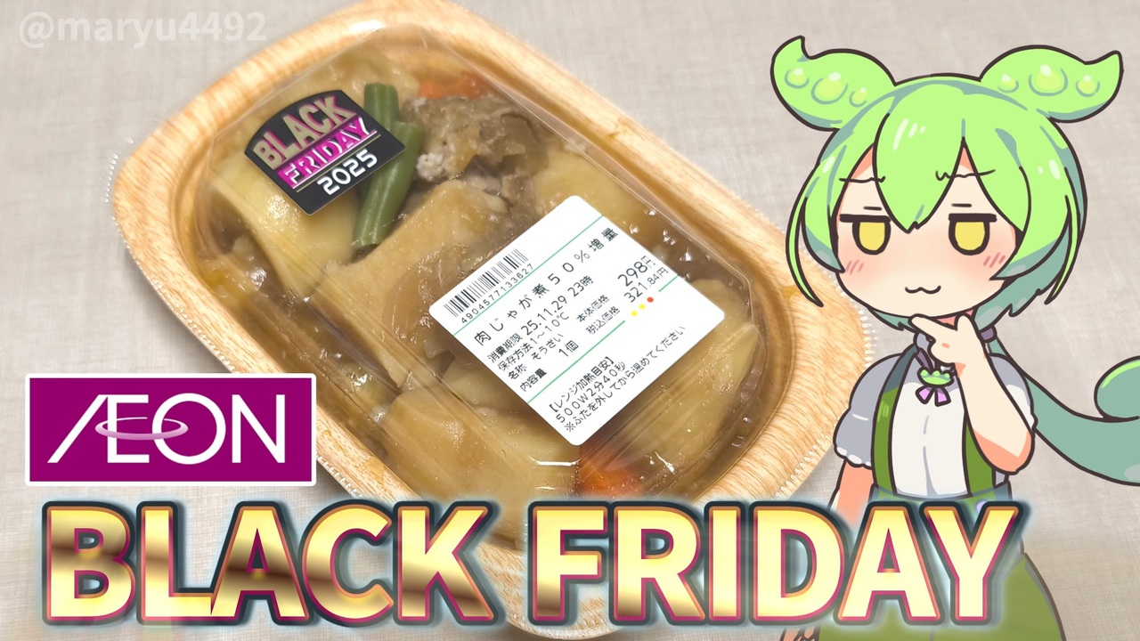 イオンのブラックフライデー期間中に肉じゃが煮が50%増量されていました。<br>なぜ肉じゃがなんだろう…<br><br><br><br>【関連動画】<br>ロピアの「串に刺さってない焼鳥三昧(777円)」2025.06.14<br><a href="https://www.nicovideo.jp/watch/sm45082747" target="_blank" rel="noopener nofollow">https://www.nicovideo.jp/watch/sm45082747</a><br><br>【参考】<br>令和6年産春植えばれいしょの作付面積、収穫量及び出荷量 2025.02.04(農林水産省)<br><a href="https://www.maff.go.jp/j/tokei/kekka_gaiyou/sakumotu/sakkyou_yasai/r6/haru_bare/index.html" target="_blank" rel="noopener nofollow">https://www.maff.go.jp/j/tokei/kekka_gaiyou/sakumotu/sakkyou_yasai/r6/haru_bare/index.html</a><br><br>【使用した素材】(※敬称略) <br>(合成音声)VOICEVOX/ずんだもん/四国めたん<br><a href="https://voicevox.hiroshiba.jp/" target="_blank" rel="noopener nofollow">https://voicevox.hiroshiba.jp/</a> <br>(立ち絵)坂本アヒル<br> <a href="https://seiga.nicovideo.jp/seiga/im10788496" target="_blank" rel="noopener nofollow">https://seiga.nicovideo.jp/seiga/im10788496</a><br>(楽曲)甘茶の音楽工房/「楽しい麦畑」「フルーツパフェ」「お城の舞踏会」<br><a href="https://amachamusic.chagasi.com/" target="_blank" rel="noopener nofollow">https://amachamusic.chagasi.com/</a>