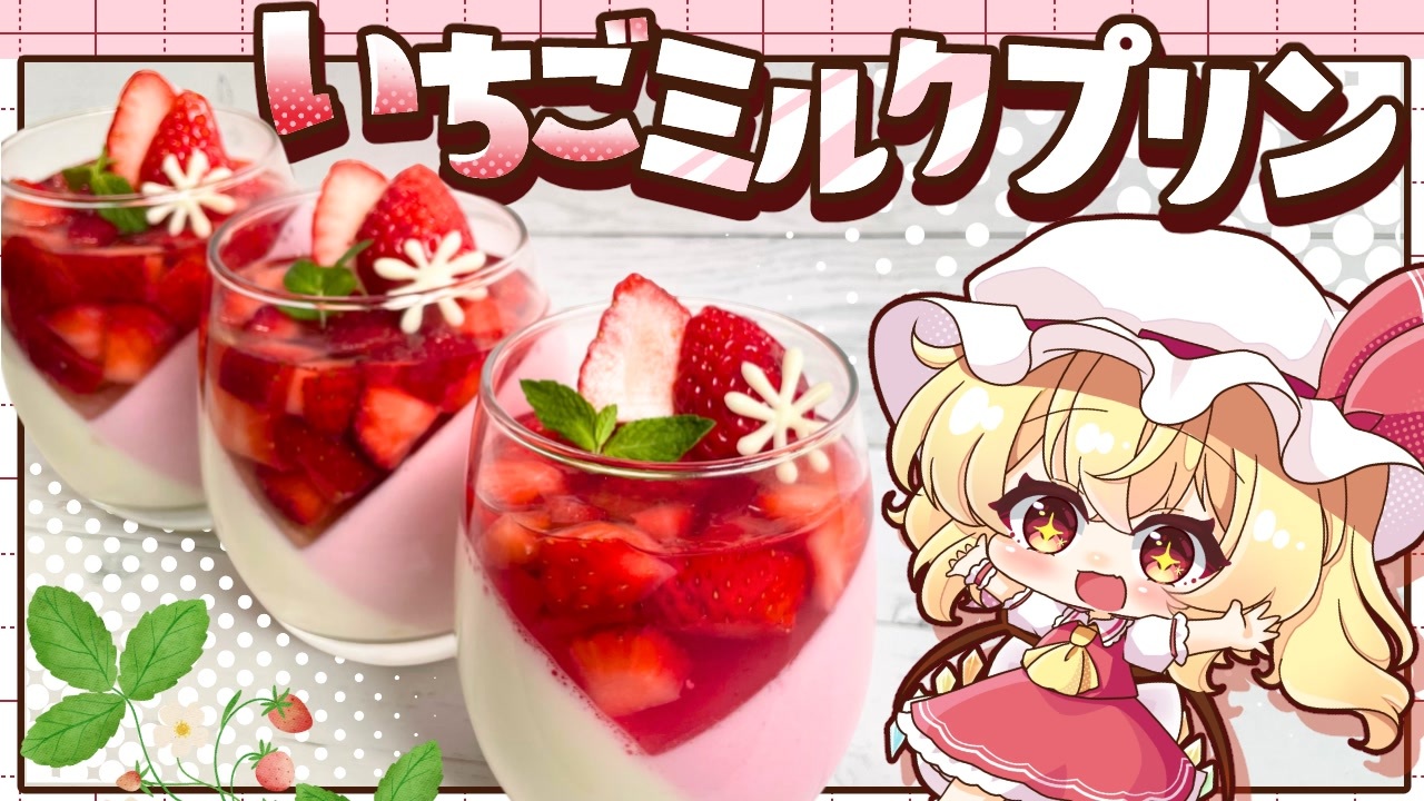まだまだいちごが高い季節なので少しアレですが…<br>色は12月感あるかなと思いアップさせて頂きました🌷<br><br>※現在投稿している動画の立ち絵は最新のものになっておりますが、<br>クリスマスやバレンタイン動画などまだ旧作立ち絵の動画でアップできていないものもあるので、まだ両方の動画が入り混じることもあります…!<br><br>┈┈┈┈┈┈┈┈┈┈┈┈┈┈┈┈┈┈┈<br><br>Youtube投稿日:2025/02/23<br><br>ー--------------<br><br>▼各種リンク一覧<br><a href="https://lit.link/koumakan-kichin" target="_blank" rel="noopener nofollow">https://lit.link/koumakan-kichin</a><br><br>▼紅魔館キッチンTwitter<br><a href="https://twitter.com/koumakankitchen?s=21&t=KYO6d_6EU-UVPuTV1rlWYw" target="_blank" rel="noopener nofollow">https://twitter.com/koumakankitchen?s=21&t=KYO6d_6EU-UVPuTV1rlWYw</a><br><br>▼紅魔キッチンYoutube<br><a href="https://www.youtube.com/@%E7%B4%85%E9%AD%94%E9%A4%A8%E3%82%AD%E3%83%83%E3%83%81%E3%83%B3" target="_blank" rel="noopener nofollow">https://www.youtube.com/@%E7%B4%85%E9%AD%94%E9%A4%A8%E3%82%AD%E3%83%83%E3%83%81%E3%83%B3</a><br><br><br>∴∵∴∴∵∴∴∵∴∴∵∴∴∵∴∴∵∴∴∵∴∴∵∴<br><br>【3層いちごミルクプリン(グラス2個分)】<br><br> 〈1&2層目のベース〉 <br>○牛乳 …300㎖ <br>○ゼラチン …5g<br> →以下、これを合わせたものを「★」と言います! <br><br>〈第1層〉 <br>○★の半分 …150㎖ <br>○砂糖 …大さじ1.5 <br>○練乳 …大さじ1 <br><br>〈第2層〉<br>○★の半分 …150㎖ <br>○いちごジャム …適量 <br><br>〈第3層〉 <br>○白ワイン …100㎖ <br>○お水 …50㎖ <br>○レモン汁 …大さじ1 <br>○お砂糖 …10g <br>○ゼラチン …5g<br><br> <br>∴∵∴∴∵∴∴∵∴∴∵∴∴∵∴∴∵∴∴∵∴∴∵∴<br><br><br>~クレジット~<br><br>◇編集ソフト:YMM4(ライセンス購入済)<br>◇立ち絵 :自作<br>以下、よくお借りする素材(敬称略)<br>◇音楽:効果音ラボ<br>OtoLogic<br>◇BGM: 甘茶の音楽工房、DOVA SYNDROME<br>◇その他イラスト:イラストAC、いらすとや、ニコニココモンズ等…<br><br>※この動画は【東方project】【上海アリス幻樂団】を<br>元に作成した二次創作作品となります。<br>(二次創作ガイドライン:<a href="https://touhou-project.news/guideline/)" target="_blank" rel="noopener nofollow">https://touhou-project.news/guideline/)</a><br>#東方 #ゆっくり #ゆっくり料理 #ゆっくり実況 #ゆっくり茶番