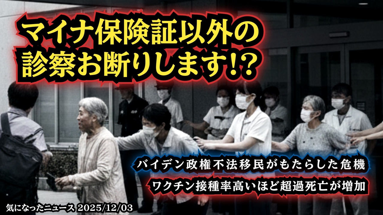 ◆マイナ保険証しか診療しない病院がある!?【陰謀論ではなく現実】◆バイデン政権による不法移民大量輸入がもたらした危機◆ドイツ研究:ワクチン接種率の高い州ほど超過死亡が増加<br><br>あらすじ<br>マイナ保険証の混乱、現場が知らない「資格確認証」。そしてドイツで報告された、ワクチン接種率と超過死亡の“不可解な相関”。医療制度の迷走とデータが示す異変が、今それぞれ別の場所で同時進行しています。さらにアメリカでは、スティーブン・ミラー氏が語った“不法移民大量受け入れスキーム”の真相が再び注目され、民主主義の根幹を揺るがす動きだと警鐘が鳴らされました。制度への信頼、命を守る仕組み、国家運営の正当性──それらが静かに問われるニュースをまとめて追います。<br><br>◆今回の台本&詳細<a href="https://keiichiro8140.hatenablog.com/entry/25120333111" target="_blank" rel="noopener nofollow">https://keiichiro8140.hatenablog.com/entry/25120333111</a><br><br>◆これまでの動画<a href="https://x.gd/sPXoJ" target="_blank" rel="noopener nofollow">https://x.gd/sPXoJ</a><br><br>◆もしも(BAN)の時のためのマイリンク集<a href="https://lit.link/K-16_News44" target="_blank" rel="noopener nofollow">https://lit.link/K-16_News44</a><br><br>ご覧いただきありがとうございます<br>m(_ _)m<br>気になったニュース 2025/12/03<br><br />著作権、肖像権に配慮して作成しております。<br><br>◆気になったニュースの台本!?<br>メモ代わりに作った台本をそのままあげてます<br><a href="https://keiichiro8140.hatenablog.com/." target="_blank" rel="noopener nofollow">https://keiichiro8140.hatenablog.com/.</a><br><br><br>ここからはシリーズ紹介<br><br><br>◆ ワクチン解毒・デトックス<br><a href="https://x.gd/fZweg" target="_blank" rel="noopener nofollow">https://x.gd/fZweg</a><br><br>◆ウイリアム・マキス博士のがん治療(イベルメクチン・フェンベンダゾール等)<br><a href="https://x.gd/AtFYS" target="_blank" rel="noopener nofollow">https://x.gd/AtFYS</a><br><br>◆予防接種健康被害救済制度<br><a href="https://x.gd/0xK9x" target="_blank" rel="noopener nofollow">https://x.gd/0xK9x</a><br><br>◆気になったニュース #1501~<br><br>◆ 【ショートver】気になったニュース<br><a href="https://x.gd/7MxXC" target="_blank" rel="noopener nofollow">https://x.gd/7MxXC</a><br><br>◆ 気になったニュース #1001~<br><a href="https://x.gd/Lp8gv" target="_blank" rel="noopener nofollow">https://x.gd/Lp8gv</a><br><br>◆ 気になったニュース #501~<br><a href="https://x.gd/EmbS4" target="_blank" rel="noopener nofollow">https://x.gd/EmbS4</a><br><br>◆ 気になったニュース #1~#500<br><a href="https://x.gd/uPhNb" target="_blank" rel="noopener nofollow">https://x.gd/uPhNb</a><br><br>◆ X(旧Twitter)・テレグラムで気になった情報<br><a href="https://x.gd/YG6FT" target="_blank" rel="noopener nofollow">https://x.gd/YG6FT</a><br><br>◆ 日比谷5万人パレードデ⚪生放送アーカイブ動画<br><a href="https://x.gd/3CHJv" target="_blank" rel="noopener nofollow">https://x.gd/3CHJv</a><br><br>◆日比谷5万人パレード⚪モのマイリスト作ってみました<br><a href="https://nico.ms/mylist/76828848?ref=sp_other" target="_blank" rel="noopener nofollow">https://nico.ms/mylist/76828848?ref=sp_other</a><br><br>◆3.30 令和の百姓⚪⚪<br><a href="https://www.nicovideo.jp/series/511791?ref=garage_share_other" target="_blank" rel="noopener nofollow">https://www.nicovideo.jp/series/511791?ref=garage_share_other</a><br><br>◆ 及川幸久さんの【XNEWS】シリーズ<br><a href="https://x.gd/3k78K" target="_blank" rel="noopener nofollow">https://x.gd/3k78K</a><br><br>◆これまでの動画<a href="https://x.gd/sPXoJ" target="_blank" rel="noopener nofollow">https://x.gd/sPXoJ</a><br><br>◆もしも(BAN)の時のためのマイリンク集<a href="https://lit.link/K-16_News44" target="_blank" rel="noopener nofollow">https://lit.link/K-16_News44</a><br><br>