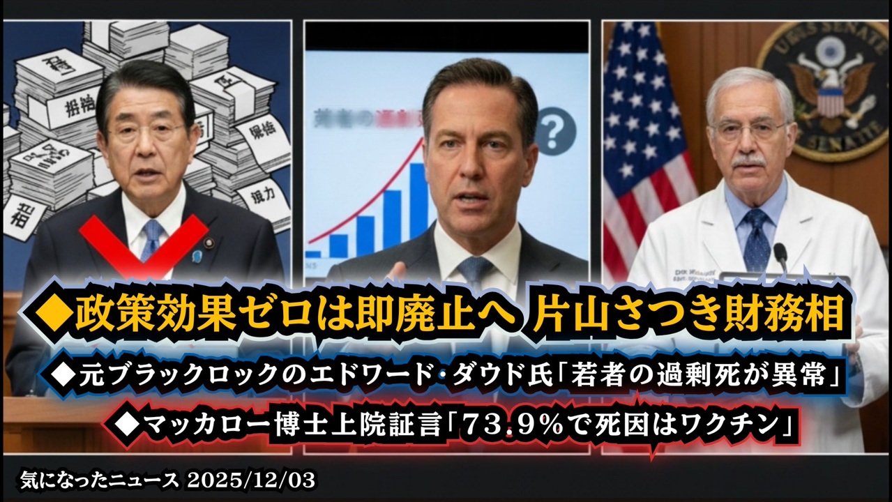 ◆政策効果ゼロは即廃止へ、片山さつき財務相大臣◆元ブラックロックのエドワード・ダウド氏「若者の過剰死が異常」◆マッカロー博士上院証言「73.9%で死因はワクチン」<br><br>あらすじ<br>いま世界の“権力のほころび”が、同時多発的に露わになっています。日本では財務相が、成果の薄い税優遇と補助金を切り捨てると明言し、長年の「聖域」にメスが入る兆し。海外では、NBC NewsがFDA内部メモを報じ、子どもの死亡例をめぐる議論が一気に加速。若年層の過剰死に疑問を呈する声も広がり、そして米上院では、剖検データを携えた専門家の証言が注目を集めています。<br><br>◆今回の台本&詳細<a href="https://keiichiro8140.hatenablog.com/entry/25120333222" target="_blank" rel="noopener nofollow">https://keiichiro8140.hatenablog.com/entry/25120333222</a><br><br>◆これまでの動画<a href="https://x.gd/sPXoJ" target="_blank" rel="noopener nofollow">https://x.gd/sPXoJ</a><br><br>◆もしも(BAN)の時のためのマイリンク集<a href="https://lit.link/K-16_News44" target="_blank" rel="noopener nofollow">https://lit.link/K-16_News44</a><br><br>ご覧いただきありがとうございます<br>m(_ _)m<br>気になったニュース 2025/12/03<br><br />著作権、肖像権に配慮して作成しております。<br><br>◆気になったニュースの台本!?<br>メモ代わりに作った台本をそのままあげてます<br><a href="https://keiichiro8140.hatenablog.com/." target="_blank" rel="noopener nofollow">https://keiichiro8140.hatenablog.com/.</a><br><br><br>ここからはシリーズ紹介<br><br><br>◆ ワクチン解毒・デトックス<br><a href="https://x.gd/fZweg" target="_blank" rel="noopener nofollow">https://x.gd/fZweg</a><br><br>◆ウイリアム・マキス博士のがん治療(イベルメクチン・フェンベンダゾール等)<br><a href="https://x.gd/AtFYS" target="_blank" rel="noopener nofollow">https://x.gd/AtFYS</a><br><br>◆予防接種健康被害救済制度<br><a href="https://x.gd/0xK9x" target="_blank" rel="noopener nofollow">https://x.gd/0xK9x</a><br><br>◆気になったニュース #1501~<br><br>◆ 【ショートver】気になったニュース<br><a href="https://x.gd/7MxXC" target="_blank" rel="noopener nofollow">https://x.gd/7MxXC</a><br><br>◆ 気になったニュース #1001~<br><a href="https://x.gd/Lp8gv" target="_blank" rel="noopener nofollow">https://x.gd/Lp8gv</a><br><br>◆ 気になったニュース #501~<br><a href="https://x.gd/EmbS4" target="_blank" rel="noopener nofollow">https://x.gd/EmbS4</a><br><br>◆ 気になったニュース #1~#500<br><a href="https://x.gd/uPhNb" target="_blank" rel="noopener nofollow">https://x.gd/uPhNb</a><br><br>◆ X(旧Twitter)・テレグラムで気になった情報<br><a href="https://x.gd/YG6FT" target="_blank" rel="noopener nofollow">https://x.gd/YG6FT</a><br><br>◆ 日比谷5万人パレードデ⚪生放送アーカイブ動画<br><a href="https://x.gd/3CHJv" target="_blank" rel="noopener nofollow">https://x.gd/3CHJv</a><br><br>◆日比谷5万人パレード⚪モのマイリスト作ってみました<br><a href="https://nico.ms/mylist/76828848?ref=sp_other" target="_blank" rel="noopener nofollow">https://nico.ms/mylist/76828848?ref=sp_other</a><br><br>◆3.30 令和の百姓⚪⚪<br><a href="https://www.nicovideo.jp/series/511791?ref=garage_share_other" target="_blank" rel="noopener nofollow">https://www.nicovideo.jp/series/511791?ref=garage_share_other</a><br><br>◆ 及川幸久さんの【XNEWS】シリーズ<br><a href="https://x.gd/3k78K" target="_blank" rel="noopener nofollow">https://x.gd/3k78K</a><br><br>◆これまでの動画<a href="https://x.gd/sPXoJ" target="_blank" rel="noopener nofollow">https://x.gd/sPXoJ</a><br><br>◆もしも(BAN)の時のためのマイリンク集<a href="https://lit.link/K-16_News44" target="_blank" rel="noopener nofollow">https://lit.link/K-16_News44</a><br><br>