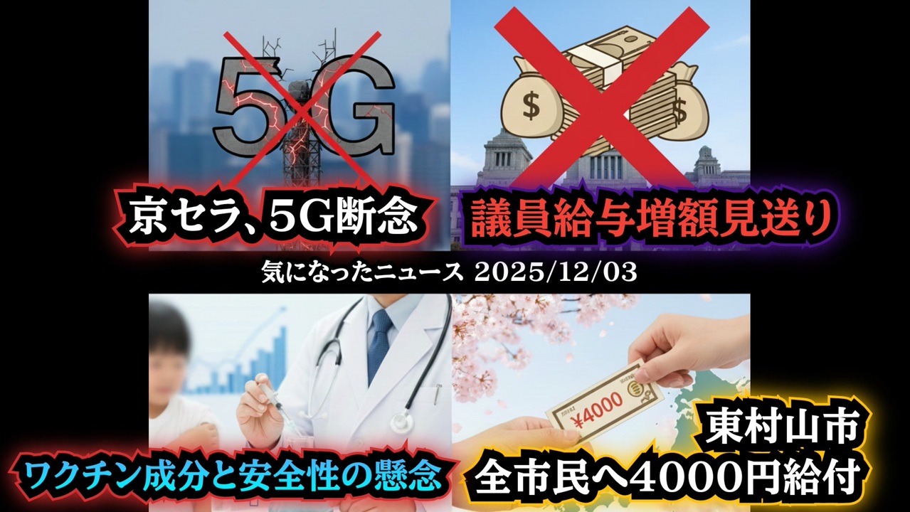 ◆京セラ、5G基地局開発を断念◆与党、国会議員給与増額法案の提出見送り◆テンペニー医師が語る「小児ワクチンの成分量」と安全性への懸念◆東京都東村山市が全市民に現金4千円給付へ<br><br>あらすじ<br>京セラが5G基地局事業から撤退を決め、国産通信インフラに向けた挑戦が静かに方向転換。政治の現場では、国会議員の給与増額案が「今は定数削減が先」との反発を受け提出見送りに。医療分野ではテンペニー医師が、小児ワクチン接種で蓄積する金属成分量に懸念を示す発言が話題に。生活面では、食料品高騰を受け東京都東村山市が市民全員へ4,000円を現金給付する支援策を発表。<br><br>◆今回の台本&詳細<a href="https://keiichiro8140.hatenablog.com/entry/25120333999" target="_blank" rel="noopener nofollow">https://keiichiro8140.hatenablog.com/entry/25120333999</a><br><br>◆これまでの動画<a href="https://x.gd/sPXoJ" target="_blank" rel="noopener nofollow">https://x.gd/sPXoJ</a><br><br>◆もしも(BAN)の時のためのマイリンク集<a href="https://lit.link/K-16_News44" target="_blank" rel="noopener nofollow">https://lit.link/K-16_News44</a><br><br>ご覧いただきありがとうございます<br>m(_ _)m<br>気になったニュース 2025/12/03<br><br />著作権、肖像権に配慮して作成しております。<br><br>◆気になったニュースの台本!?<br>メモ代わりに作った台本をそのままあげてます<br><a href="https://keiichiro8140.hatenablog.com/." target="_blank" rel="noopener nofollow">https://keiichiro8140.hatenablog.com/.</a><br><br><br>ここからはシリーズ紹介<br><br><br>◆ ワクチン解毒・デトックス<br><a href="https://x.gd/fZweg" target="_blank" rel="noopener nofollow">https://x.gd/fZweg</a><br><br>◆ウイリアム・マキス博士のがん治療(イベルメクチン・フェンベンダゾール等)<br><a href="https://x.gd/AtFYS" target="_blank" rel="noopener nofollow">https://x.gd/AtFYS</a><br><br>◆予防接種健康被害救済制度<br><a href="https://x.gd/0xK9x" target="_blank" rel="noopener nofollow">https://x.gd/0xK9x</a><br><br>◆気になったニュース #1501~<br><br>◆ 【ショートver】気になったニュース<br><a href="https://x.gd/7MxXC" target="_blank" rel="noopener nofollow">https://x.gd/7MxXC</a><br><br>◆ 気になったニュース #1001~<br><a href="https://x.gd/Lp8gv" target="_blank" rel="noopener nofollow">https://x.gd/Lp8gv</a><br><br>◆ 気になったニュース #501~<br><a href="https://x.gd/EmbS4" target="_blank" rel="noopener nofollow">https://x.gd/EmbS4</a><br><br>◆ 気になったニュース #1~#500<br><a href="https://x.gd/uPhNb" target="_blank" rel="noopener nofollow">https://x.gd/uPhNb</a><br><br>◆ X(旧Twitter)・テレグラムで気になった情報<br><a href="https://x.gd/YG6FT" target="_blank" rel="noopener nofollow">https://x.gd/YG6FT</a><br><br>◆ 日比谷5万人パレードデ⚪生放送アーカイブ動画<br><a href="https://x.gd/3CHJv" target="_blank" rel="noopener nofollow">https://x.gd/3CHJv</a><br><br>◆日比谷5万人パレード⚪モのマイリスト作ってみました<br><a href="https://nico.ms/mylist/76828848?ref=sp_other" target="_blank" rel="noopener nofollow">https://nico.ms/mylist/76828848?ref=sp_other</a><br><br>◆3.30 令和の百姓⚪⚪<br><a href="https://www.nicovideo.jp/series/511791?ref=garage_share_other" target="_blank" rel="noopener nofollow">https://www.nicovideo.jp/series/511791?ref=garage_share_other</a><br><br>◆ 及川幸久さんの【XNEWS】シリーズ<br><a href="https://x.gd/3k78K" target="_blank" rel="noopener nofollow">https://x.gd/3k78K</a><br><br>◆これまでの動画<a href="https://x.gd/sPXoJ" target="_blank" rel="noopener nofollow">https://x.gd/sPXoJ</a><br><br>◆もしも(BAN)の時のためのマイリンク集<a href="https://lit.link/K-16_News44" target="_blank" rel="noopener nofollow">https://lit.link/K-16_News44</a><br><br>