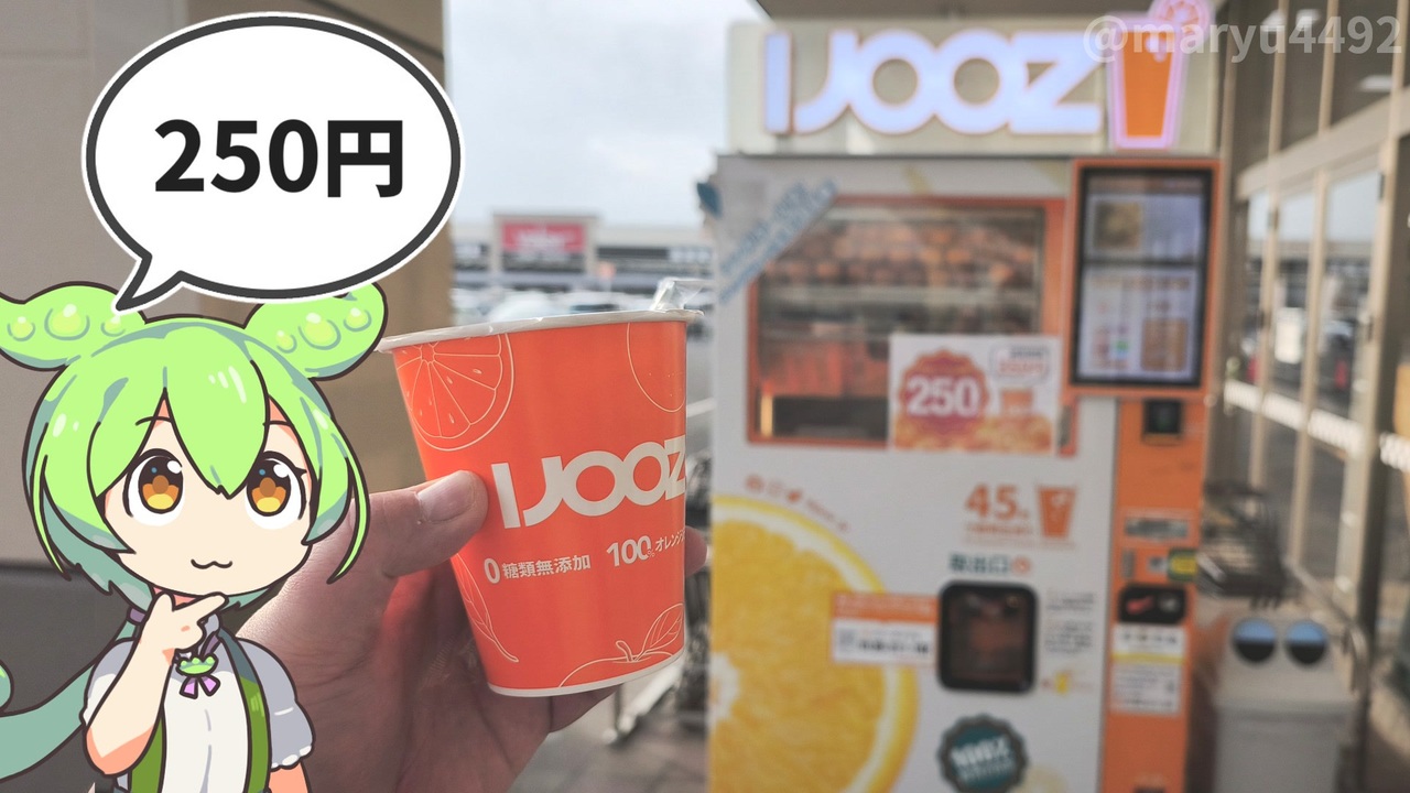 日本全国に設置されだしたオレンジジュースの自動販売機<br>バロー羽島インター店に置かれたものは350円でしたが<br>プロモーション価格として300円になり、更に250円に値下げされていました。<br>このままだと無くなってしまうのではないかと思い<br>久しぶりに買ってみることにしました。<br><br><br><br>【関連動画】<br>日本で急増中の「オレンジジュースの自動販売機」2024.06.08<br><a href="https://www.nicovideo.jp/watch/sm43884709" target="_blank" rel="noopener nofollow">https://www.nicovideo.jp/watch/sm43884709</a><br><br>【参考】<br>【 IJOOZオレンジジュースがバロー羽島インター店に初登場! 】2024.04.30(PR TIMES)<br><a href="https://prtimes.jp/main/html/rd/p/000000086.000121322.html" target="_blank" rel="noopener nofollow">https://prtimes.jp/main/html/rd/p/000000086.000121322.html</a><br>生搾りオレンジジュース自動販売機「IJOOZ」が登場!(NEXCO中日本)<br><a href="https://sapa.c-nexco.co.jp/special?id=1954" target="_blank" rel="noopener nofollow">https://sapa.c-nexco.co.jp/special?id=1954</a><br>【公式X】IJOOZ Japan 生搾りオレンジジュース自販機<br><a href="https://x.com/ijooz_jp" target="_blank" rel="noopener nofollow">https://x.com/ijooz_jp</a><br><br>【使用した素材】(※敬称略)<br>(合成音声)VOICEVOX/ずんだもん/四国めたん<br><a href="https://voicevox.hiroshiba.jp/" target="_blank" rel="noopener nofollow">https://voicevox.hiroshiba.jp/</a><br>(立ち絵)坂本アヒル<br><a href="https://seiga.nicovideo.jp/seiga/m10788496/im10791276" target="_blank" rel="noopener nofollow">https://seiga.nicovideo.jp/seiga/m10788496/im10791276</a><br>(楽曲)甘茶の音楽工房/「日々是好日」「残業戦士」<br><a href="https://amachamusic.chagasi.com" target="_blank" rel="noopener nofollow">https://amachamusic.chagasi.com</a>