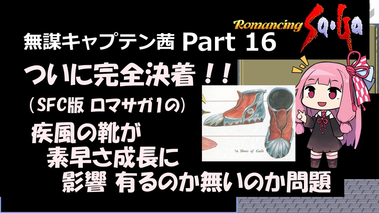 ついに完全決着!疾風の靴が素早さ成長に影響有るのか無いのか問題!(SFC版) <br>ついでにメルビル襲撃阻止! <br><br><br>ボスたすけて と コペルニクス1号を入れられなかったー <br><br>VOICEROID実況でロマサガ1 SFC版をやっていきます。<br>まあまあ普通に無謀キャプテンに。<br><br>前:<a href="https://www.nicovideo.jp/watch/sm45583896" class="watch">sm45583896</a> (Part15前編) <a href="https://www.nicovideo.jp/watch/sm45584300" class="watch">sm45584300</a>(Part15後編)<br>次:<a href="https://www.nicovideo.jp/watch/sm45774907" class="watch">sm45774907</a><br><br>Part1:<a href="https://www.nicovideo.jp/watch/sm44282744" class="watch">sm44282744</a><br>番外編1 ナイトハルト5人連れ回し:<a href="https://www.nicovideo.jp/watch/sm44333247" class="watch">sm44333247</a><br>番外編2 ファミマガ ウル技こぼれ話:<a href="https://www.nicovideo.jp/watch/sm44818928" class="watch">sm44818928</a><br>番外編3 主人公キャラの移動経路まとめ:<a href="https://www.nicovideo.jp/watch/sm45134440" class="watch">sm45134440</a><br><br><br>目標<br>1.アイスソードをガラハドより早く 4本買った(済)(ちょい失敗)+3人旅<br>2.防具は買わない、拾い物・貰い物はOK<br>3.バグ利用はほどほどに、大技林+αぐらい。 <br><br>プレイ環境:レトロフリーク<br><br><br><br><br>検索用<br>ロマンシング サ・ガ<br>ロマンシングサガ<br>ロマンシングサガ1<br>琴葉茜<br>琴葉葵<br>ずんだもん<br>東北イタコ<br><br>一応youtubeにも。<br><a href="https://www.youtube.com/watch?v=o7Gn-FoUypg" target="_blank" rel="noopener nofollow">https://www.youtube.com/watch?v=o7Gn-FoUypg</a>