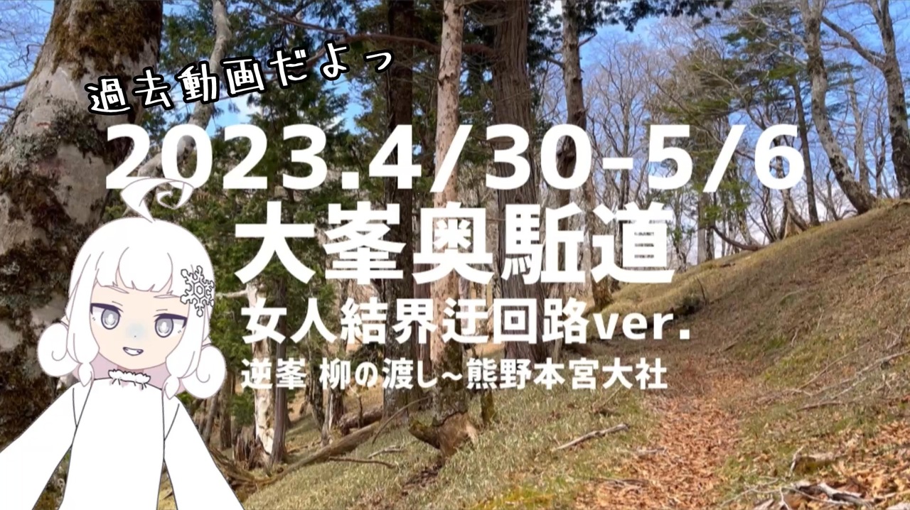 『2023.4/30-5/6 ソロで行く大峯奥駈道』<br><br>4/30(日)<br>吉野駅手前の六田駅で下車して、柳の渡しから出発<br>吉野山へ着いたら旅館に荷物を置いて金峯山寺蔵王堂へ参拝。<br>春の特別ご開帳で、青い蔵王さまに会えた(普段は秘仏で非公開)<br><br>5/1(月)<br>朝5:00に旅館を出発。<br>五番関の女人結界手前で下山。<br>山上ヶ岳方面から法螺貝を吹く音が2回ほど聞こえた。<br>今も伝統が息づく修験の霊場だと感じ、『私が歩いているのは一般登山道ではなく修験の道だから』と納得できた。<br>下山して白川渡キャンプ場へ。<br><br>5/2(火)<br>6:30柏木登山口から再入山。<br>暗くてジメジメした蜘蛛の巣だらけの暗い荒れた森。<br>熊が出るらしく鈴をガンガン振りながら猛スピードで登り、女人結界外の阿弥陀ヶ森分岐へ。<br>稜線上にはチラホラ人もいてホッとする😮💨<br>無事に行者還避難小屋に到着<br><br>5/3(水)<br>6:15行者還避難小屋出発。<br>弥山や八経ヶ岳では『どこに行くの?どこから来たの?』とたくさんの人に話しかけられ、お菓子をいっぱいもらった🍬<br>弥山の山頂でのんびりしすぎて急ぎ気味で深仙宿の小屋へ17:00過ぎに到着。<br>奥駈縦走中のおばさまグループにお茶に誘われて、どんどん周りを巻き込み総勢8人くらいのお茶会に🥳<br><br>5/4(木)<br>明るくなる5:00に深仙の宿を出発。<br>持経の宿でトイレ休憩。<br>普段は無人の避難小屋だが、GW期間中だけ管理人のおじいちゃんがいる。<br>バナナと淹れたての豆から挽いたコーヒーも頂き談笑<br><br>15:00前に行仙宿の小屋へ到着。<br>深仙宿のお茶会メンバーもその後続々到着してみんなで再会を喜ぶ。<br><br>5/5(金)<br>明るくなった5:00に行仙宿の小屋出発。<br>槍ヶ岳-地蔵岳の鎖場の下降は荷物背負って鎖に慣れてないとちょっと大変かも。パワー!<br>12:30玉置神社に到着⛩️<br>参拝して御朱印を頂き、今夜のお宿の駐車場へ。<br><br>深仙宿から顔ぶれが一緒の縦走メンバー7人でまた集合し、夜はお酒を飲んで大宴会。<br> <br>5/6(土)<br>いつも通り5:00出発。<br>七越の峰の公園で休憩していたら朝の散歩のおじいちゃんが夏ミカンを2つくれた。<br>13:30大斎原の河原に到着。<br>目の前の熊野川を見て感極まる。<br>無事に本宮へ参拝できた。<br><br>ヤマレコ:<br><a href="https://www.yamareco.com/modules/yamareco/detail-5472305.html" target="_blank" rel="noopener nofollow">https://www.yamareco.com/modules/yamareco/detail-5472305.html</a><br><br>