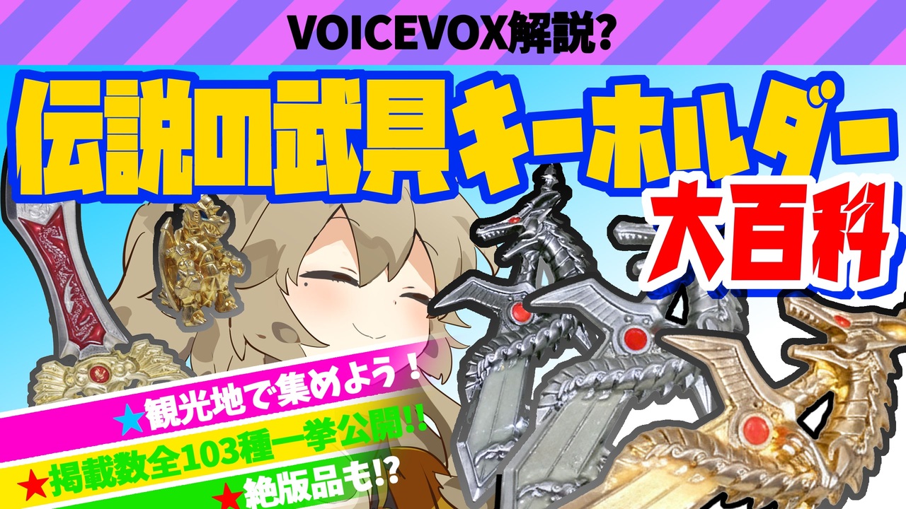 うp主がこれまで集めてきた観光地でよく売られている龍が巻き付いた剣や手裏剣等のキーホルダーをまとめました<br>個人的にコスモスのカプセルトイに因んで伝説の武具と呼称していますが正式名称をご存じの方が居りましたらご教授願います<br><br>調べた結果よくわかりませんでしたのでカタログ的に捉えていただければ幸いです<br><br>【目次】 <br><a href="#" class="seekTime" data-seekTime="0:00" onclick="seekNicoPlayer('#0:00'); return false;">#0:00</a> OP<br><a href="#" class="seekTime" data-seekTime="0:57" onclick="seekNicoPlayer('#0:57'); return false;">#0:57</a> 龍剣【1~29】<br><a href="#" class="seekTime" data-seekTime="6:58" onclick="seekNicoPlayer('#6:58'); return false;">#6:58</a> 幻鬼DRAGON【30~41】<br><a href="#" class="seekTime" data-seekTime="10:18" onclick="seekNicoPlayer('#10:18'); return false;">#10:18</a> 日本刀【42~64】 <br><a href="#" class="seekTime" data-seekTime="14:08" onclick="seekNicoPlayer('#14:08'); return false;">#14:08</a> 変型・合体武具【65~73】 <br><a href="#" class="seekTime" data-seekTime="16:20" onclick="seekNicoPlayer('#16:20'); return false;">#16:20</a> ネタ武具【74~80】<br><a href="#" class="seekTime" data-seekTime="18:10" onclick="seekNicoPlayer('#18:10'); return false;">#18:10</a> リレーフ【81~89】 <br><a href="#" class="seekTime" data-seekTime="19:47" onclick="seekNicoPlayer('#19:47'); return false;">#19:47</a> その他の武具【90~103】<br><br>Youtube高画質版:<a href="https://youtu.be/u1I-Ej1OZDo" target="_blank" rel="noopener nofollow">https://youtu.be/u1I-Ej1OZDo</a><br><br>この動画は以下の素材等のお世話になって作られています<br><br>編集ソフト<br>・ゆっくりMovieMaker4<br>・AviUtl<br>・DaVinci Resolve<br><br>ずんだもん立ち絵<br><br>・坂本アヒル様<br>・ずんだおばけ様<br><a href="https://www.nicovideo.jp/watch/sm40464881" target="_blank" rel="noopener nofollow">https://www.nicovideo.jp/watch/sm40464881</a><br><br>音声素材<br>・ニコニコモンズ<br>・DOVA-SYNDROME<br>・効果音ラボ フォント<br>・FONT FREE<br>・よく訓練された素材屋<br><br><a target="_blank" href="https://qa.nicovideo.jp/faq/show/19424?site_domain=default" style="font-size: 13px;color: #657586; text-decoration: underline; line-height: 1.4">この動画は投稿者によって修正されました</a>