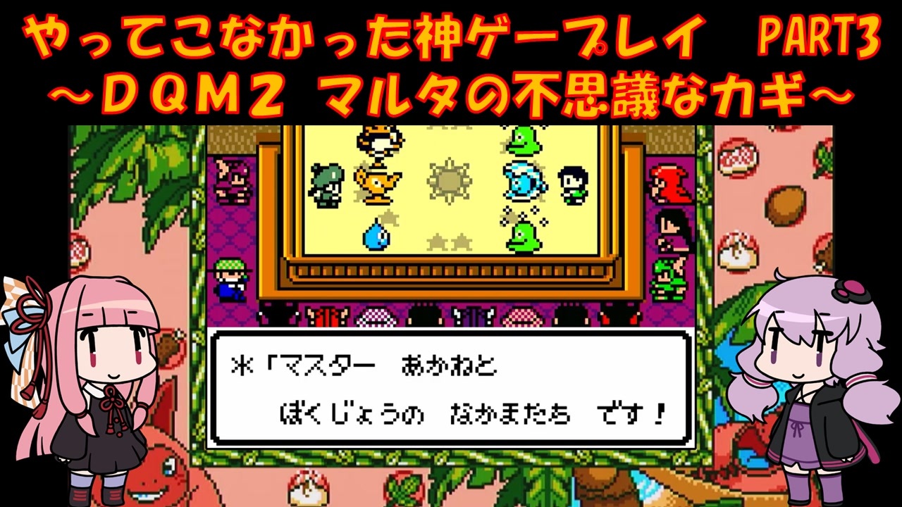 GBC ドラゴンクエストモンスターズ2 マルタの不思議なカギをプレイ<br>ゆかりさんはメジャーじゃないゲームをやる俺カッケー族だったのでドラクエをやったことがありませんでした(DSのⅤ以外)<br><br>茜:子供マスター大会に殴り込みじゃい!<br>ゆ:賞品は我らが頂く!<br><br>PART1:<a href="https://www.nicovideo.jp/watch/sm45684209" target="_blank" rel="noopener nofollow">https://www.nicovideo.jp/watch/sm45684209</a><br><br>各DQシリーズ再生リスト<br><a href="https://garage.nicovideo.jp/niconico-garage/video/series/390298" target="_blank" rel="noopener nofollow">https://garage.nicovideo.jp/niconico-garage/video/series/390298</a><br><br><br>動画内で使用させていただいた素材<br>【イラスト】<br>結月ゆかり→山栗鼠様:<a href="https://seiga.nicovideo.jp/seiga/im5354179" target="_blank" rel="noopener nofollow">https://seiga.nicovideo.jp/seiga/im5354179</a><br>琴葉茜→山栗鼠様:<a href="https://seiga.nicovideo.jp/seiga/im5342445" target="_blank" rel="noopener nofollow">https://seiga.nicovideo.jp/seiga/im5342445</a><br><br>【音声】<br>A.I.Voice:琴葉茜<br><a href="https://aivoice.jp/product/kotonoha/" target="_blank" rel="noopener nofollow">https://aivoice.jp/product/kotonoha/</a><br><br>A.I.Voice:結月ゆかり<br><a href="https://aivoice.jp/product/yukari/" target="_blank" rel="noopener nofollow">https://aivoice.jp/product/yukari/</a><br><br>この動画で利用している株式会社スクウェア・エニックスを代表とする共同著作者が権利を所有する著作物及びスギヤマ工房有限会社が権利を所有する楽曲の転載・配布は禁止いたします。<br>© ARMOR PROJECT/BIRD STUDIO/SQUARE ENIX All Rights Reserved.<br>© SUGIYAMA KOBO