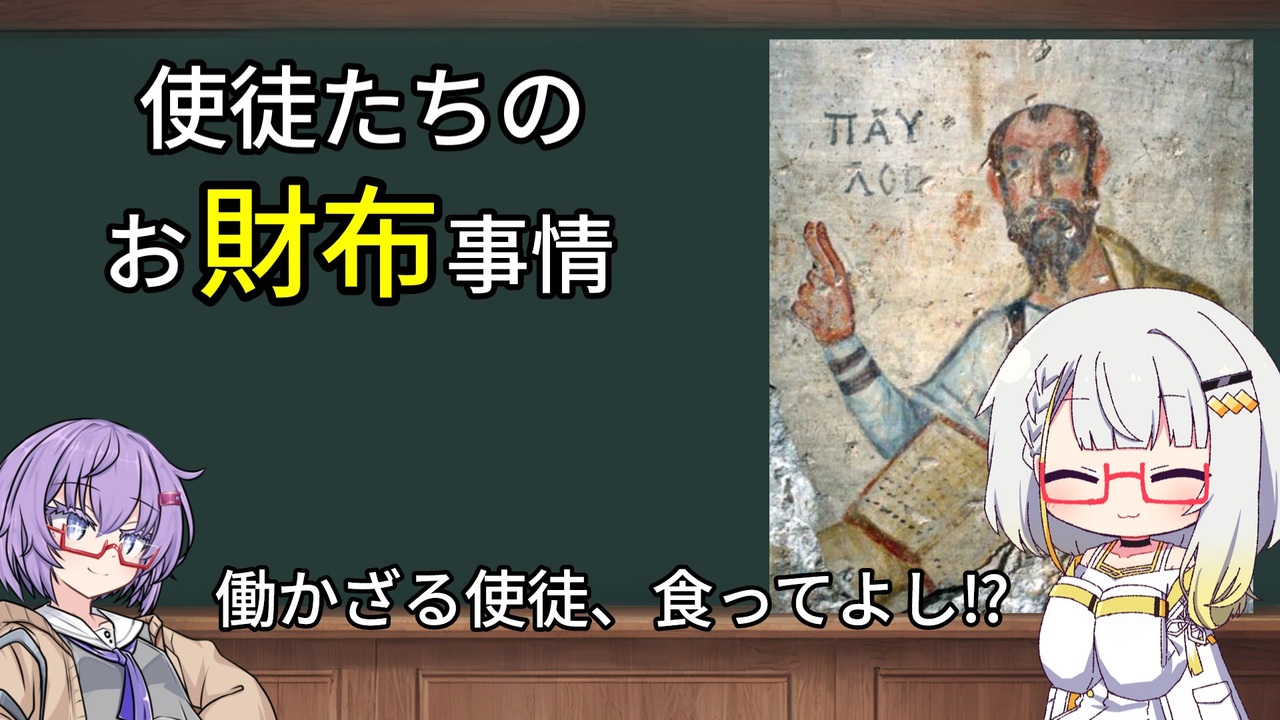 1世紀、世界中にキリスト教を広めた使徒たちは一体どうやってご飯を食べたのでしょうか?<br>この動画では使徒たちの経済事情と使徒を支えた初代教会の制度に迫っていきます。<br><br>聖書は『聖書協会共同訳』より引用<br><br>使用音声 A.I.VOICE2:紡乃世詞音<br> A.I.VOICE2:結月ゆかり<br> A.I.VOICE2:つくよみちゃん<br><br>ドイツ聖書協会ホームページ(ドイツ語、英語、ラテン語、ヘブライ語、ギリシア語などの聖書が読めます)<br><a href="https://www.die-bibel.de/en" target="_blank" rel="noopener nofollow">https://www.die-bibel.de/en</a><br>日本聖書協会ホームページ<br><a href="https://www.bible.or.jp/" target="_blank" rel="noopener nofollow">https://www.bible.or.jp/</a><br>日本聖書協会ホームページ『聖書本文検索』(日本語訳の聖書が読めます)<br><a href="https://www.bible.or.jp/read/vers_search.html" target="_blank" rel="noopener nofollow">https://www.bible.or.jp/read/vers_search.html</a><br><br>参考文献<br>荒井献ほか『使徒教父文書』講談社、1998年<br>旧約新約聖書大事典編集委員会『[縮刷版]旧約新約聖書大事典』教文館、2023年<br>新約聖書翻訳委員会『新約聖書[机上版]』岩波書店、2004年<br>田川建三『新約聖書 訳と註 第三巻』作品社、2007年<br>フェルディナント・ハーン(大貫隆・大友陽子訳)『新約聖書神学Ⅰ上』日本キリスト教団出版局、2006年<br>ゲルト・タイセン(大貫隆訳)『新約聖書─歴史・文学・宗教』教文館、2003年<br>E.P.サンダース(土岐健治・太田修司訳)『パウロ』教文館、1994年