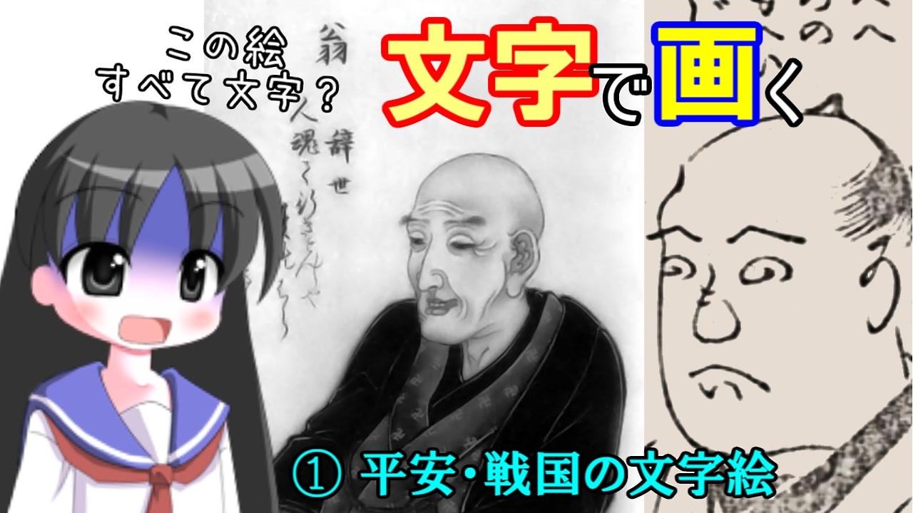 ネットで興味を持ったものを動画にまとめてみました。<br>間違いが多いと思いますが、温かい目で見てください。<br><br>本動画は文字絵の歴史について解説するものです。<br>パート1は文字絵の導入と平安時代の文字絵についてです。<br><br>キャラ絵はキャラクターなんとか機のものを使用しています。<br>(K.Hみっくす ふぁーすとえでぃしょん)<br><a href="http://khmix.sakura.ne.jp/download.shtml" target="_blank" rel="noopener nofollow">http://khmix.sakura.ne.jp/download.shtml</a><br />ーーーーーーーーーーーーーーーーーーーーーー<br>歴史解説動画シリーズ<br><a href="https://www.nicovideo.jp/series/223250" target="_blank" rel="noopener">series/223250</a><br>◎ 日本語はなぜ三種類の文字をつかうのか(三部作)<br>◎ 本当に淀君と呼んではいけないのか<br>◎ 日本最古のアンケートの質問は何か<br>◎ 天正十年、明智光秀が見た天変は何か<br>◎ フランクからフランスに変わったのはいつか(ニ部作)<br>◎ 古代中世近代の時代区分はどう変わってきたのか(六部作)<br>◎ なすの諺の由来はなにか(ニ部作)<br>◎ フランスの尊厳王はイギリス獅子心王のライバル足りえるのか<br>◎ 佐賀滋賀須賀瀬賀蘇我伊賀甲賀<br>◎ なぜ飛鳥・長谷・日下・春日はこう読むのか<br>◎ なぜ日本は車は左側通行なのか<br>◎ 古代中国の様子は漢字からわかるのか(二部作)<br>◎ 気候変化は歴史にどのように関わるのか(三部作)<br>◎ 鎌倉幕府の成立年はいつか<br>◎ 一年の始まりはどのように決まったのか(七部作)<br>◎ 猫は日本史にどのような影響を与えたか(二部作)<br>◎ 本当に日本書紀にそう書いているのか<br>◎ 東洋西洋と太平洋はどう関係するのか(二部作)<br>◎ 騎虎の勢い、下りるを得ず<br>◎ 望遠鏡の歴史はどのようなものか(三部作)<br>◎ どうしてドイツと呼ぶのか(四部作)<br>◎ 南シナ海の白人王国にどうような歴史があるのか<br>◎ 筆記用具の歴史(四部作)<br>◎いろは歌と五十音はどのようにかわったか(五部作)<br>◎ アンティキティラの機械とは何か<br>◎ん、ヴそして濁点はどのようにしてできたのか(二部作)<br>◎曹操と孔明の兵法(四部作)<br>◎槍弓盾の歴史はどのようなものか(三部作)<br>◎シュリーマンは日本に何を見たのか(二部作)<br>ーーーーーーーーーーーーーーーーーーーーーー