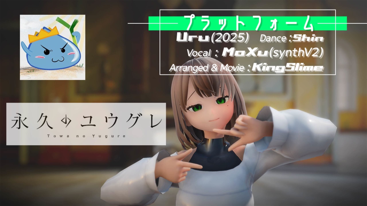 今回はUru様「プラットフォーム」で参加です<br>作品コード 330-1977-1<br><br>2025冬アニメ永久のユウグレOPです。 <br>オケは耳コピしてどちらかといえば少しelectro寄りにしてみました<br>歌はsynthv2MoXuです<br><br>アニメは佳境に入ってきましたね!<br>最終話前に投稿出来てよかった!<br> <br>□お借りしたもの<br><br>●モーション 「ミュージックミュージック」 byリングイネ様 <br>●モデル 「佐間坂心(女)ver.1」 byさあらぬ様 <br>●ステージ 「古びた洋館の広間」 byばんぞく様<br> 他多数エフェクトありがとうございます<br> <br>■X(旧twitter):@KingSlimeP <br>■マイリス:<a href="https://www.nicovideo.jp/mylist/25775015" target="_blank" rel="noopener">mylist/25775015</a>