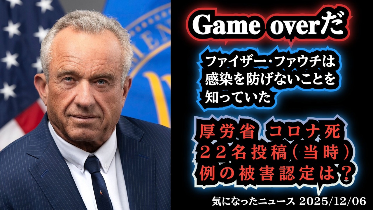 ◆「ゲームオーバー」RFKジュニアの証言、ワクチンに感染予防効果が無かったことをファイザーは最初から知っていた?◆厚労省コロナ死22名は投稿するのにワクチンは…<br><br>あらすじ<br>多くの議論を呼ぶ“ゲームオーバー”発言の背景で、いま再び注目が集まっています。RFKジュニアが語ったのは、ワクチンの市場投入よりも前に判明していたという「ある実験結果」。さらに国内では、厚労省の死亡関連データの扱いをめぐる差に問題が静かに波紋を広げています。。<br><br><br>◆今回の台本&詳細<a href="https://keiichiro8140.hatenablog.com/entry/25120666222" target="_blank" rel="noopener nofollow">https://keiichiro8140.hatenablog.com/entry/25120666222</a><br><br>◆これまでの動画<a href="https://x.gd/sPXoJ" target="_blank" rel="noopener nofollow">https://x.gd/sPXoJ</a><br><br>◆もしも(BAN)の時のためのマイリンク集<a href="https://lit.link/K-16_News44" target="_blank" rel="noopener nofollow">https://lit.link/K-16_News44</a><br><br>ご覧いただきありがとうございます<br>m(_ _)m<br>気になったニュース 2025/12/06<br><br />著作権、肖像権に配慮して作成しております。<br><br>◆気になったニュースの台本!?<br>メモ代わりに作った台本をそのままあげてます<br><a href="https://keiichiro8140.hatenablog.com/." target="_blank" rel="noopener nofollow">https://keiichiro8140.hatenablog.com/.</a><br><br><br>ここからはシリーズ紹介<br><br><br>◆ ワクチン解毒・デトックス<br><a href="https://x.gd/fZweg" target="_blank" rel="noopener nofollow">https://x.gd/fZweg</a><br><br>◆ウイリアム・マキス博士のがん治療(イベルメクチン・フェンベンダゾール等)<br><a href="https://x.gd/AtFYS" target="_blank" rel="noopener nofollow">https://x.gd/AtFYS</a><br><br>◆予防接種健康被害救済制度<br><a href="https://x.gd/0xK9x" target="_blank" rel="noopener nofollow">https://x.gd/0xK9x</a><br><br>◆気になったニュース #1501~<br><br>◆ 【ショートver】気になったニュース<br><a href="https://x.gd/7MxXC" target="_blank" rel="noopener nofollow">https://x.gd/7MxXC</a><br><br>◆ 気になったニュース #1001~<br><a href="https://x.gd/Lp8gv" target="_blank" rel="noopener nofollow">https://x.gd/Lp8gv</a><br><br>◆ 気になったニュース #501~<br><a href="https://x.gd/EmbS4" target="_blank" rel="noopener nofollow">https://x.gd/EmbS4</a><br><br>◆ 気になったニュース #1~#500<br><a href="https://x.gd/uPhNb" target="_blank" rel="noopener nofollow">https://x.gd/uPhNb</a><br><br>◆ X(旧Twitter)・テレグラムで気になった情報<br><a href="https://x.gd/YG6FT" target="_blank" rel="noopener nofollow">https://x.gd/YG6FT</a><br><br>◆ 日比谷5万人パレードデ⚪生放送アーカイブ動画<br><a href="https://x.gd/3CHJv" target="_blank" rel="noopener nofollow">https://x.gd/3CHJv</a><br><br>◆日比谷5万人パレード⚪モのマイリスト作ってみました<br><a href="https://nico.ms/mylist/76828848?ref=sp_other" target="_blank" rel="noopener nofollow">https://nico.ms/mylist/76828848?ref=sp_other</a><br><br>◆3.30 令和の百姓⚪⚪<br><a href="https://www.nicovideo.jp/series/511791?ref=garage_share_other" target="_blank" rel="noopener nofollow">https://www.nicovideo.jp/series/511791?ref=garage_share_other</a><br><br>◆ 及川幸久さんの【XNEWS】シリーズ<br><a href="https://x.gd/3k78K" target="_blank" rel="noopener nofollow">https://x.gd/3k78K</a><br><br>◆これまでの動画<a href="https://x.gd/sPXoJ" target="_blank" rel="noopener nofollow">https://x.gd/sPXoJ</a><br><br>◆もしも(BAN)の時のためのマイリンク集<a href="https://lit.link/K-16_News44" target="_blank" rel="noopener nofollow">https://lit.link/K-16_News44</a><br><br>