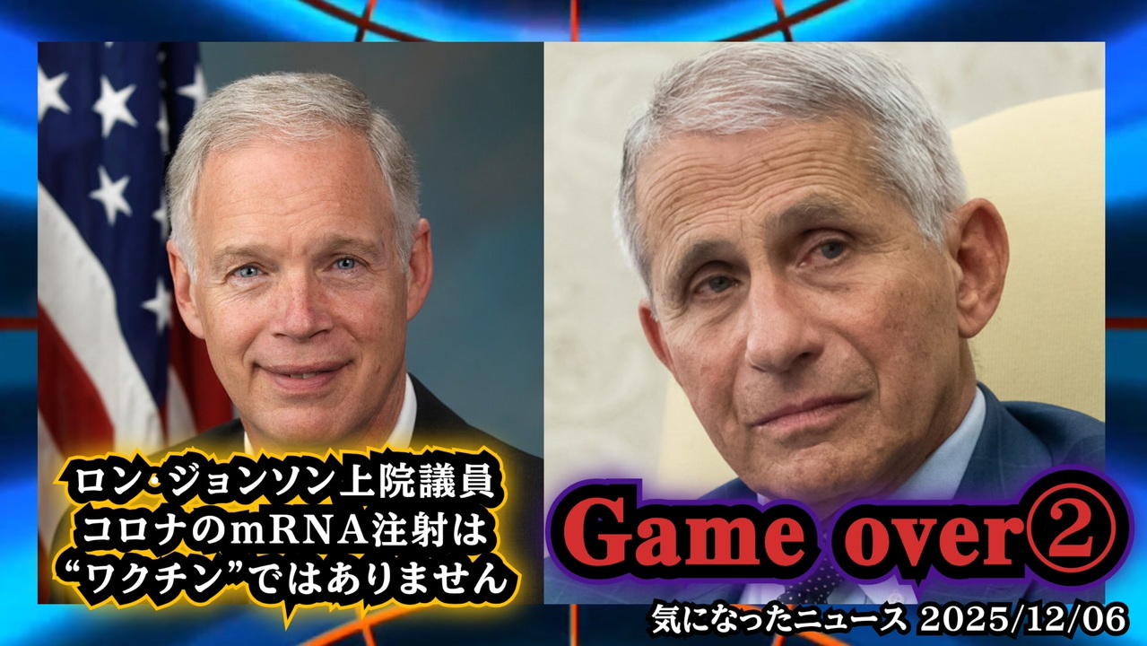 ◆「ゲームオーバー❷」ロン・ジョンソン上院議員『コロナのmRNA注射は“ワクチン”ではありません。これはあなたの身体を破壊するように設計された“遺伝子改変療法”です』<br><br>あらすじ<br>世界的に議論が続くmRNAワクチン。その根本構造について、アメリカで長年医療政策を追ってきた上院議員が、これまで語られてこなかった視点から踏み込んだ指摘を行いました。自然のmRNAとはまったく異なる“修飾mRNA”。そして、通常は通り抜けにくいバリアさえ突破できる特別な仕組み――。なぜ、そんな仕様が必要だったのか。誰がそれを推し進め、どこまで理解していたのか。今回取り上げるのは、政治・医療・規制の境界線に関わる重要な発言です。<br><br>◆今回の台本&詳細<a href="https://keiichiro8140.hatenablog.com/entry/25120666333999" target="_blank" rel="noopener nofollow">https://keiichiro8140.hatenablog.com/entry/25120666333999</a><br><br>◆これまでの動画<a href="https://x.gd/sPXoJ" target="_blank" rel="noopener nofollow">https://x.gd/sPXoJ</a><br><br>◆もしも(BAN)の時のためのマイリンク集<a href="https://lit.link/K-16_News44" target="_blank" rel="noopener nofollow">https://lit.link/K-16_News44</a><br><br>ご覧いただきありがとうございます<br>m(_ _)m<br>気になったニュース 2025/12/06<br><br>写真:「U.S. Senator Ron Johnson of Wisconsin」<br>撮影:Gage Skidmore<br>ライセンス:CC BY-SA 2.0<br>出典:<a href="https://commons.wikimedia.org/wiki/File:Ron_Johnson_(24967532993).jpg" target="_blank" rel="noopener nofollow">https://commons.wikimedia.org/wiki/File:Ron_Johnson_(24967532993).jpg</a><br><br>(本作品では原著作物を改変して利用しています。)<br><br />著作権、肖像権に配慮して作成しております。<br><br>◆気になったニュースの台本!?<br>メモ代わりに作った台本をそのままあげてます<br><a href="https://keiichiro8140.hatenablog.com/." target="_blank" rel="noopener nofollow">https://keiichiro8140.hatenablog.com/.</a><br><br><br>ここからはシリーズ紹介<br><br><br>◆ ワクチン解毒・デトックス<br><a href="https://x.gd/fZweg" target="_blank" rel="noopener nofollow">https://x.gd/fZweg</a><br><br>◆ウイリアム・マキス博士のがん治療(イベルメクチン・フェンベンダゾール等)<br><a href="https://x.gd/AtFYS" target="_blank" rel="noopener nofollow">https://x.gd/AtFYS</a><br><br>◆予防接種健康被害救済制度<br><a href="https://x.gd/0xK9x" target="_blank" rel="noopener nofollow">https://x.gd/0xK9x</a><br><br>◆気になったニュース #1501~<br><br>◆ 【ショートver】気になったニュース<br><a href="https://x.gd/7MxXC" target="_blank" rel="noopener nofollow">https://x.gd/7MxXC</a><br><br>◆ 気になったニュース #1001~<br><a href="https://x.gd/Lp8gv" target="_blank" rel="noopener nofollow">https://x.gd/Lp8gv</a><br><br>◆ 気になったニュース #501~<br><a href="https://x.gd/EmbS4" target="_blank" rel="noopener nofollow">https://x.gd/EmbS4</a><br><br>◆ 気になったニュース #1~#500<br><a href="https://x.gd/uPhNb" target="_blank" rel="noopener nofollow">https://x.gd/uPhNb</a><br><br>◆ X(旧Twitter)・テレグラムで気になった情報<br><a href="https://x.gd/YG6FT" target="_blank" rel="noopener nofollow">https://x.gd/YG6FT</a><br><br>◆ 日比谷5万人パレードデ⚪生放送アーカイブ動画<br><a href="https://x.gd/3CHJv" target="_blank" rel="noopener nofollow">https://x.gd/3CHJv</a><br><br>◆日比谷5万人パレード⚪モのマイリスト作ってみました<br><a href="https://nico.ms/mylist/76828848?ref=sp_other" target="_blank" rel="noopener nofollow">https://nico.ms/mylist/76828848?ref=sp_other</a><br><br>◆3.30 令和の百姓⚪⚪<br><a href="https://www.nicovideo.jp/series/511791?ref=garage_share_other" target="_blank" rel="noopener nofollow">https://www.nicovideo.jp/series/511791?ref=garage_share_other</a><br><br>◆ 及川幸久さんの【XNEWS】シリーズ<br><a href="https://x.gd/3k78K" target="_blank" rel="noopener nofollow">https://x.gd/3k78K</a><br><br>◆これまでの動画<a href="https://x.gd/sPXoJ" target="_blank" rel="noopener nofollow">https://x.gd/sPXoJ</a><br><br>◆もしも(BAN)の時のためのマイリンク集<a href="https://lit.link/K-16_News44" target="_blank" rel="noopener nofollow">https://lit.link/K-16_News44</a><br><br>