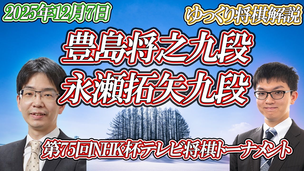 ▼概要 棋戦 :第75回NHK杯テレビ将棋トーナメント 公開日時:2025年12月7日 主催 :NHK 日本将棋連盟 ▼対局者 先手:豊島将之九段 後手:永瀬拓矢九段