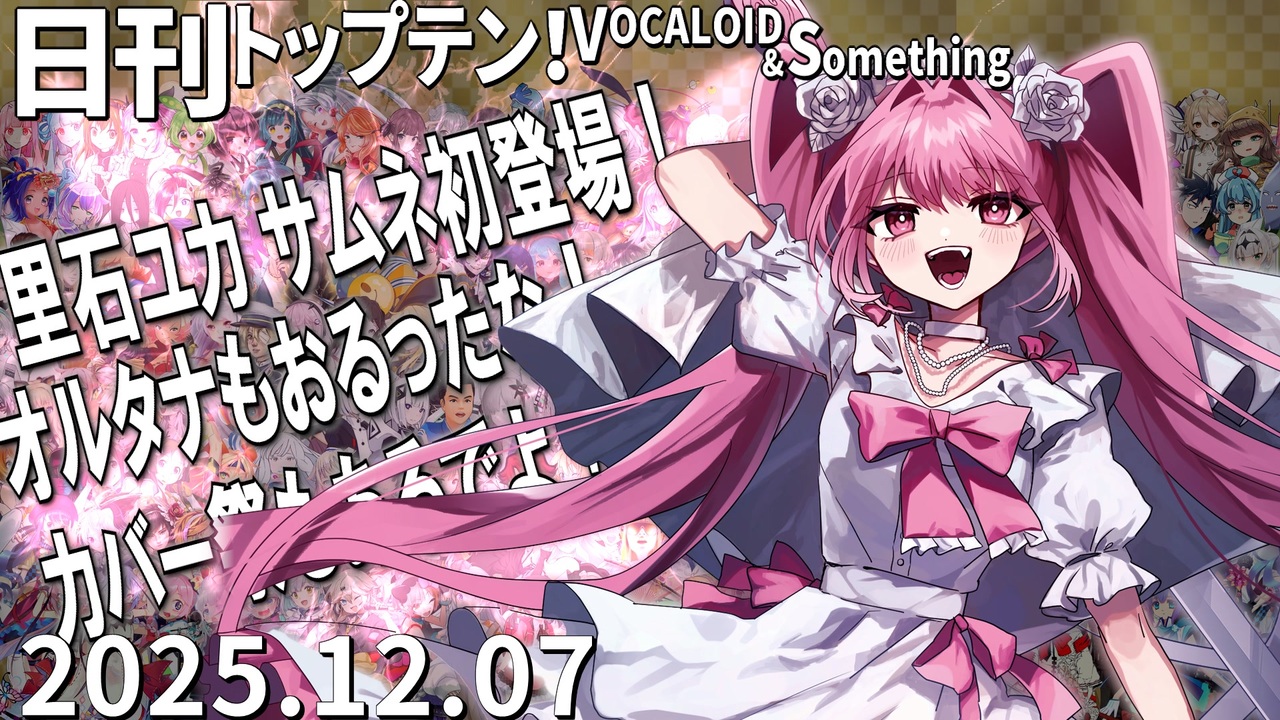 前日(12/6)←<a href="https://www.nicovideo.jp/watch/sm45702951" class="watch">sm45702951</a> <a href="https://www.nicovideo.jp/watch/sm45711136" class="watch">sm45711136</a>→翌日(12/8)<br>★クリエイター向けの生・動画企画「Pの一選」 <a href="https://nikeya.hateblo.jp/entry/20251125/1764078701" target="_blank" rel="noopener nofollow">https://nikeya.hateblo.jp/entry/20251125/1764078701</a><br>エントリー受付中!28日まで<br><br>★トップテン<br>10:<a href="https://www.nicovideo.jp/watch/sm45665089" class="watch">sm45665089</a> 9:<a href="https://www.nicovideo.jp/watch/sm45670887" class="watch">sm45670887</a> 8:<a href="https://www.nicovideo.jp/watch/sm45695802" class="watch">sm45695802</a> 7:<a href="https://www.nicovideo.jp/watch/sm45694872" class="watch">sm45694872</a> <br>6:<a href="https://www.nicovideo.jp/watch/sm45696730" class="watch">sm45696730</a> 5:<a href="https://www.nicovideo.jp/watch/sm45691215" class="watch">sm45691215</a> 4:<a href="https://www.nicovideo.jp/watch/sm45694087" class="watch">sm45694087</a> 3:<a href="https://www.nicovideo.jp/watch/sm45697215" class="watch">sm45697215</a> 2:<a href="https://www.nicovideo.jp/watch/sm45700582" class="watch">sm45700582</a> 1:<a href="https://www.nicovideo.jp/watch/sm45696741" class="watch">sm45696741</a> <br><br>★ピックアップ(B~おは超新着枠)<br>B:<a href="https://www.nicovideo.jp/watch/sm45599865" class="watch">sm45599865</a> C:<a href="https://www.nicovideo.jp/watch/sm45697319" class="watch">sm45697319</a> D:<a href="https://www.nicovideo.jp/watch/sm45700533" class="watch">sm45700533</a> E:<a href="https://www.nicovideo.jp/watch/sm45698278" class="watch">sm45698278</a> F:<a href="https://www.nicovideo.jp/watch/sm45691723" class="watch">sm45691723</a> G:<a href="https://www.nicovideo.jp/watch/sm45700186" class="watch">sm45700186</a> <br>H:<a href="https://www.nicovideo.jp/watch/sm45700935" class="watch">sm45700935</a> I:<a href="https://www.nicovideo.jp/watch/sm45701047" class="watch">sm45701047</a> J:<a href="https://www.nicovideo.jp/watch/sm45698028" class="watch">sm45698028</a> K:<a href="https://www.nicovideo.jp/watch/sm45700096" class="watch">sm45700096</a> L:<a href="https://www.nicovideo.jp/watch/sm45698952" class="watch">sm45698952</a> M:<a href="https://www.nicovideo.jp/watch/sm45696703" class="watch">sm45696703</a> <br>N:<a href="https://www.nicovideo.jp/watch/sm45647450" class="watch">sm45647450</a> O:<a href="https://www.nicovideo.jp/watch/sm45695537" class="watch">sm45695537</a> P:<a href="https://www.nicovideo.jp/watch/sm45698454" class="watch">sm45698454</a> Q:<a href="https://www.nicovideo.jp/watch/sm45687387" class="watch">sm45687387</a> R:<a href="https://www.nicovideo.jp/watch/sm45694870" class="watch">sm45694870</a> S:<a href="https://www.nicovideo.jp/watch/sm45698397" class="watch">sm45698397</a> <br>T:<a href="https://www.nicovideo.jp/watch/sm45694322" class="watch">sm45694322</a> U:<a href="https://www.nicovideo.jp/watch/sm45695390" class="watch">sm45695390</a> V:<a href="https://www.nicovideo.jp/watch/sm45686014" class="watch">sm45686014</a> W:<a href="https://www.nicovideo.jp/watch/sm45698896" class="watch">sm45698896</a> X:<a href="https://www.nicovideo.jp/watch/sm45692786" class="watch">sm45692786</a> Y:<a href="https://www.nicovideo.jp/watch/sm45679570" class="watch">sm45679570</a> <br>Z:<a href="https://www.nicovideo.jp/watch/sm45681023" class="watch">sm45681023</a> あ:<a href="https://www.nicovideo.jp/watch/sm45692093" class="watch">sm45692093</a> い:<a href="https://www.nicovideo.jp/watch/sm45698813" class="watch">sm45698813</a> う:<a href="https://www.nicovideo.jp/watch/sm45691691" class="watch">sm45691691</a> え:<a href="https://www.nicovideo.jp/watch/sm45669344" class="watch">sm45669344</a> お:<a href="https://www.nicovideo.jp/watch/sm45685601" class="watch">sm45685601</a> <br>か:<a href="https://www.nicovideo.jp/watch/sm45679942" class="watch">sm45679942</a> き:<a href="https://www.nicovideo.jp/watch/sm45695213" class="watch">sm45695213</a> く:<a href="https://www.nicovideo.jp/watch/sm45683079" class="watch">sm45683079</a> け:<a href="https://www.nicovideo.jp/watch/sm45681086" class="watch">sm45681086</a> こ:<a href="https://www.nicovideo.jp/watch/sm45680158" class="watch">sm45680158</a> <br>さ:<a href="https://www.nicovideo.jp/watch/sm45691412" class="watch">sm45691412</a> し:<a href="https://www.nicovideo.jp/watch/sm45681429" class="watch">sm45681429</a> す:<a href="https://www.nicovideo.jp/watch/sm45681196" class="watch">sm45681196</a> せ:<a href="https://www.nicovideo.jp/watch/sm45678718" class="watch">sm45678718</a> そ:<a href="https://www.nicovideo.jp/watch/sm45678352" class="watch">sm45678352</a> <br><br><br>★プレイバック <br>A(1年前):<a href="https://www.nicovideo.jp/watch/sm44401085" class="watch">sm44401085</a> 十(10年前):<a href="https://www.nicovideo.jp/watch/sm27745709" class="watch">sm27745709</a> 前日の第1位: <a href="https://www.nicovideo.jp/watch/sm45697129" class="watch">sm45697129</a>(里石ユカ)<br><br>☆集計対象:2025/11/30~12/7 5時投稿の作品(12/7 5時集計)<br>★計算式:再生×1+コメント×最大12+いいね!×14+マイリスト×13<br>☆プレイリスト:<u><a href="https://nikkantop10.hatenablog.com/entry/ar20251207" target="_blank" rel="noopener nofollow">https://nikkantop10.hatenablog.com/entry/ar20251207</a></u> 、 <a href="https://www.nicovideo.jp/mylist/49271984" target="_blank" rel="noopener">mylist/49271984</a> <br>★1年前トップテン:<a href="https://www.nicovideo.jp/watch/sm44408791" class="watch">sm44408791</a><br />★日刊トップテン動画一覧マイリスト:<a href="https://www.nicovideo.jp/mylist/47849908" target="_blank" rel="noopener">mylist/47849908</a><br>☆ルールや計算式の詳細:<a href="https://nikkantop10-sub.hatenablog.com/entry/top10_rule" target="_blank" rel="noopener nofollow">https://nikkantop10-sub.hatenablog.com/ent