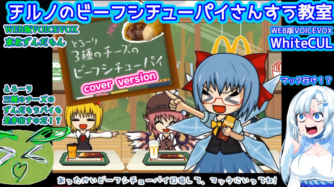 McDonald Japan <br><br>12月3日より、期間限定発売!<br><br>三種のチーズのビーフシチューパイ<br><br>CMテーマソング<br><br>チルノのビーフシチューパイさんすう教室<br><br>原作:東方紅魔郷(上海アリス幻樂団)<br>原曲:おてんば恋娘<br>作曲:ZUN<br>Arrangement : ARM<br>Lyrics : 夕野ヨシミ<br>Vocal : miko<br>Voice : quim<br>Movie : 宇田てとら<br><br>本動画は「東方ProJect」を原作とした<br>二次創作作品です。<br><br>「東方ProJect』び関連タイトルは上海アリス幻樂団の著作物です。<br><br>【X】 夕野ヨシミ(IOSYS)様ホーム @shatyou より引用致しました<br><br>↓X ポスト<br><br><a href="https://x.com/shatyou/status/1996146332202062142?s=20" target="_blank" rel="noopener nofollow">https://x.com/shatyou/status/1996146332202062142?s=20</a><br><br><br><br>けいえむ (K.M) 様制作<br><br>【オーケストラアレンジ】<br><br>みんなー!チーズが3種になったピーフシチューパイ、<br>はじまるよー!<br>【マクドナルドのパーフェクトさんすう教室】<br><br>↓ニコニコ動画<br><br><a href="https://www.nicovideo.jip/watch/sm45691307" target="_blank" rel="noopener nofollow">https://www.nicovideo.jip/watch/sm45691307</a><br><br><br><br><br><br><br>爆乳万歳党 様作画<br><br>拒絶する雪さん<br><br>↓ニコニコ静画<br><br><a href="https://seiga.nicovideo.jp/seiga/im11562226" target="_blank" rel="noopener nofollow">https://seiga.nicovideo.jp/seiga/im11562226</a><br>